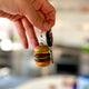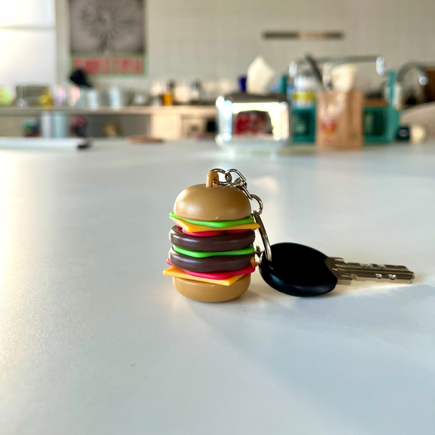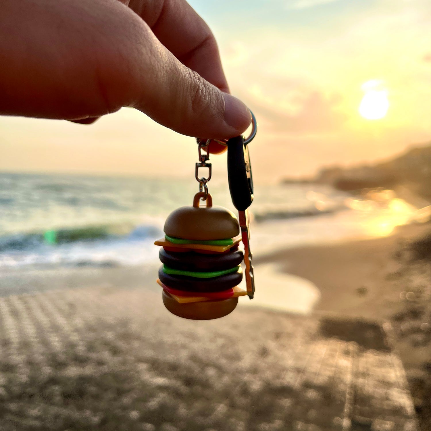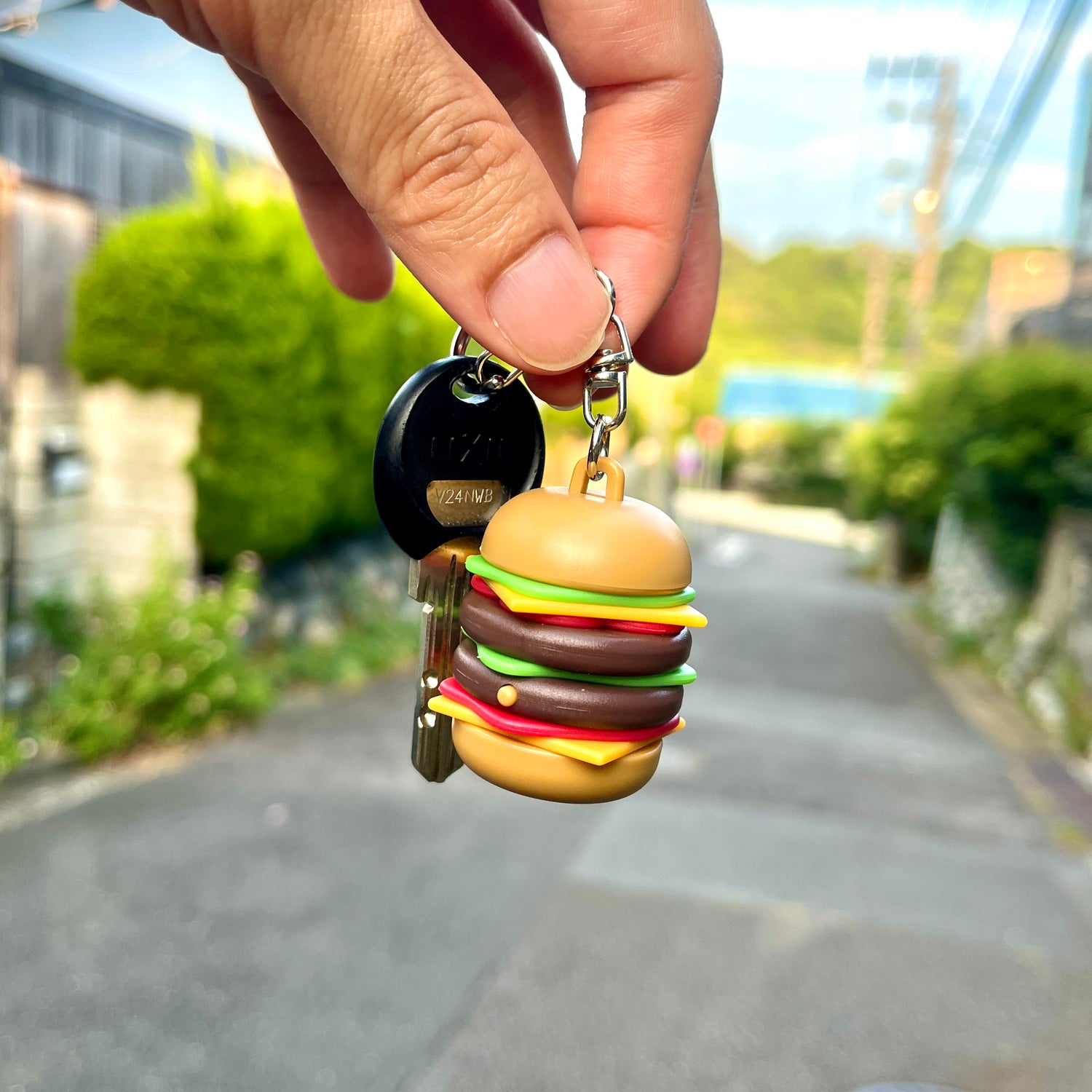 ボタンを押すと満腹そうなゲップの音が鳴る、 思わずかぶりつきたくなるダブルパティのハンバーガーキーリング。なんともアメリカンなビッグサイズのハンバーガーが美味しそうで、鍵やバッグに取り付ければアクセントとして目を惹くポップでアイコンになるデザイン。いろんなモチーフのキーリングと一緒にジャラジャラ付けるのもおすすめ。下のパティ部分のボタンを押せば、ボリュームたっぷりのバーガーを食べて満足したことがわかるはず。