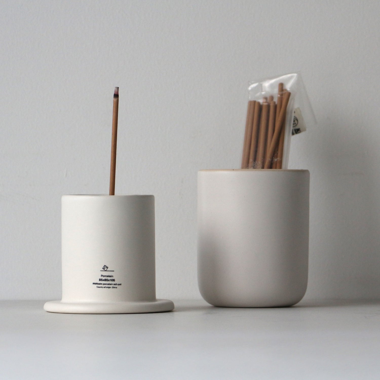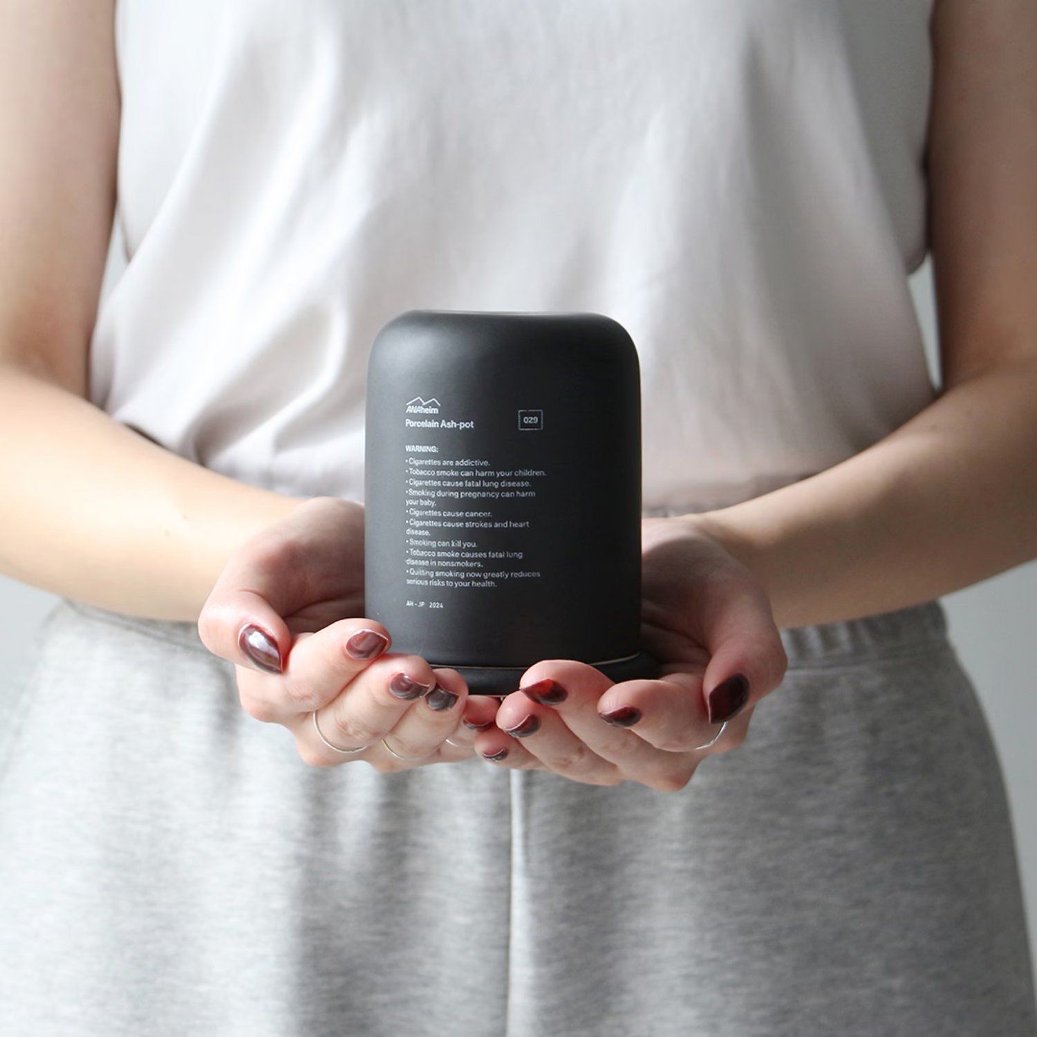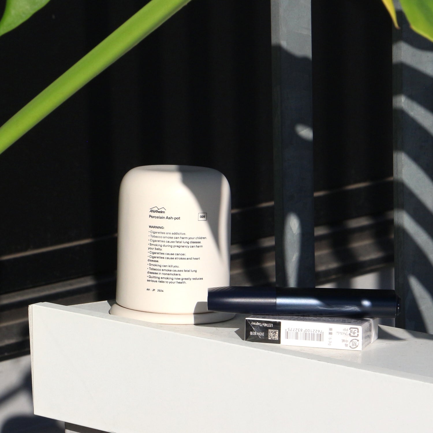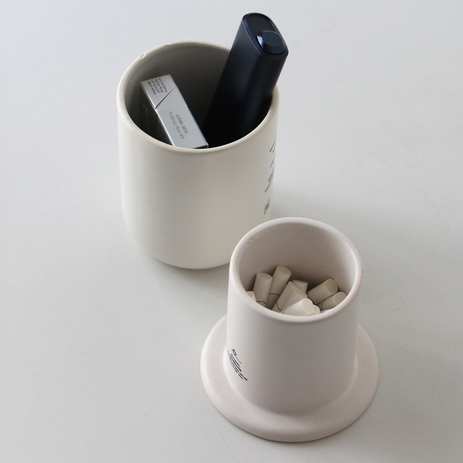 特徴的なのは、まず灰皿に見えない洗練されたデザインと使い勝手。縦長のフォルムは場所を取らずコンパクトながら、吸い終わったアイコスのスティックであれば約40本入るたっぷりの収納力。 筒状の本体と、ドーム型の蓋のパーツに分かれており、蓋部分にはアイコスの本体とタバコの箱がすっぽり入り、本体と組み合わせない使い方もOKです。 本体と蓋を重ねることで吸い殻を隠せるのはもちろん、匂いが漏れにくく、磁器製で程よい重さがあるので屋外に置いても吸い殻が風で飛んでいくことも防ぐことができます。タバコを吸わない方への配慮にもなるこの灰皿は、愛煙家の家族やパートナーへのプレゼントにもおすすめです。 シンプルな構造とスタイリッシュなデザインは、リビングや寝室ではお香・インセンスのスタンドや、デスク周りではペンスタンドとして、バスルームでは綿棒やコスメ収納など、様々なシーンでも使用OKなインテリア性の高いプロダクトです。