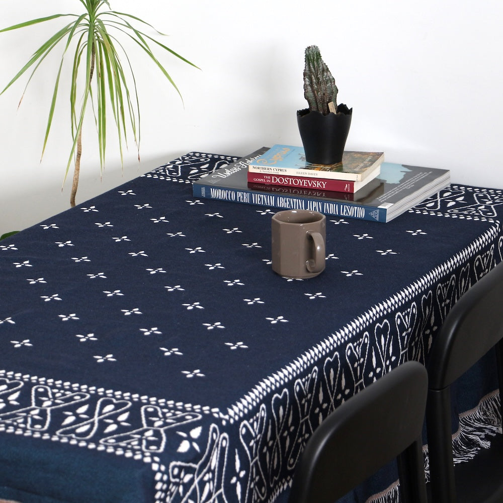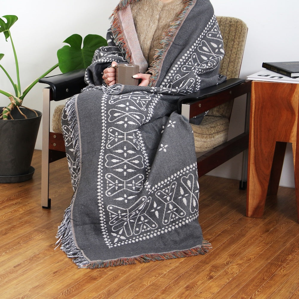 70~80年代に見られたクロス柄、ペイズリー柄を取り入れた、大判サイズのスローケット。約150×150cmのゆとりあるサイズで、ブランケットとして羽織るほか、ソファやベッドカバー、ラグマット、テーブルクロス、タペストリーとしても活躍します。洗濯可能な素材でお手入れもしやすく、室内のインテリアはもちろん、ピクニックやビーチシートとして屋外でも使えるマルチユース仕様。季節を問わず使える、実用性とデザイン性を兼ね備えたスローケットです。