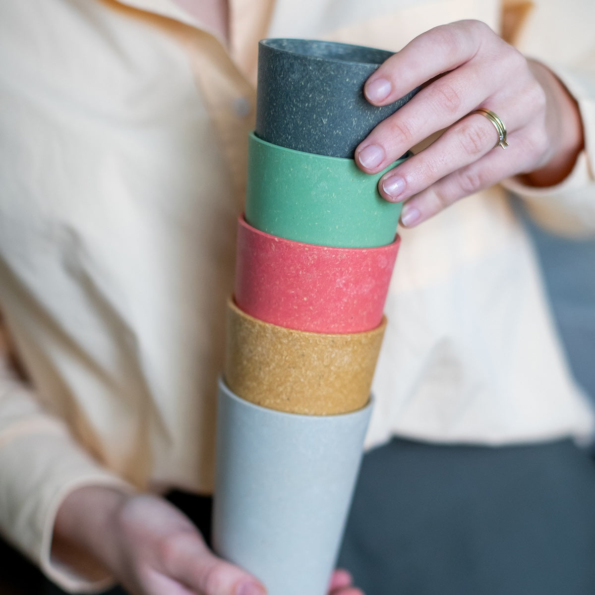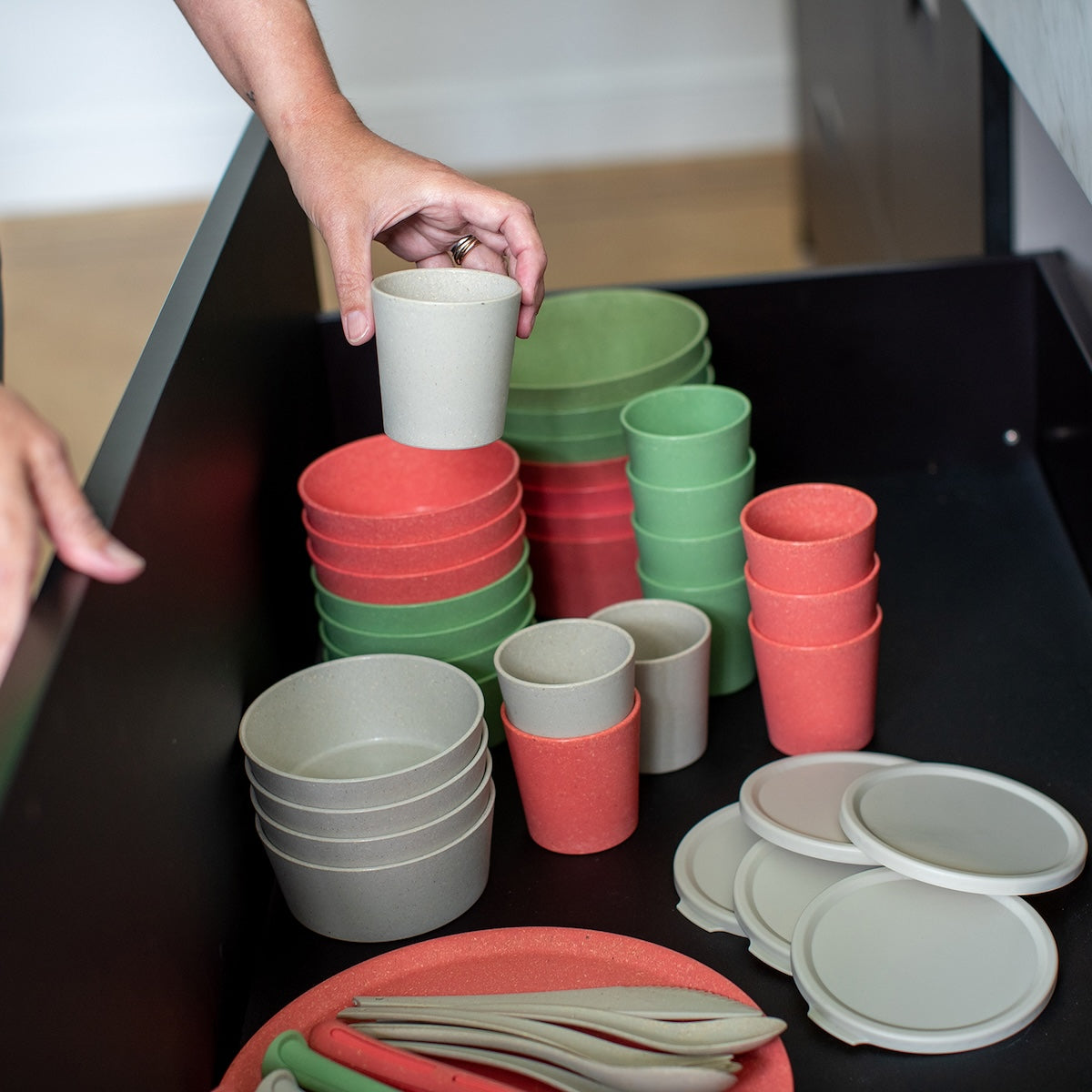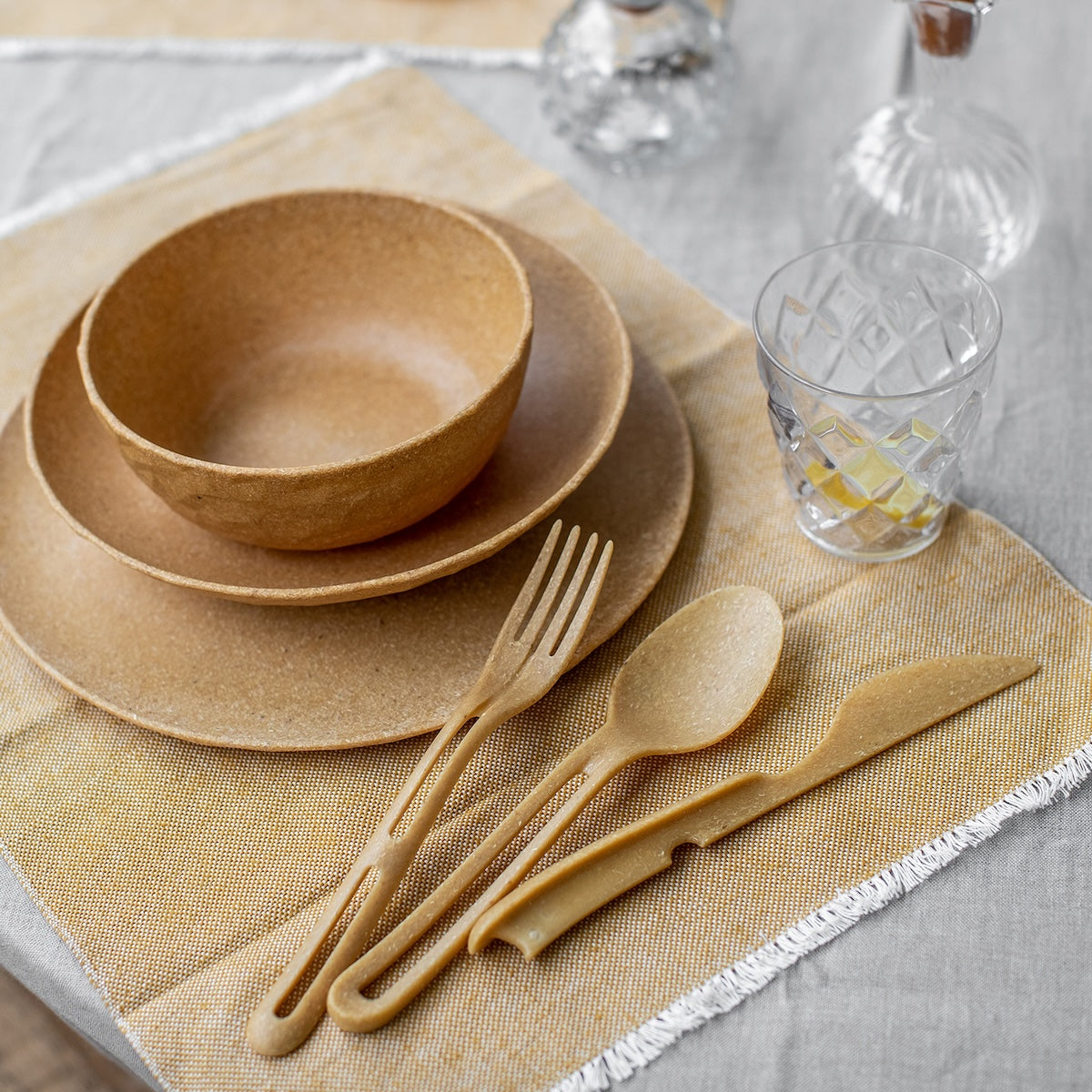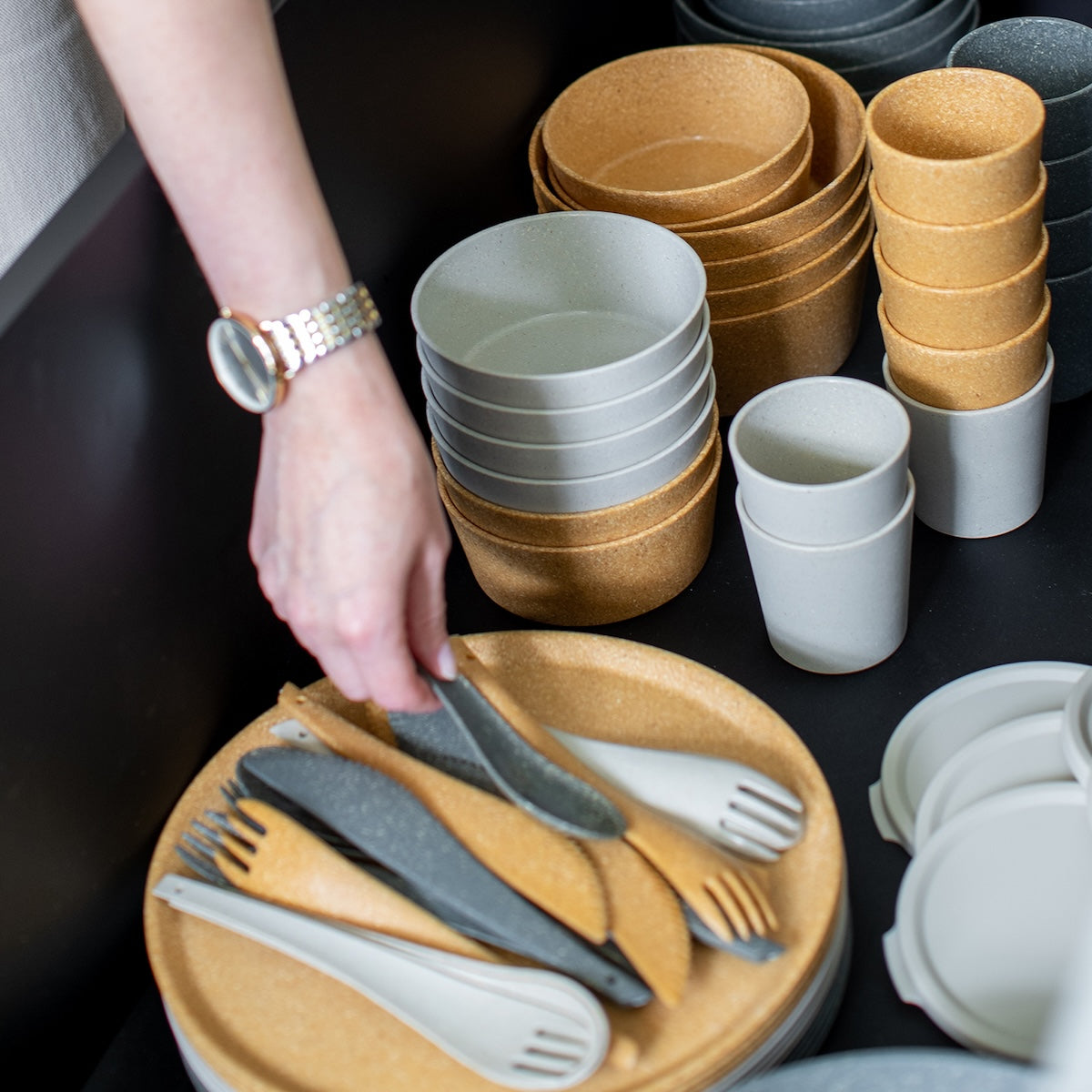 「バイオサーキュラー素材」は、100%ナチュラルの革新的な新素材です。バイオサーキュラー素材は、断熱性などの木材の特性とナチュラルな質感、そして熱可塑性プラスチックの弾力性と軽さを兼ね備えています。高い耐久性で傷付きにくく非常に丈夫で長持ちします。使用している素材には、メラミン、BPA、竹は含まれていません。
