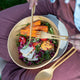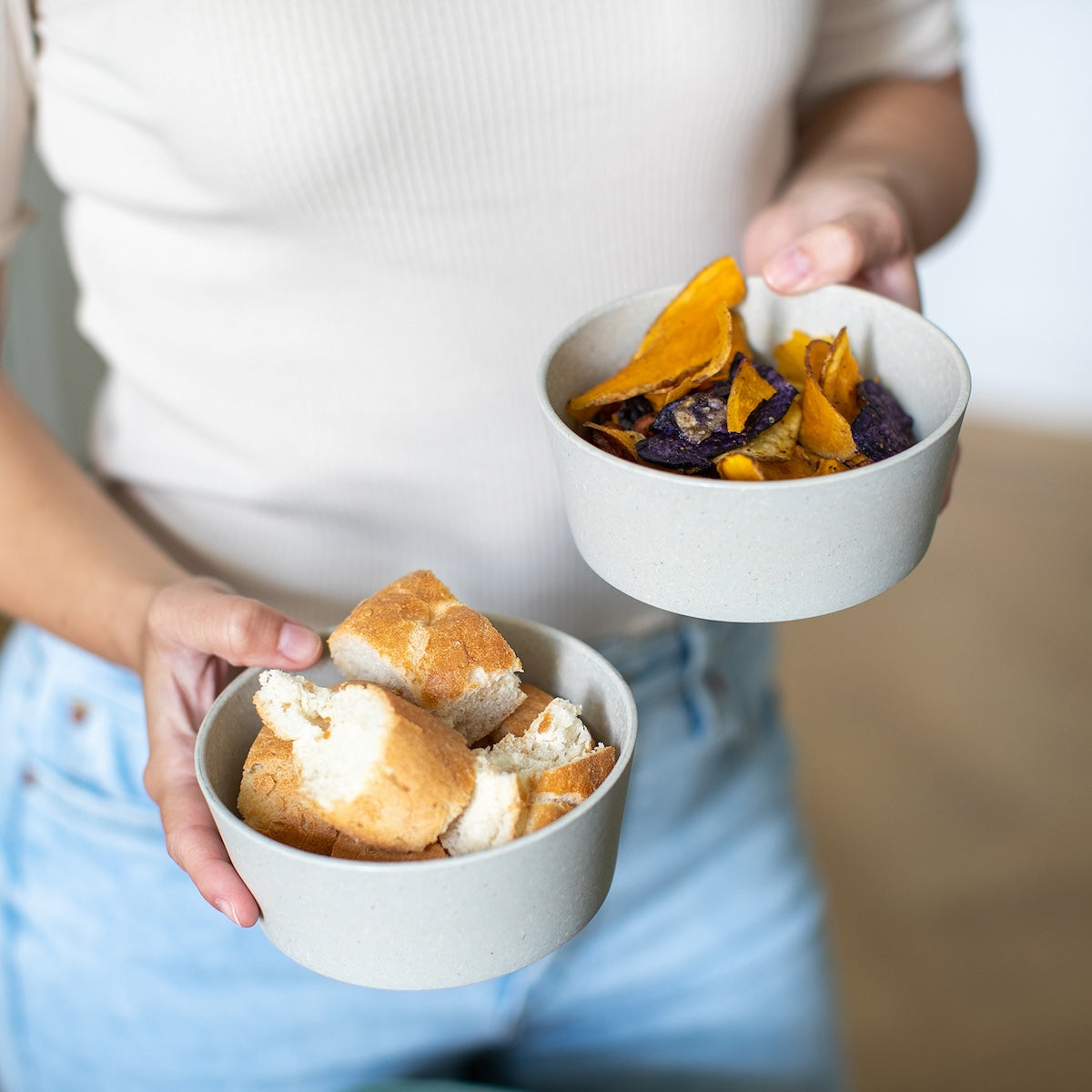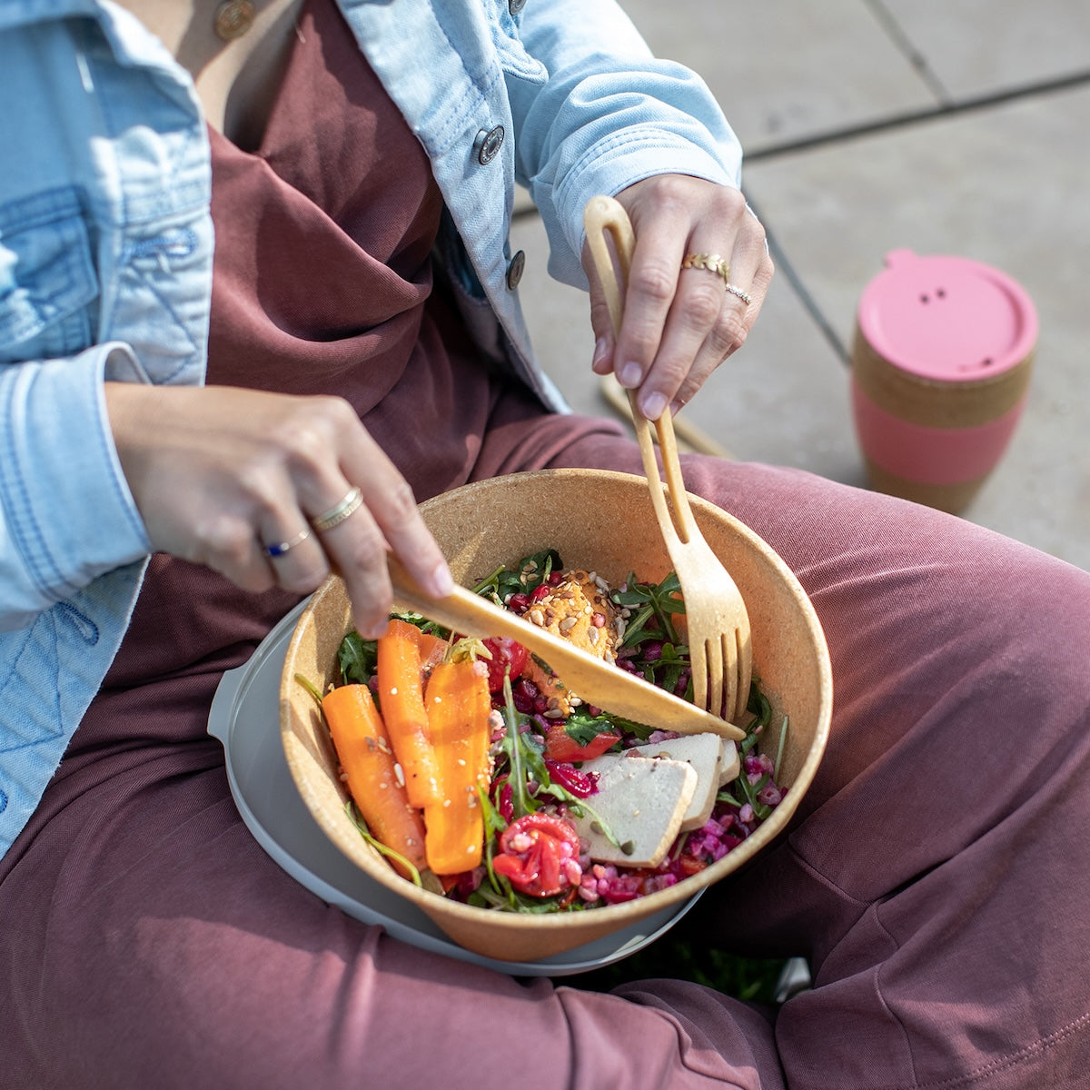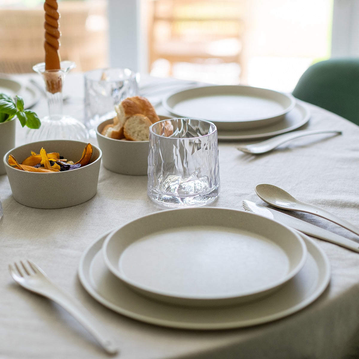 「バイオサーキュラー素材」は、100%ナチュラルの革新的な新素材です。バイオサーキュラー素材は、断熱性などの木材の特性とナチュラルな質感、そして熱可塑性プラスチックの弾力性と軽さを兼ね備えています。高い耐久性で傷付きにくく非常に丈夫で長持ちします。使用している素材には、メラミン、BPA、竹は含まれていません。