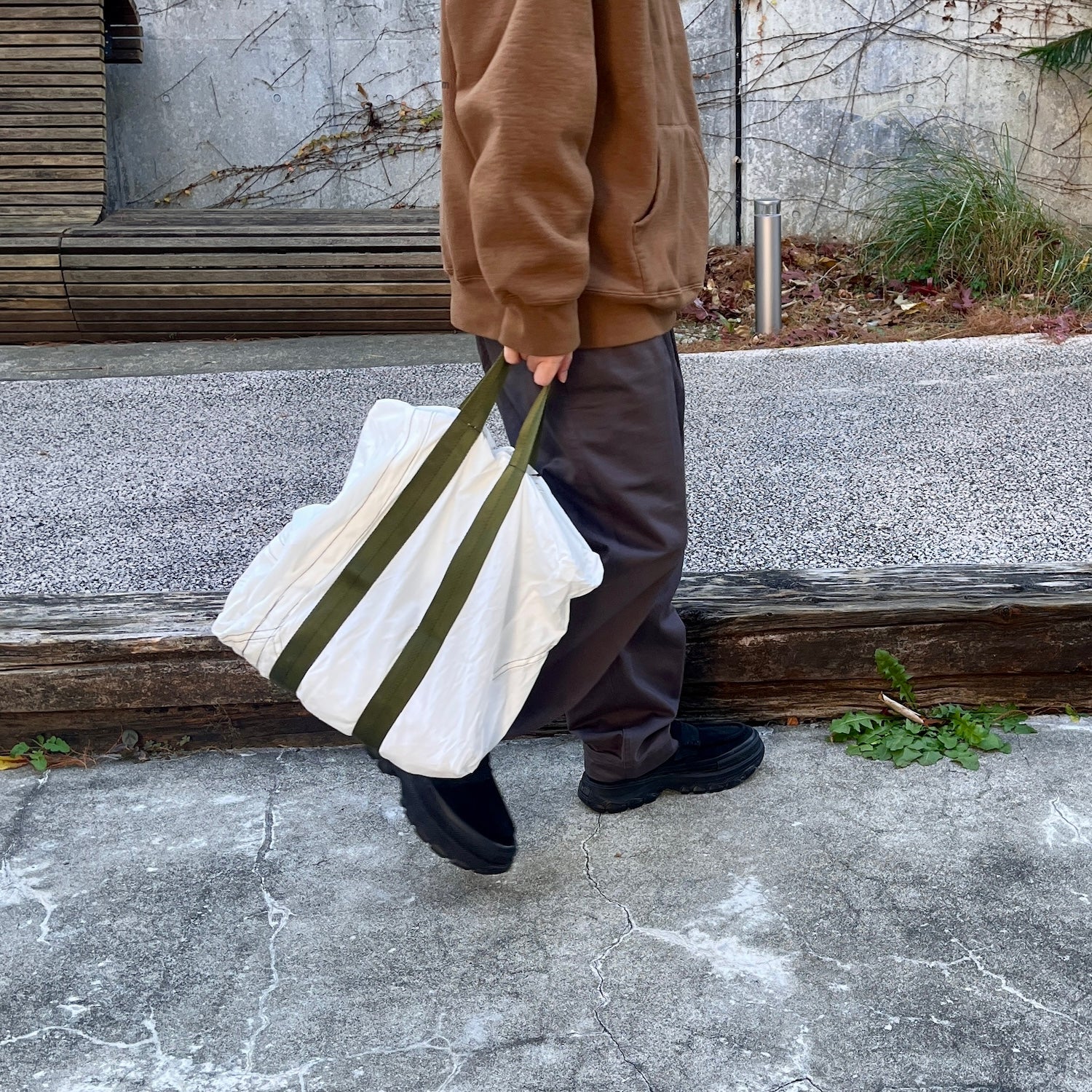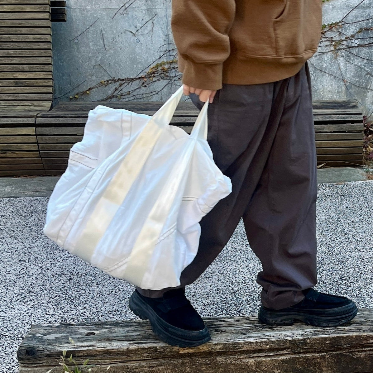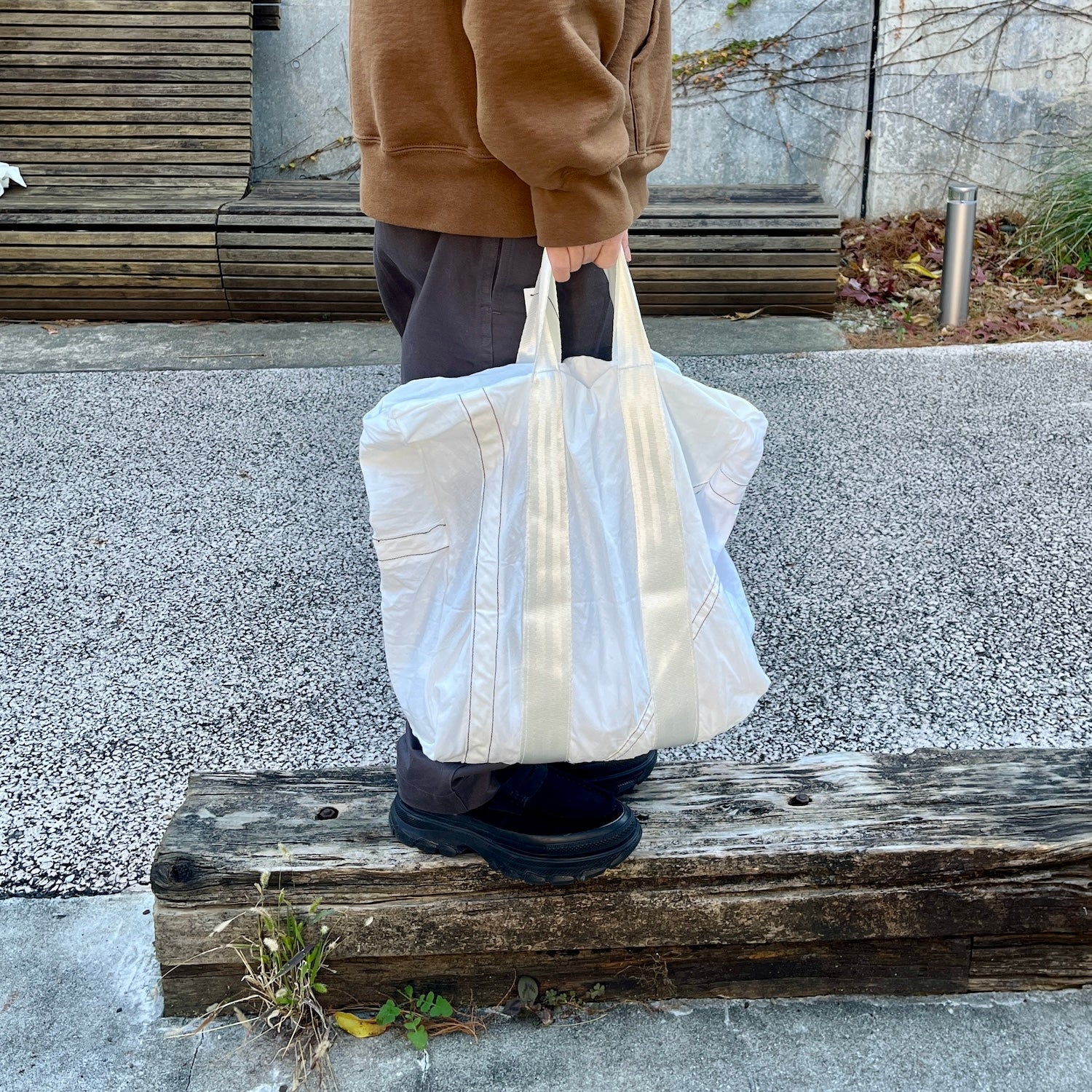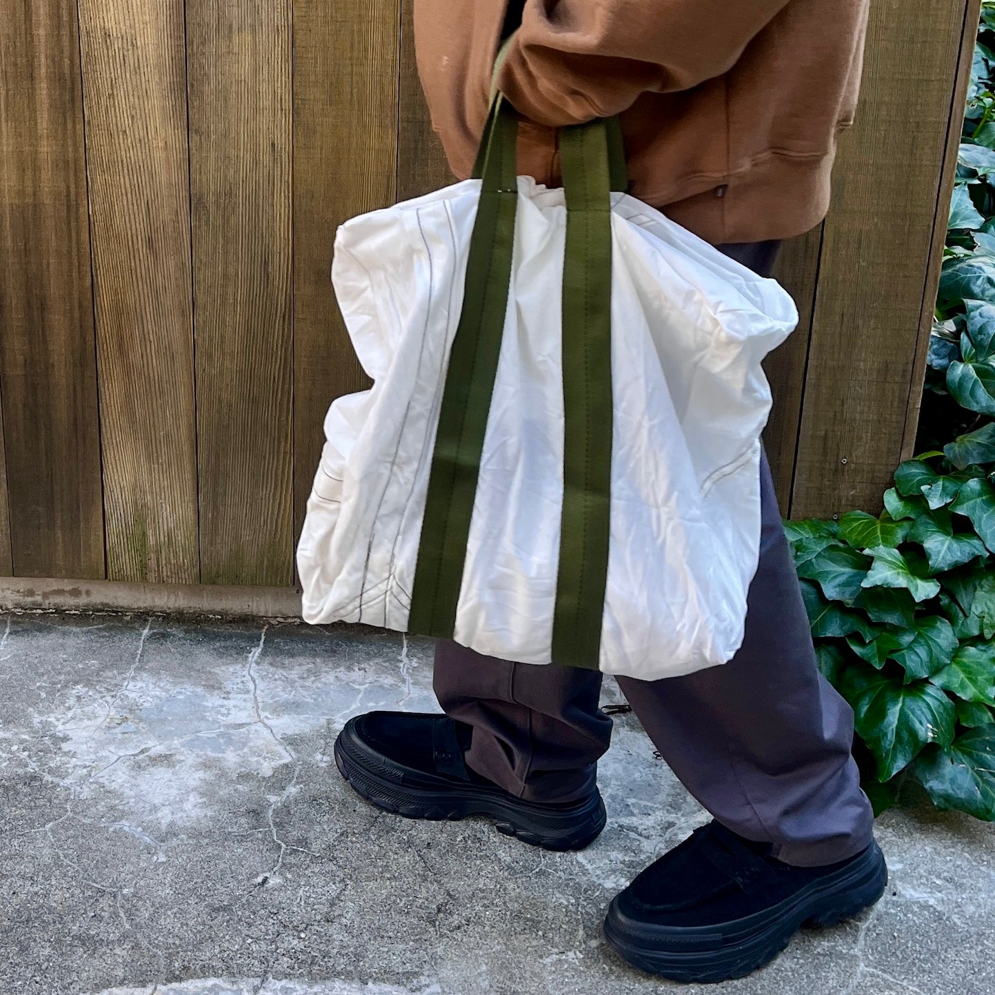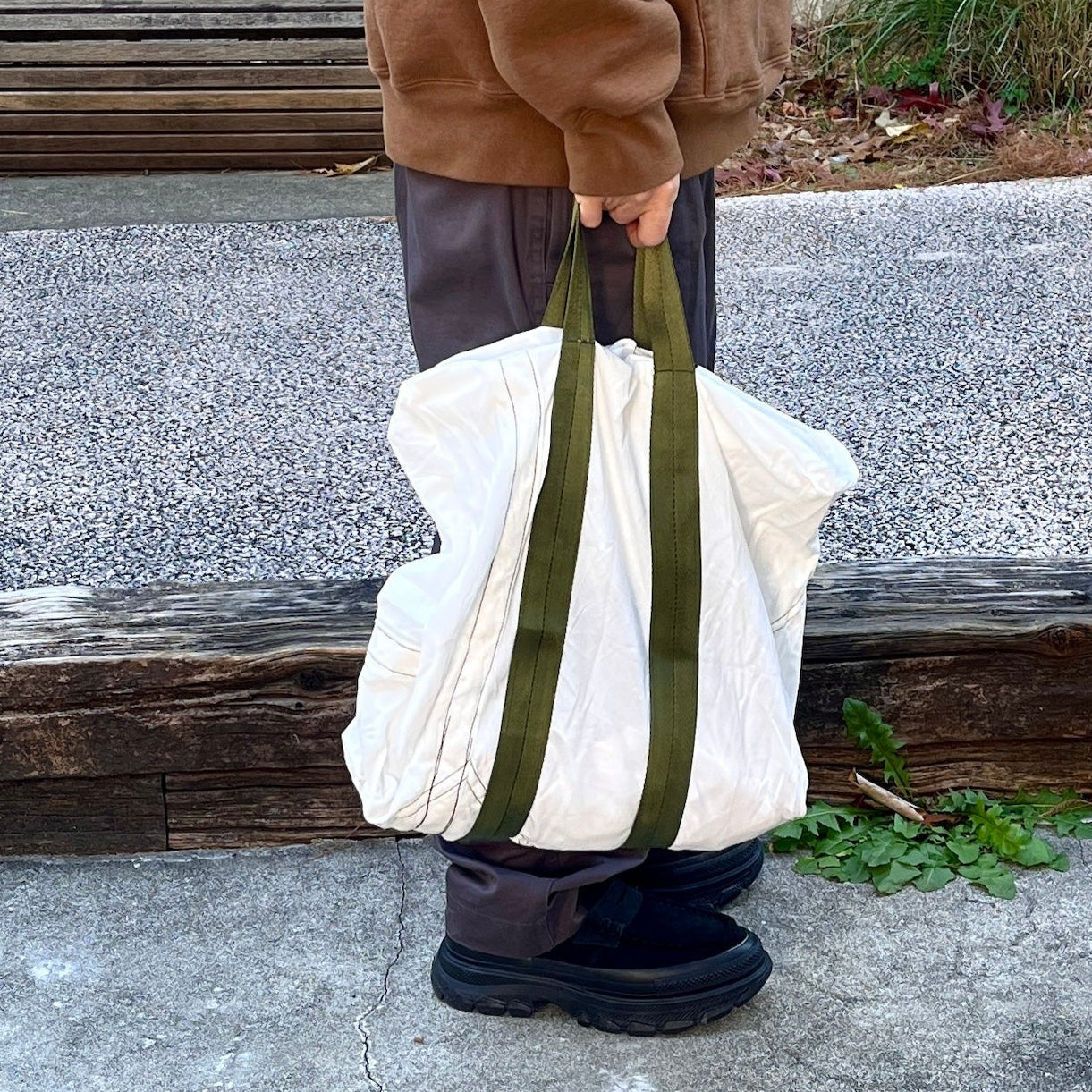 この生地感とクタッとした柔らかいシルエット。どこか軍モノっぽい無骨さもあるけど、絶妙に上品さもある。このバランスがたまらない。HATCHヘビーユーザーにはおなじみ、ユーズドのパラシュート生地をリメイクしたシリーズのトート。あとね、どんなコーデにもすっと馴染むんです。ベーシックだけど雰囲気がある。もうトートバッグはたくさん持っているよーという方も、これは別枠で持っておいて損なしのやつです。しかも3,850円なら、持っておいていい理由になります。文句なし。(※ご購入前に必ずアイテム説明欄をご確認ください。この風合いも含めてブランドの魅力なので、ご理解いただけない方はご遠慮ください。)
