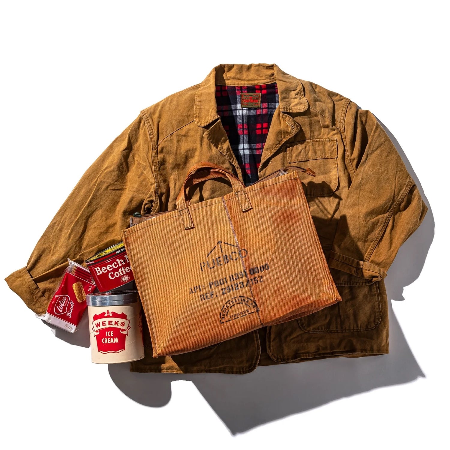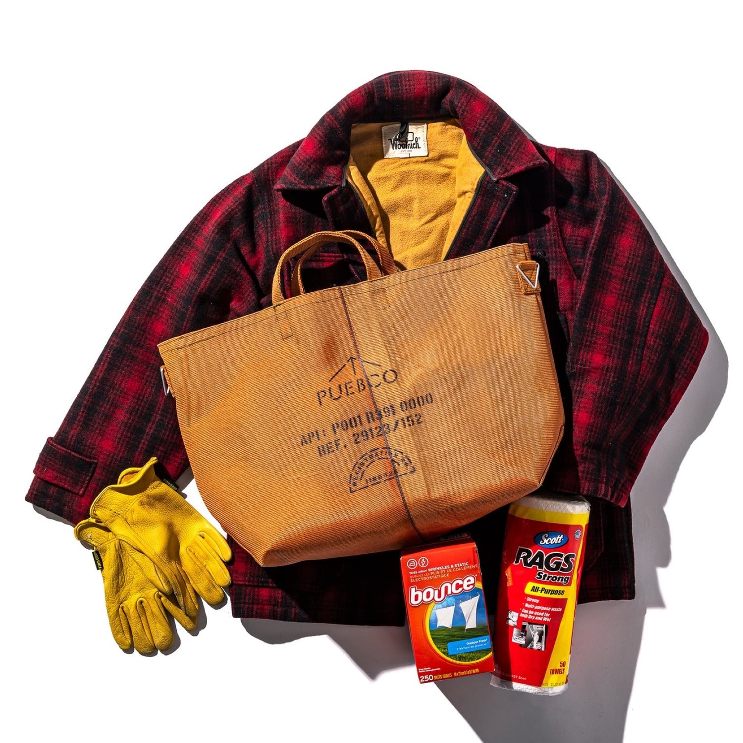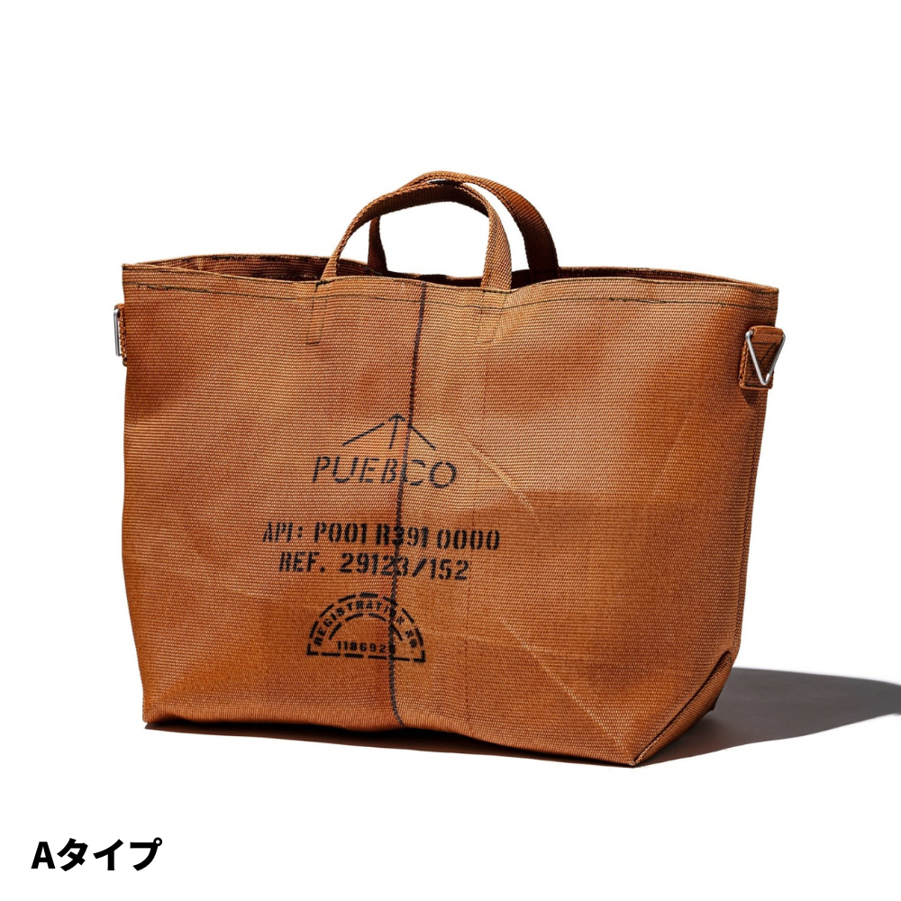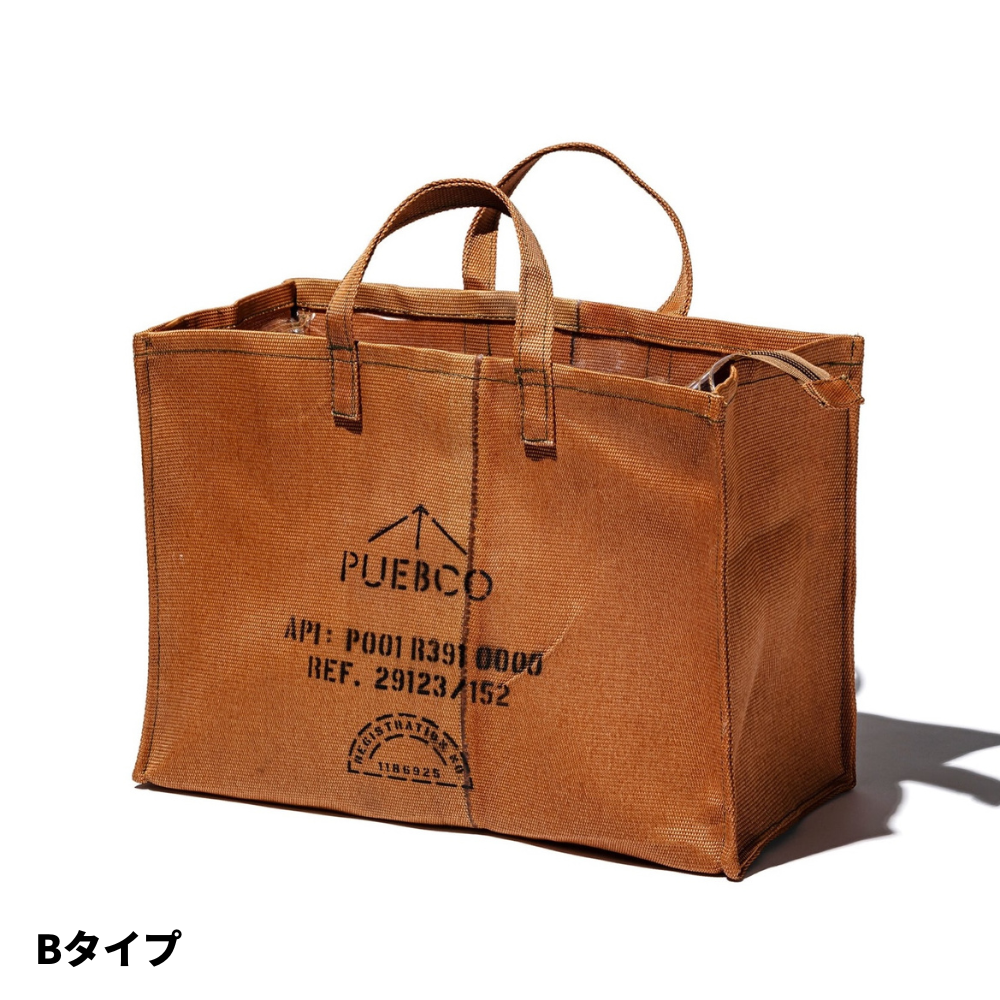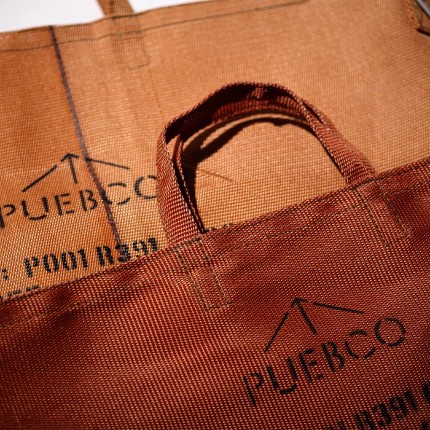僕はpuebcoのバッグをいくつ持っているんだろう。これは仕事で使う、これはカフェに行く時に使う、これはちょっと遠出の時、これは生地が違うから…と毎回自分に買う理由をつけてしまいます。このバッグの"言い訳"は、「大きめのバッグって、ひとつあると絶対に役に立つから!」です。運搬・保管用の業務用のフレキシブルコンテナの、硬くてハリのある素材を使っていて、こんなバッグははじめて。すごく新鮮でぜひ実物を見て欲しいです。この素材感と色味の雰囲気にやられました。(※ご購入前に必ずアイテム説明欄をご確認ください。この風合いも含めてブランドの魅力なので、ご理解いただけない方はご遠慮ください。)