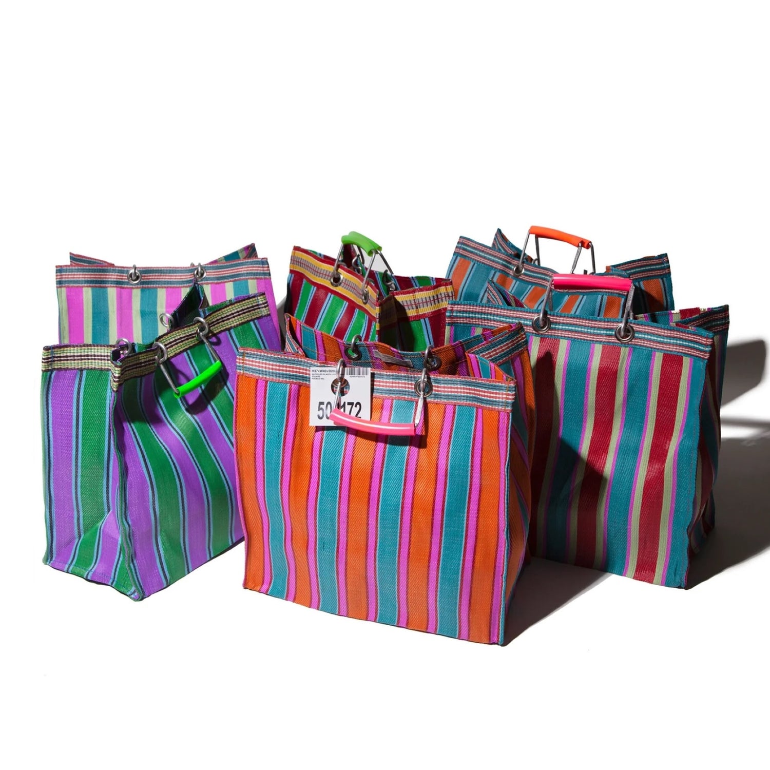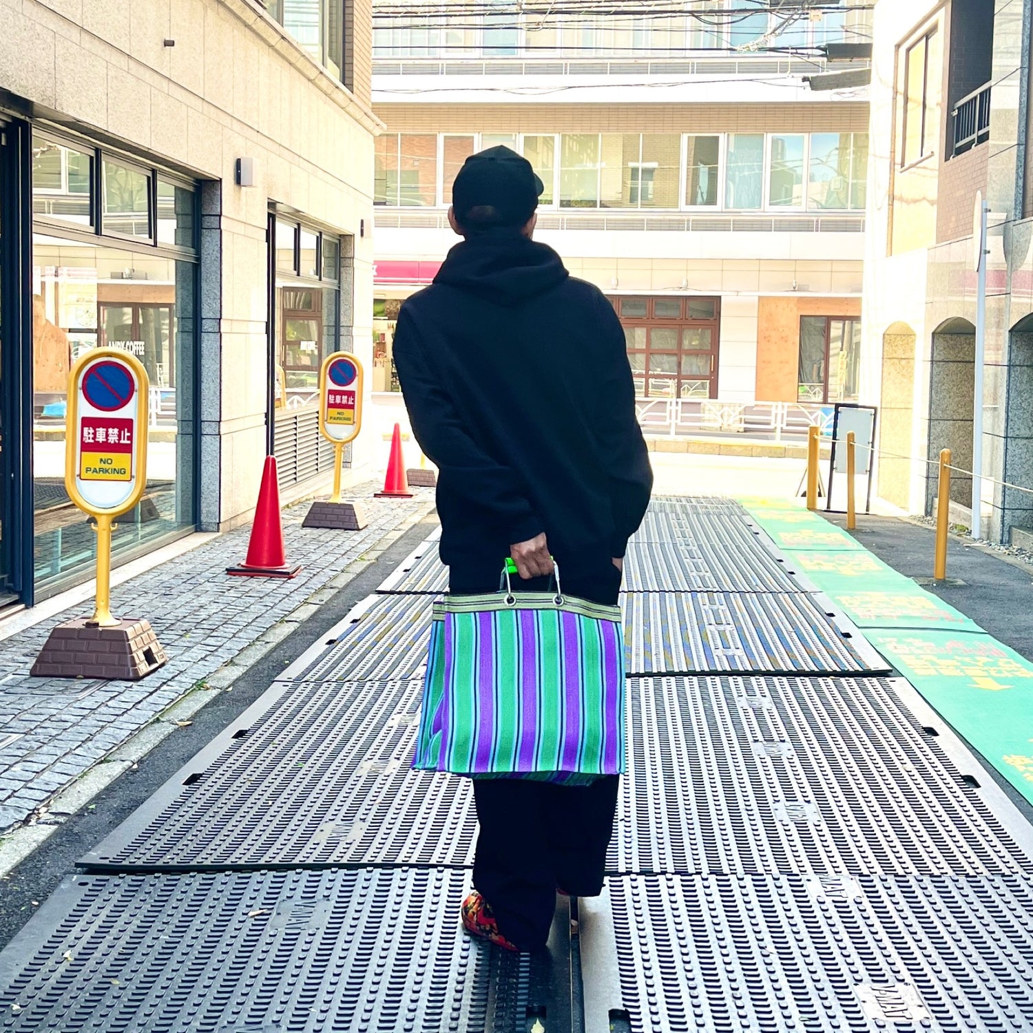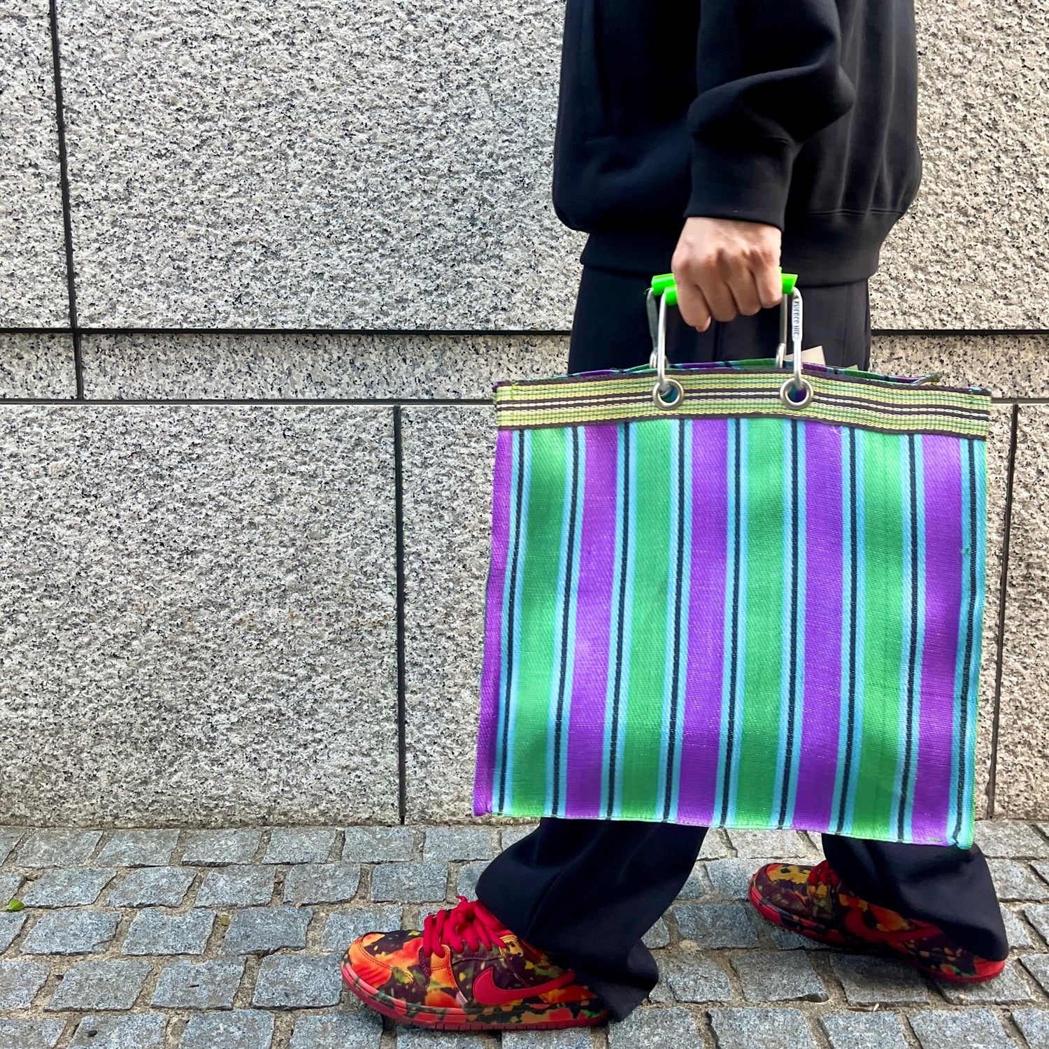 インドの地方からムンバイ空港に到着してすぐ、このバッグに目が止まった。バッグの大きさと、生地の発色がとてもいい印象だ。インドで良く見かけるこの生地だが、ここまで発色の良い物は見た事がなかった。すぐに工場を探した。数ヶ月後、届いたサンプル生地とこの画像を見比べて概ね、同じ物と確認し何を作ろうか考えていた。この生地だけでバッグを作ろうとするとどうしても「可愛く」なってしまう。だから工業的な印象に仕上げたかった。試作品はハンドルを鉄で作った。見た目は良いが重く使いにくかったのでアルミニウムでハンドルを作る事にした。また持ち手の保護用に水道ホースを使うことにした。