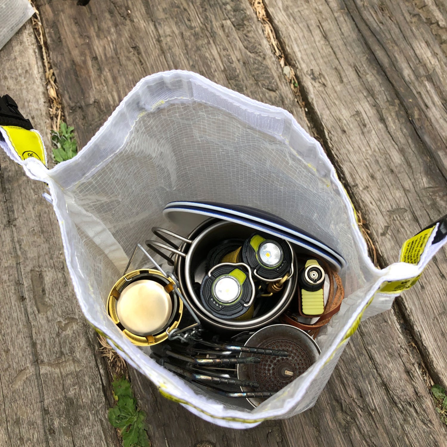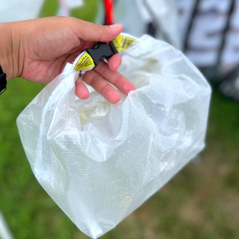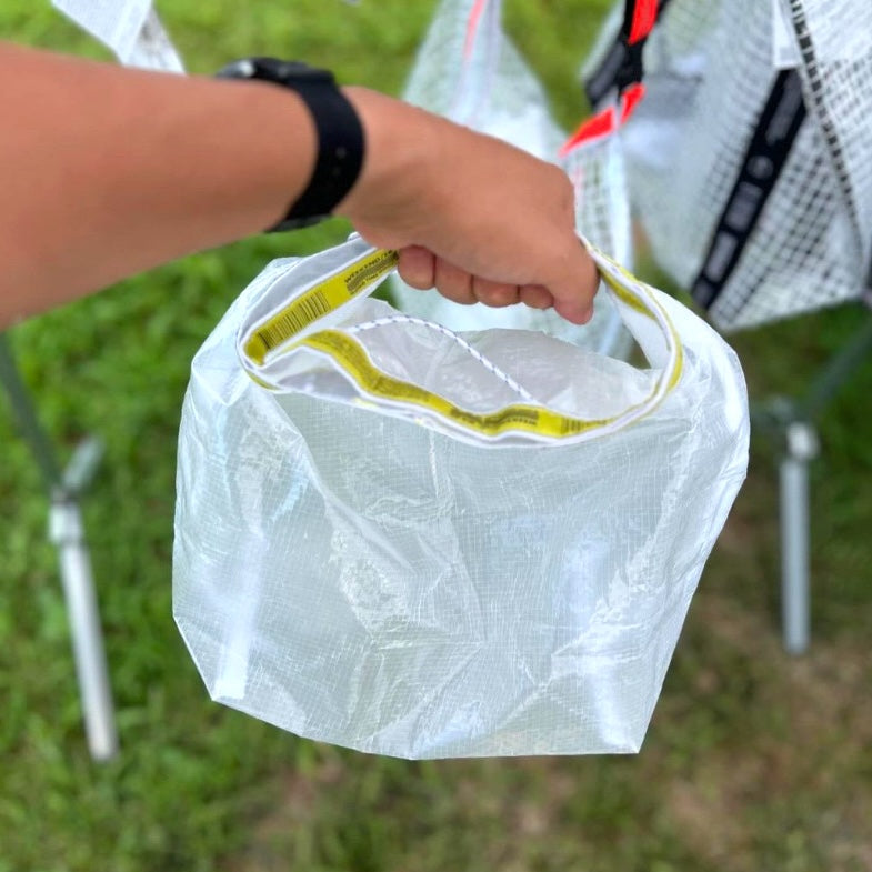 ビニールシートと同じような生地感を想像してたんですが、それよりも柔らかくて取り扱いやすい感じがします。マチが広いので何でも入るくせに、くしゃくしゃっとロールアップして内容物を固定できる(中身が遊ばない)ところが最高に気に入っています。雨などの天候も気にしなくていいですし、これからの季節、海や川などのレジャーでも大活躍しそうです。