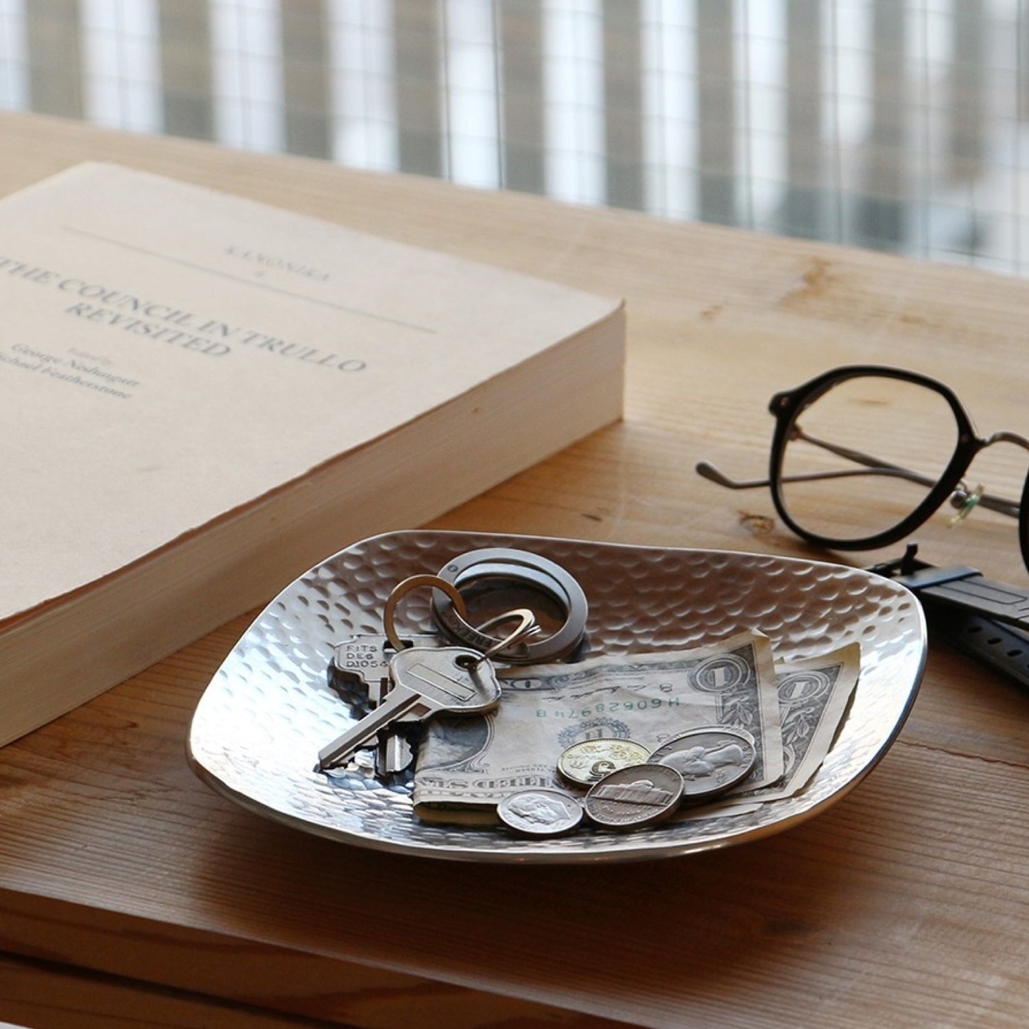 シンプルなデザインのアルミトレイ。インドにてトラックや車の廃材から出るアルミを粉砕することでリサイクルして作られています。鍵や財布など身の回りの品を入れておく場所にしたり、アクセサリートレイとして使ったり。灰皿としても使用することができます。用途によって選びやすい幅広いサイズ展開も魅力。フラットなデザインのものはお店・レストラン等でのキャッシャートレイにもおすすめです。