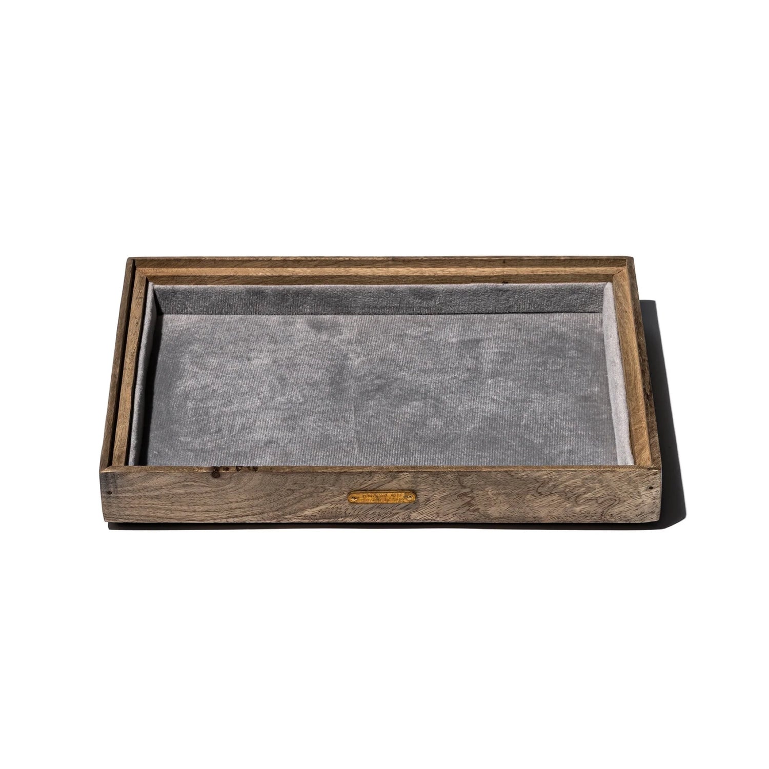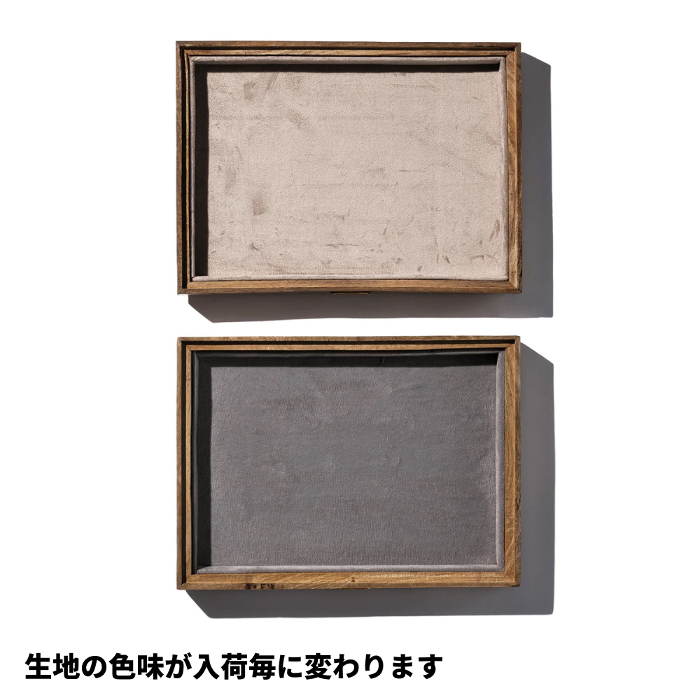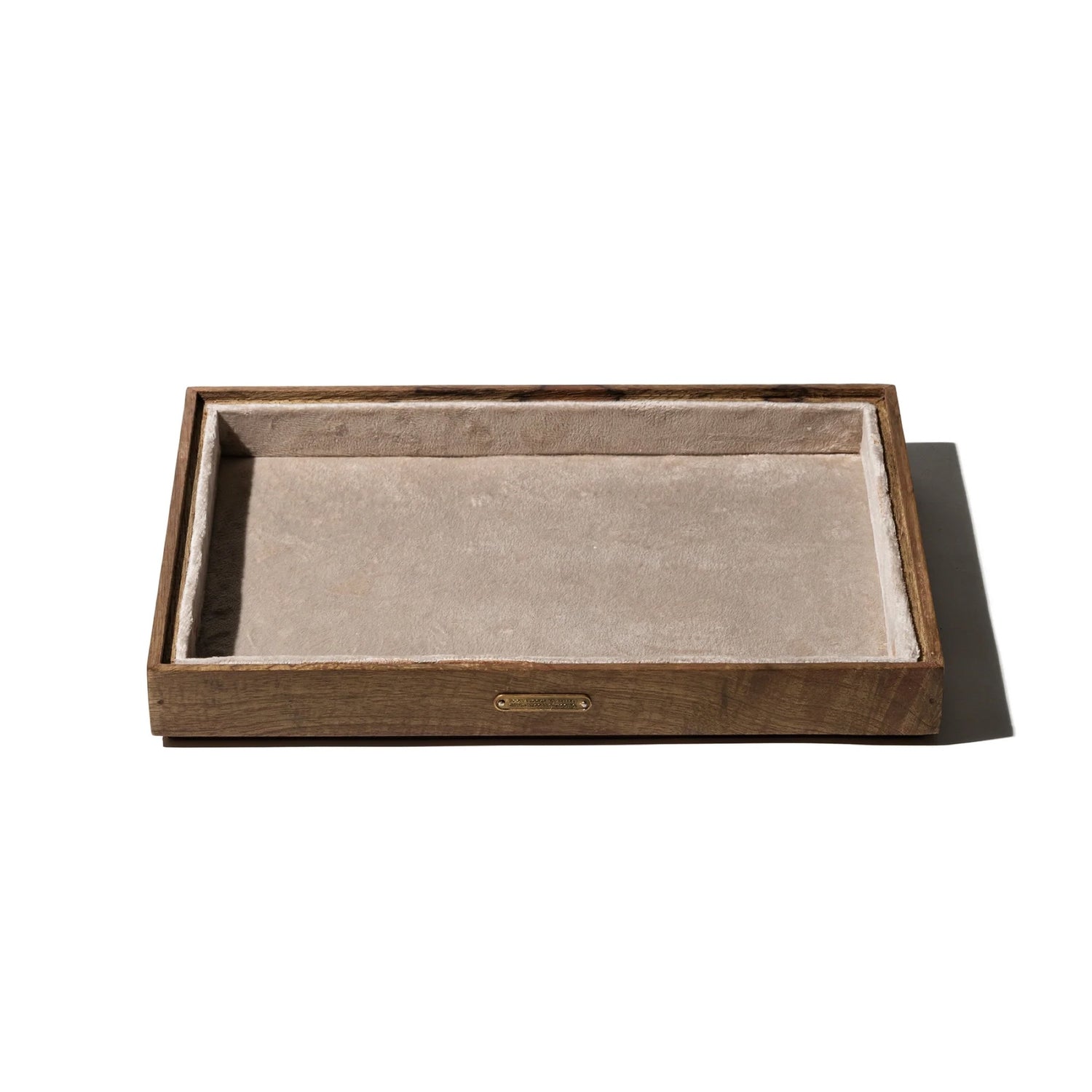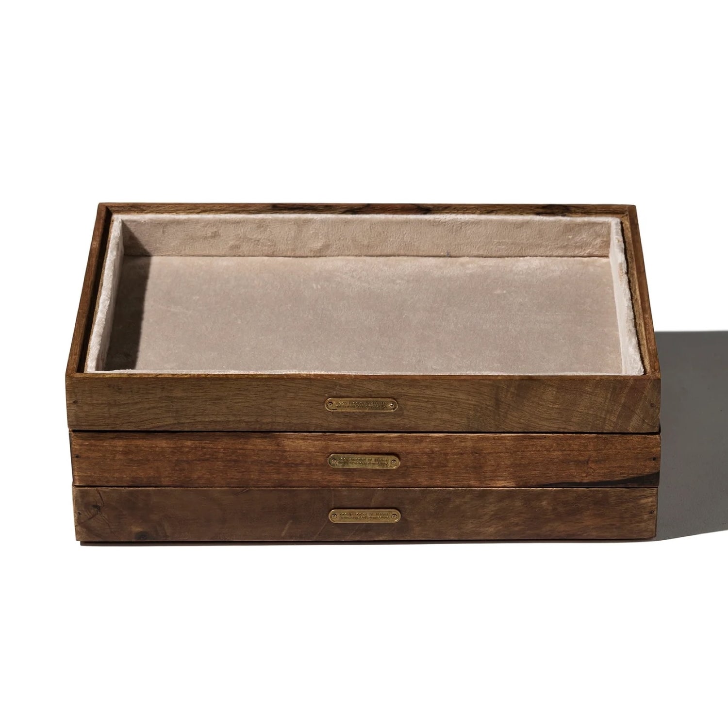 元のアイデアは古い宝飾店で使われていたトレーで、ガラスショーケースから宝石を取り出して顧客に間近で見せるためのもの。店舗什器として使っていただくもよし、家の玄関やリビングなどでアクセサリーや貴重品を置くトレーとしても使っていただけると思います。スタッキング可能。1点当たりの価格です。