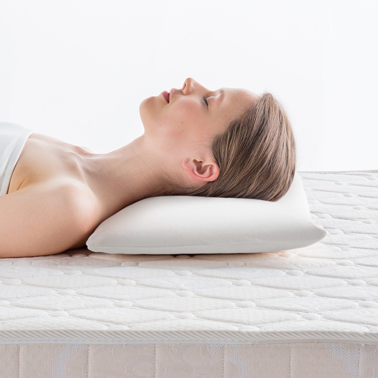 ”女優まくら”と称されるほど、低くなだらかなカーブが優しく首をサポート。特殊な凹凸やカーブを省いた低めのノンシェイプ機能性デザイン。首元のシワが気になる女性にはピッタリのまさに"女優まくら"。芯材の高反発フォーム<エリオセル MF®>は老若男女どんな体格でも関係なく頸椎にしっかりとフィット・サポートします。通気性にも非常に優れ、また温度によって硬さが変化しないので、1年中ムレずに快適にお休みいただくことができます。(トラベルロール付き)