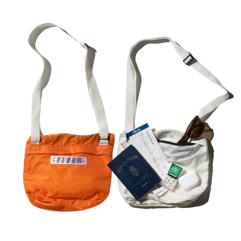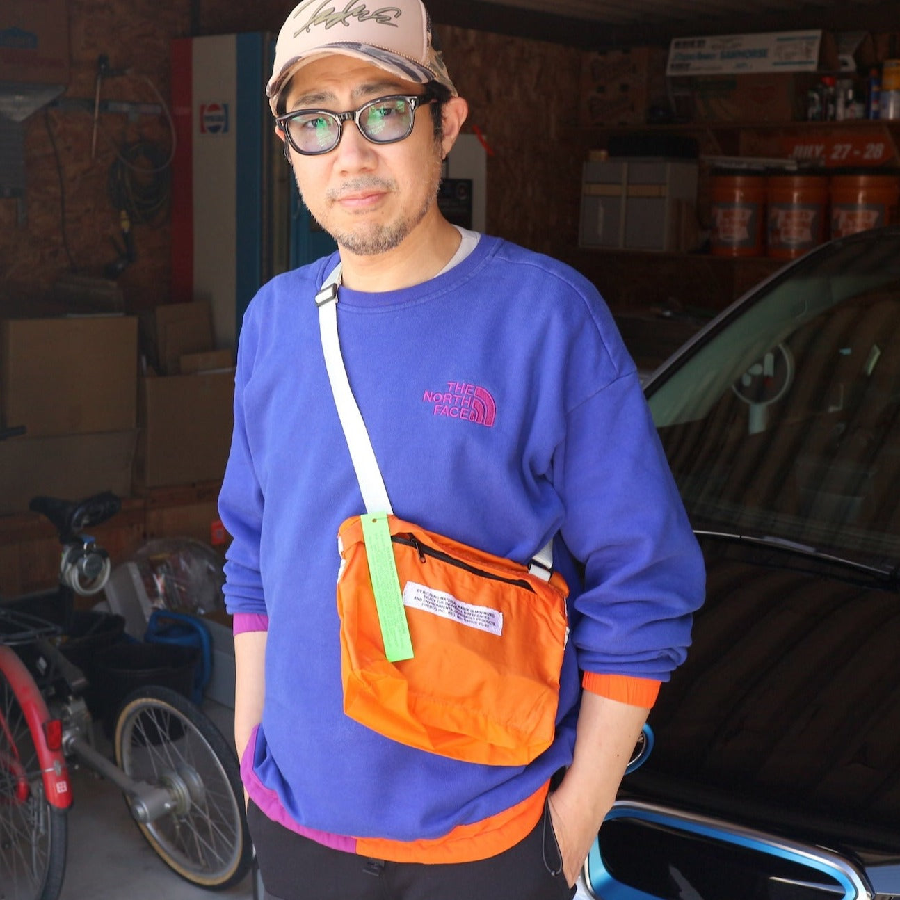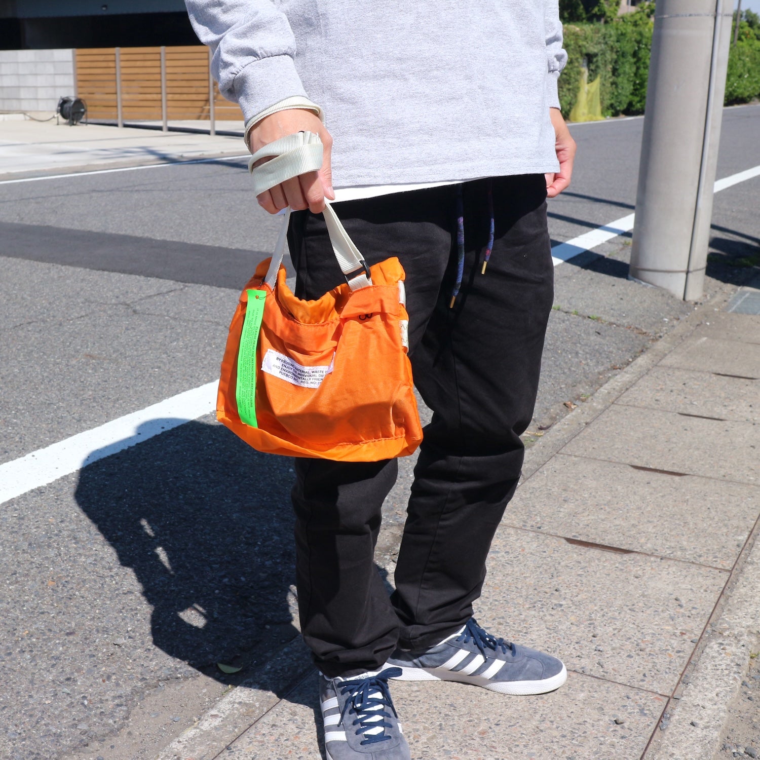 はじめに伝えておくと僕はエコとかサステナブルとかをファッションに持ち込みたくないタイプの人間なので、そういう観点でこのバッグを選んだのではありません。単にリサイクルで作られたこのパラシュート生地の風合いと雰囲気がとても良かったのでセレクトしました。サイズ感は本当に最低限のものを入れて持ち歩くためのサコッシュといった感じ。僕だと小さな本と財布、サングラス、スマホを入れています。肩下げのベルトの長さも調整可能で僕はあえて短めにして脇下に抱えるようにして持つのが好きです。これで街歩きや自転車に乗ってどこまでも行けます。値段もかなり良心的なので白とオレンジ両方とも買って、ファッションに合わせて使っています。