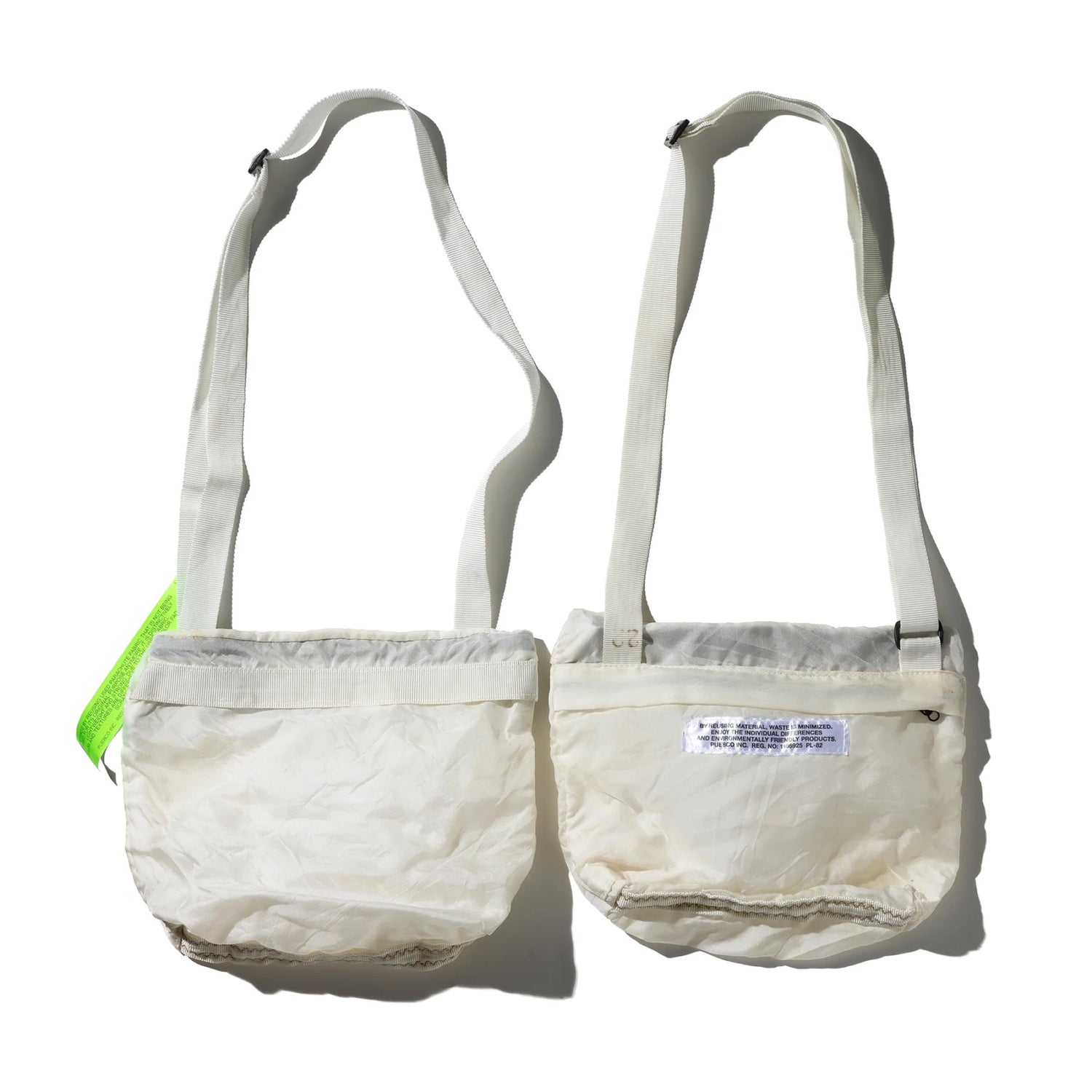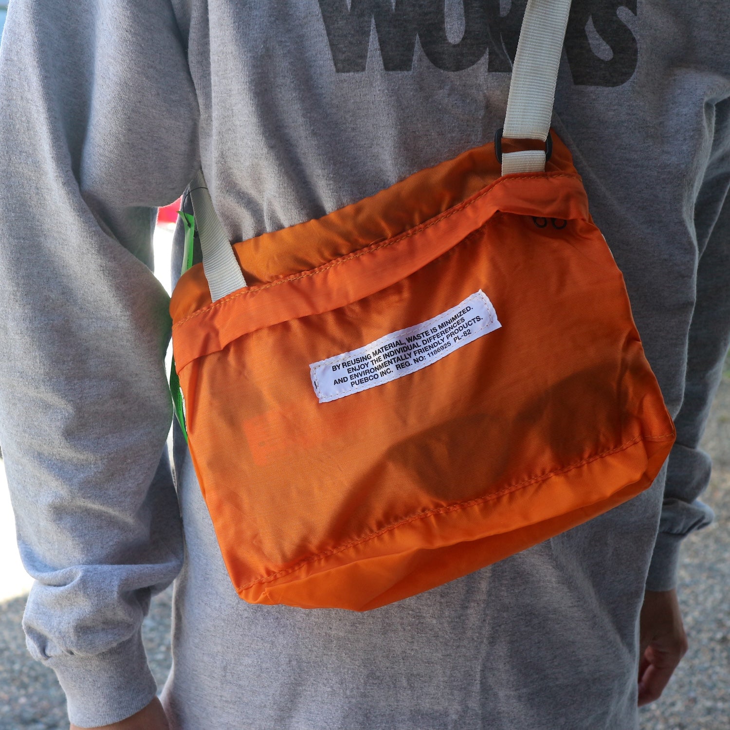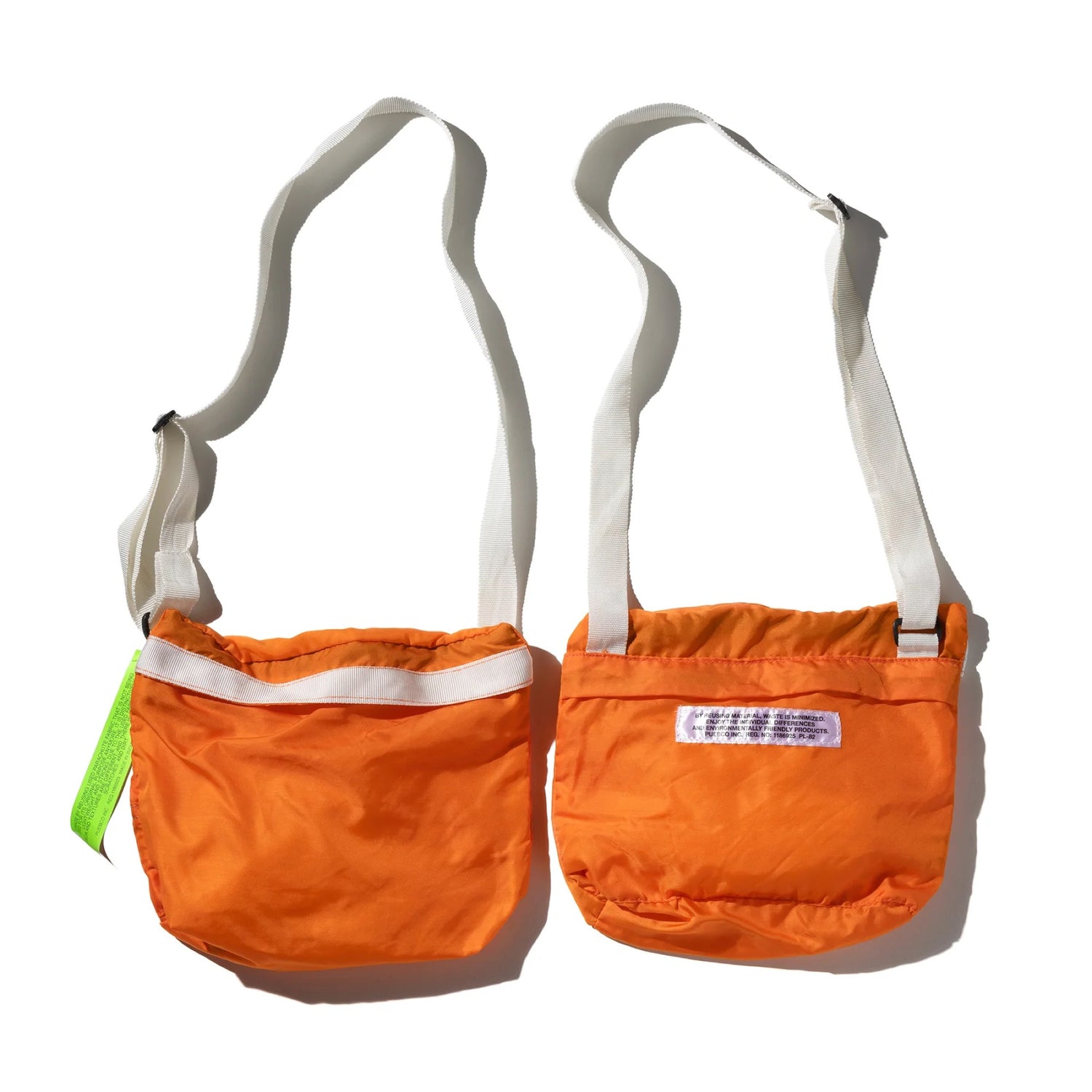 ユーズドのパラシュートを再利用して作ったショルダーバッグ。メインポケットと、外側にもポケットがあります。ダブルジップで機能性も◎