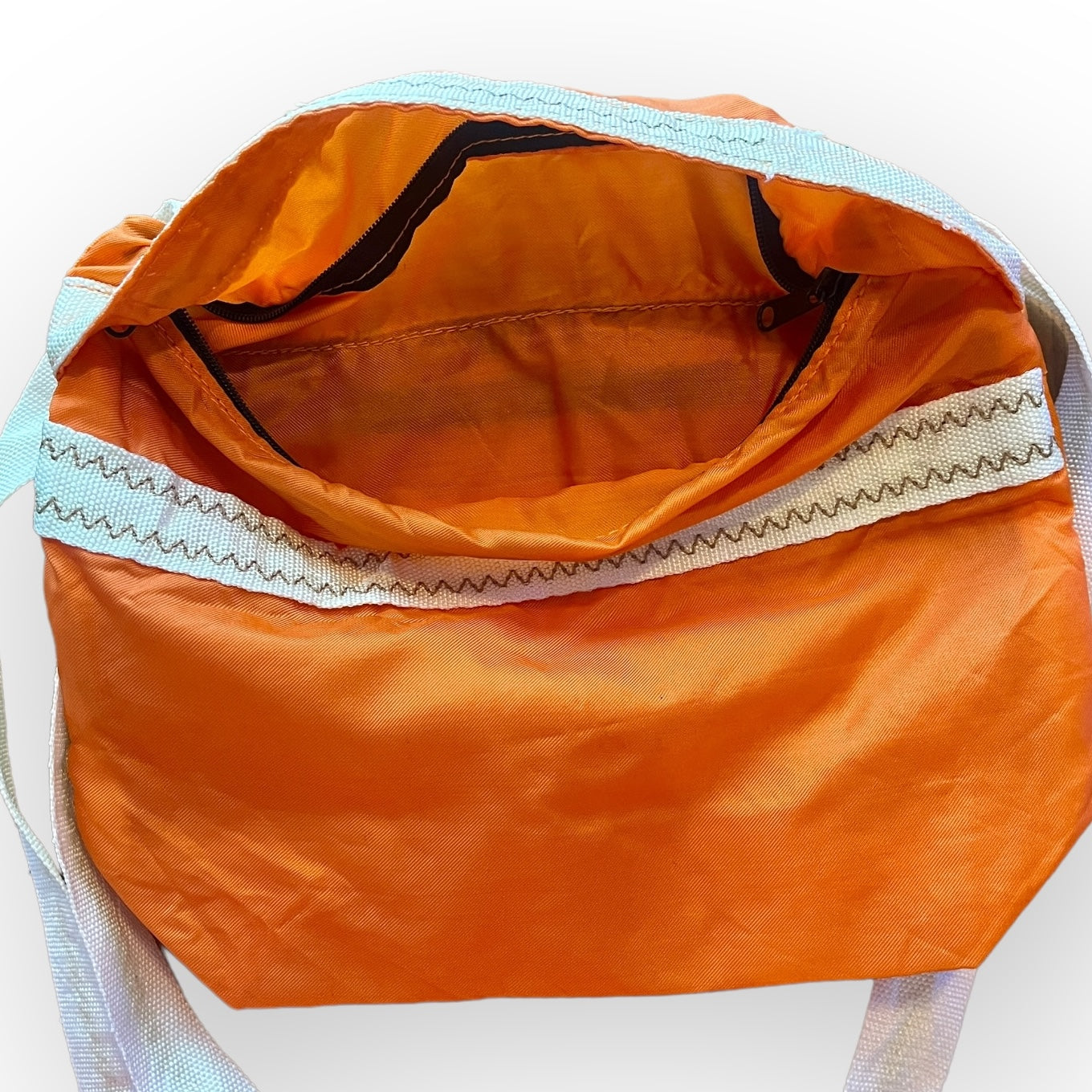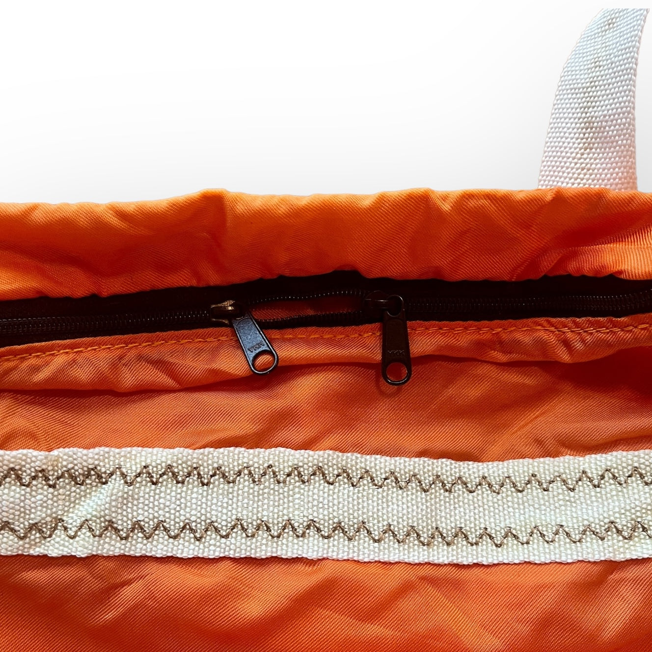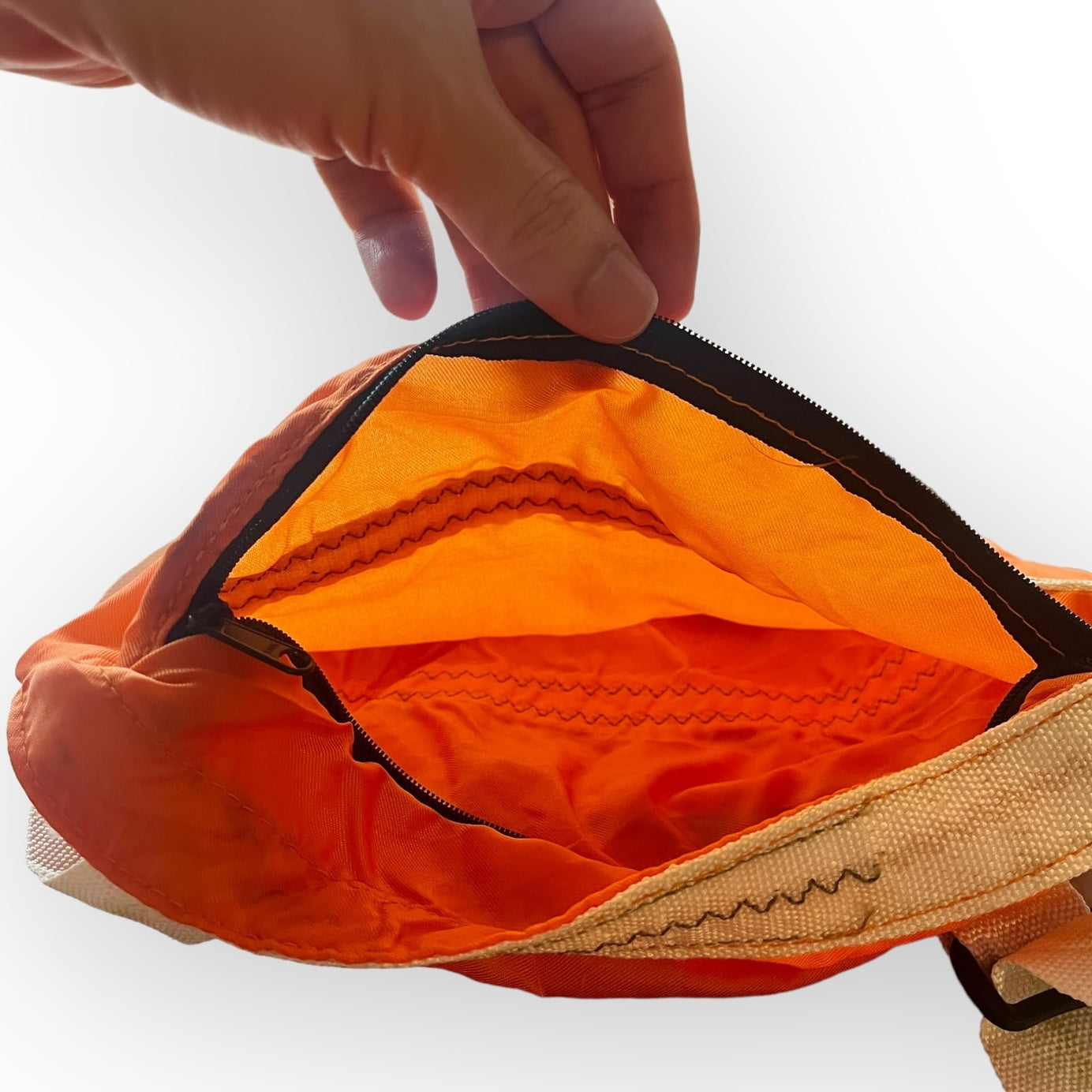 ユーズドのパラシュートを再利用して作ったショルダーバッグ。メインポケットと、外側にもポケットがあります。ダブルジップで機能性も◎