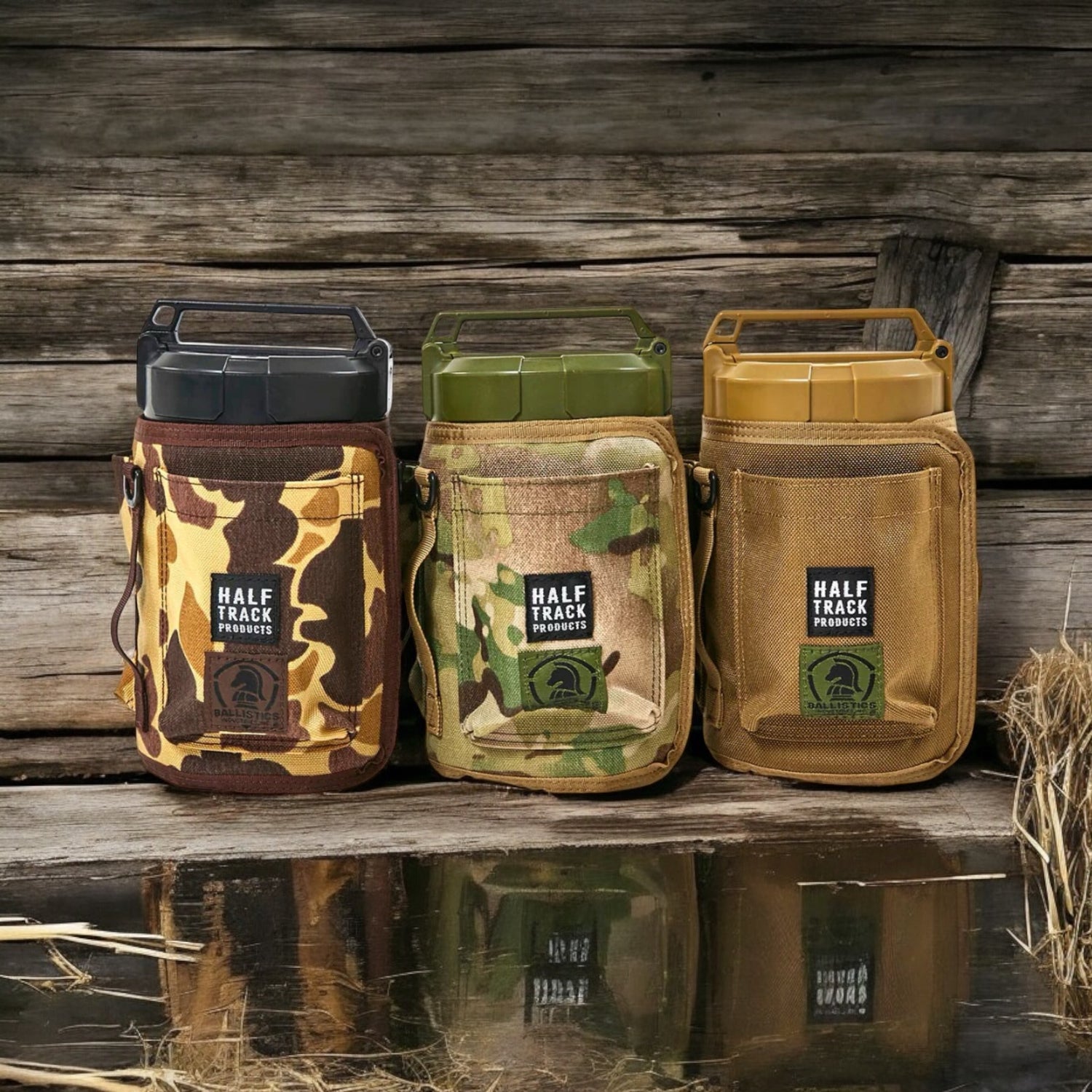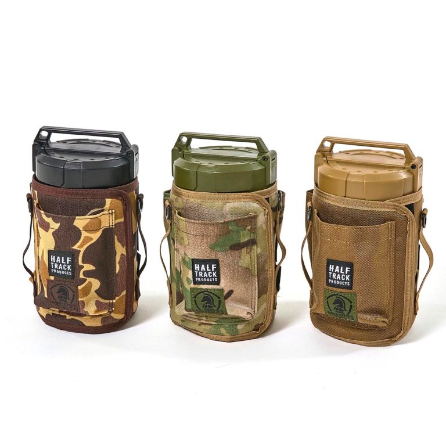 本体外周と底面のベルクロによりサイズ調節が出来ますので大抵の市販品サイズには対応できるかと思います。周囲にポケットが3つありますので小物の収納に便利です。