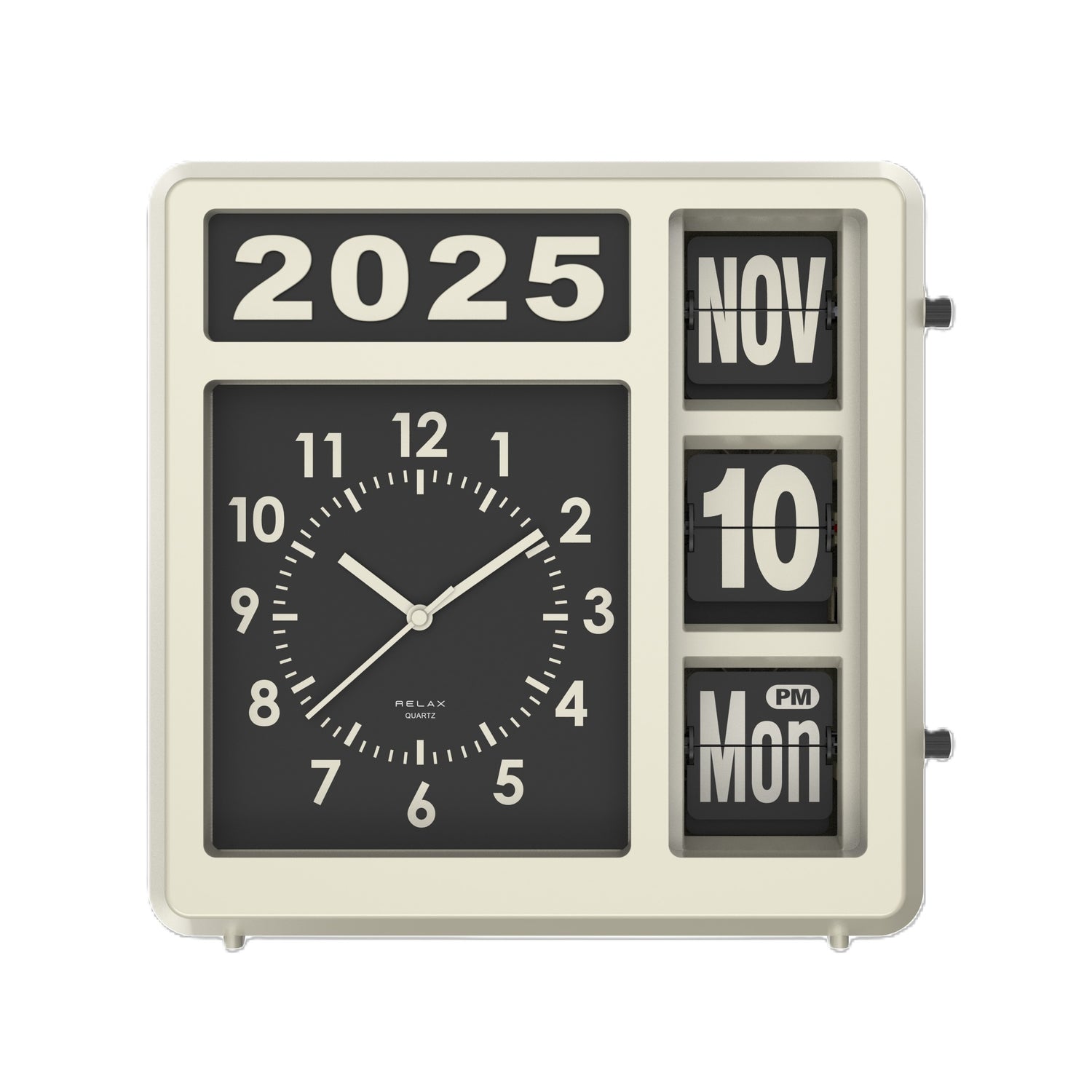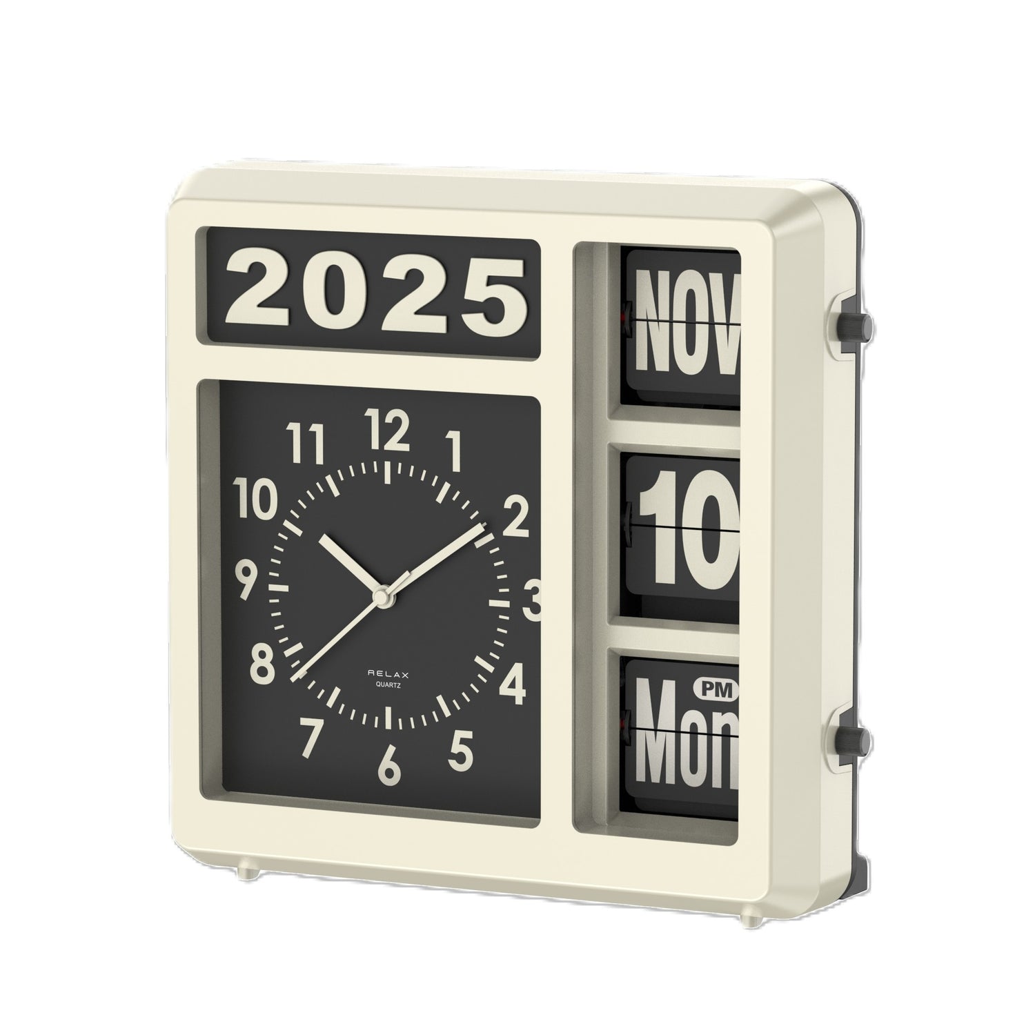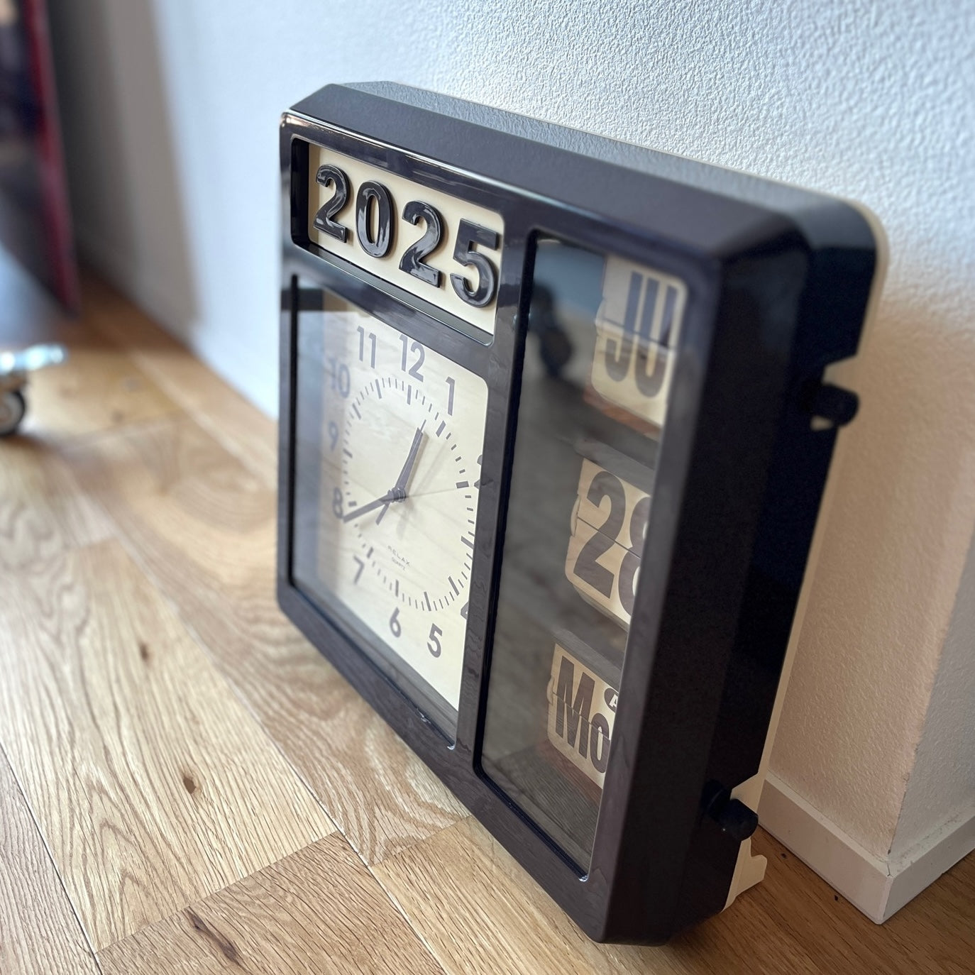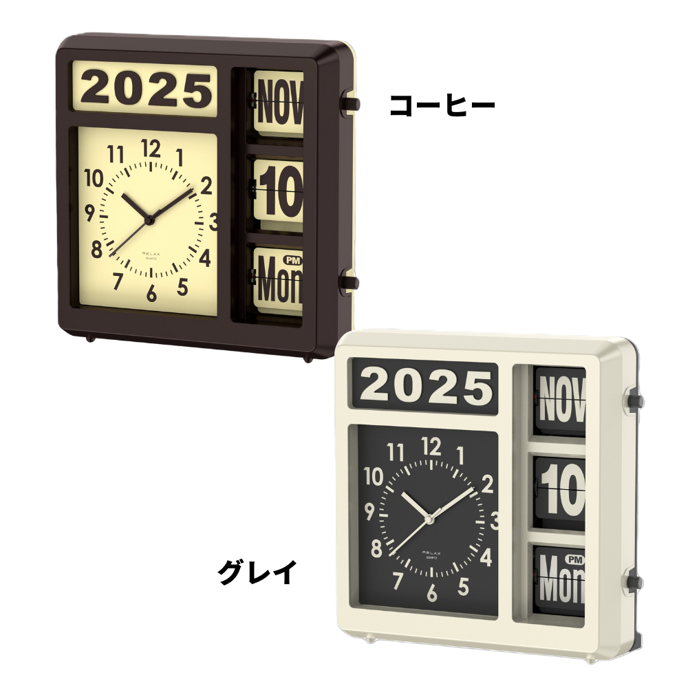 アナログ時計とフリップカレンダーが一体になった、どこか懐かしいレトロデザインの時計です。これ一つで、アナログ時計、西暦、月、日、曜日、AM/PMがひと目で確認できます。どんな空間にもフィットする2WAY仕様で、置き時計としても壁掛け時計としても活躍。付属の西暦表示パーツを付け替えれば、毎年変わる西暦にも簡単対応。長くご愛用いただけて、新しい年を迎えるたびにパーツを付け替えるのも楽しみの一つです。フリップ部分は側面のダイヤルを回すだけで簡単に変更できます。新生活や引っ越し祝いの贈り物にもぴったりの、レトロで機能的なカレンダークロック。あなたの日常に、確かな時と特別な空間を届けます。フリップ部分は0分ちょうどには動きません。2,3分遅れます。(2,4,6,9,11月は月末に日付が自動で変わらないため手動で設定します。)