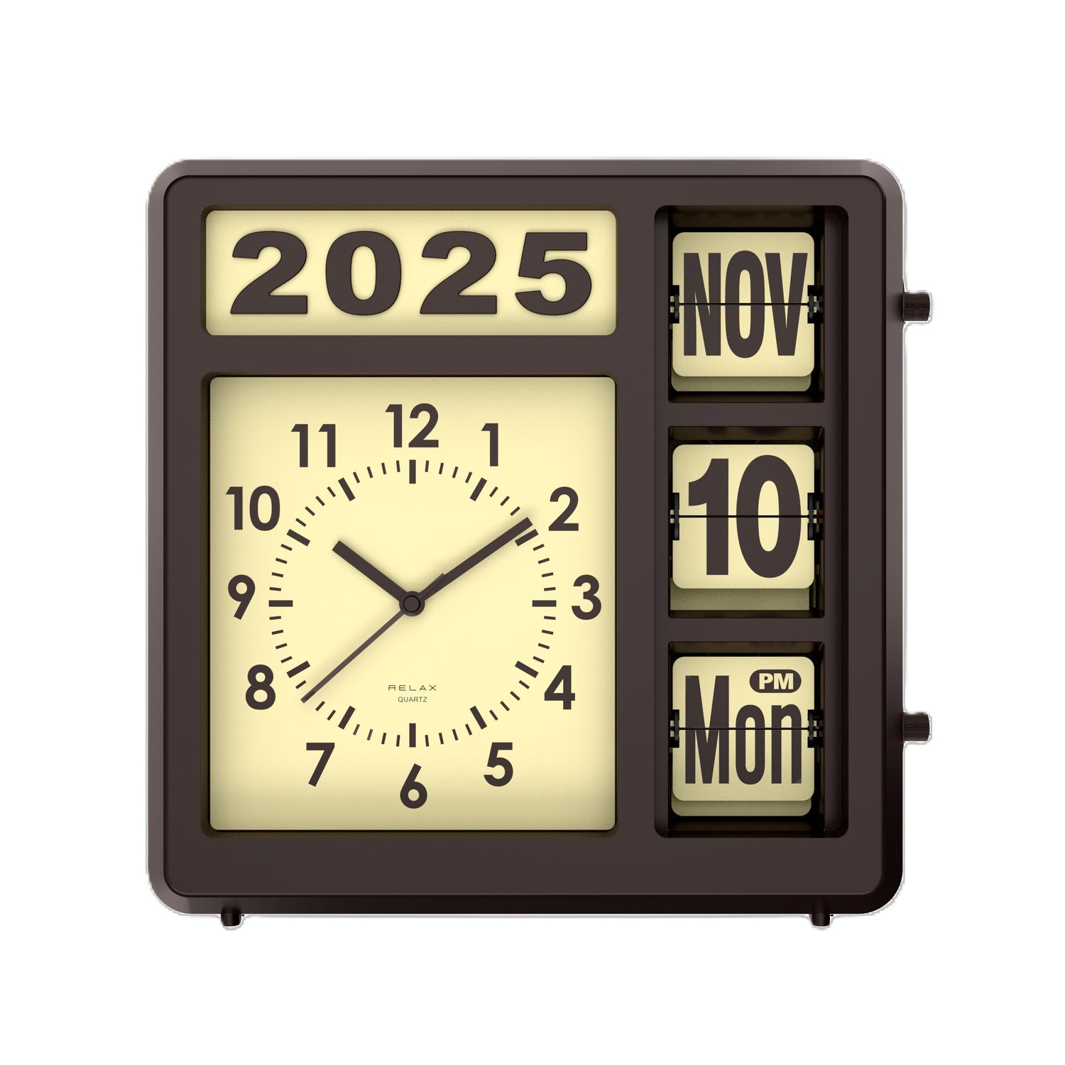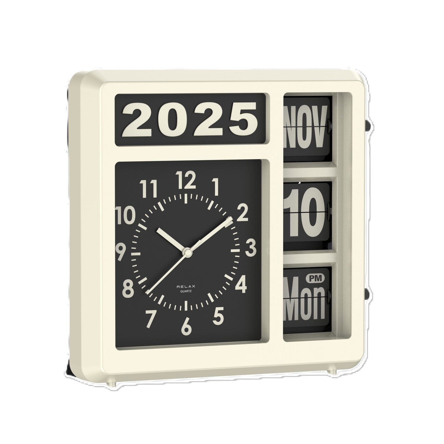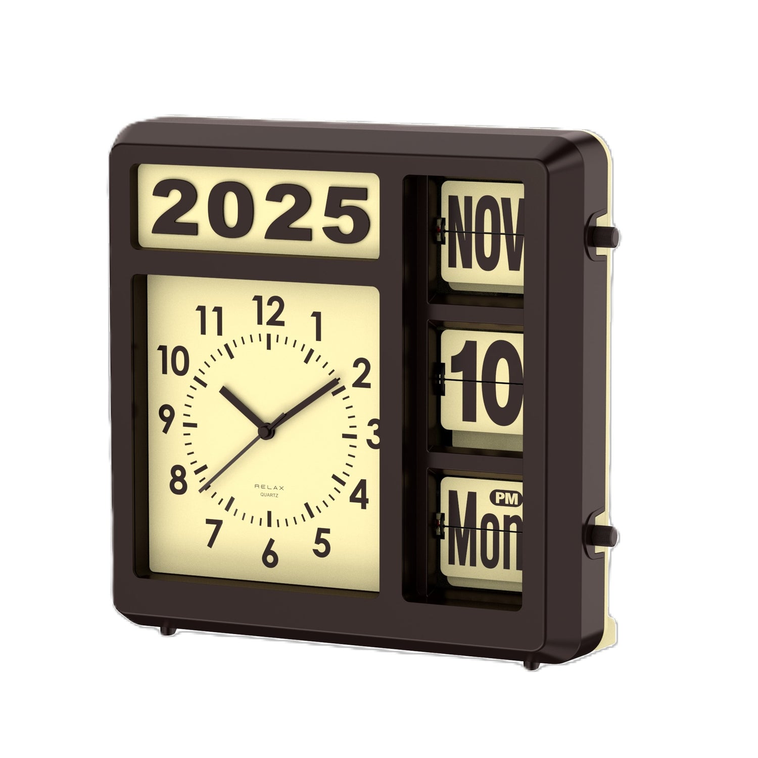 アナログ時計とフリップカレンダーが一体になった、どこか懐かしいレトロデザインの時計です。これ一つで、アナログ時計、西暦、月、日、曜日、AM/PMがひと目で確認できます。どんな空間にもフィットする2WAY仕様で、置き時計としても壁掛け時計としても活躍。付属の西暦表示パーツを付け替えれば、毎年変わる西暦にも簡単対応。長くご愛用いただけて、新しい年を迎えるたびにパーツを付け替えるのも楽しみの一つです。フリップ部分は側面のダイヤルを回すだけで簡単に変更できます。新生活や引っ越し祝いの贈り物にもぴったりの、レトロで機能的なカレンダークロック。あなたの日常に、確かな時と特別な空間を届けます。フリップ部分は0分ちょうどには動きません。2,3分遅れます。(2,4,6,9,11月は月末に日付が自動で変わらないため手動で設定します。)