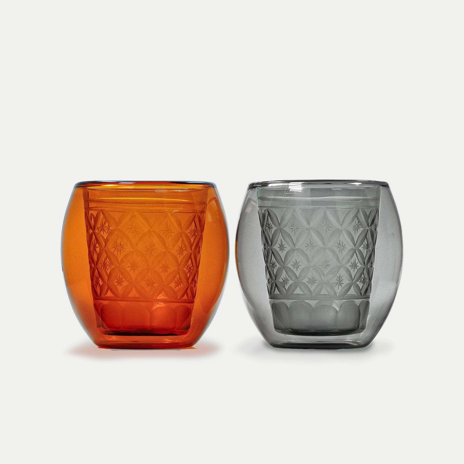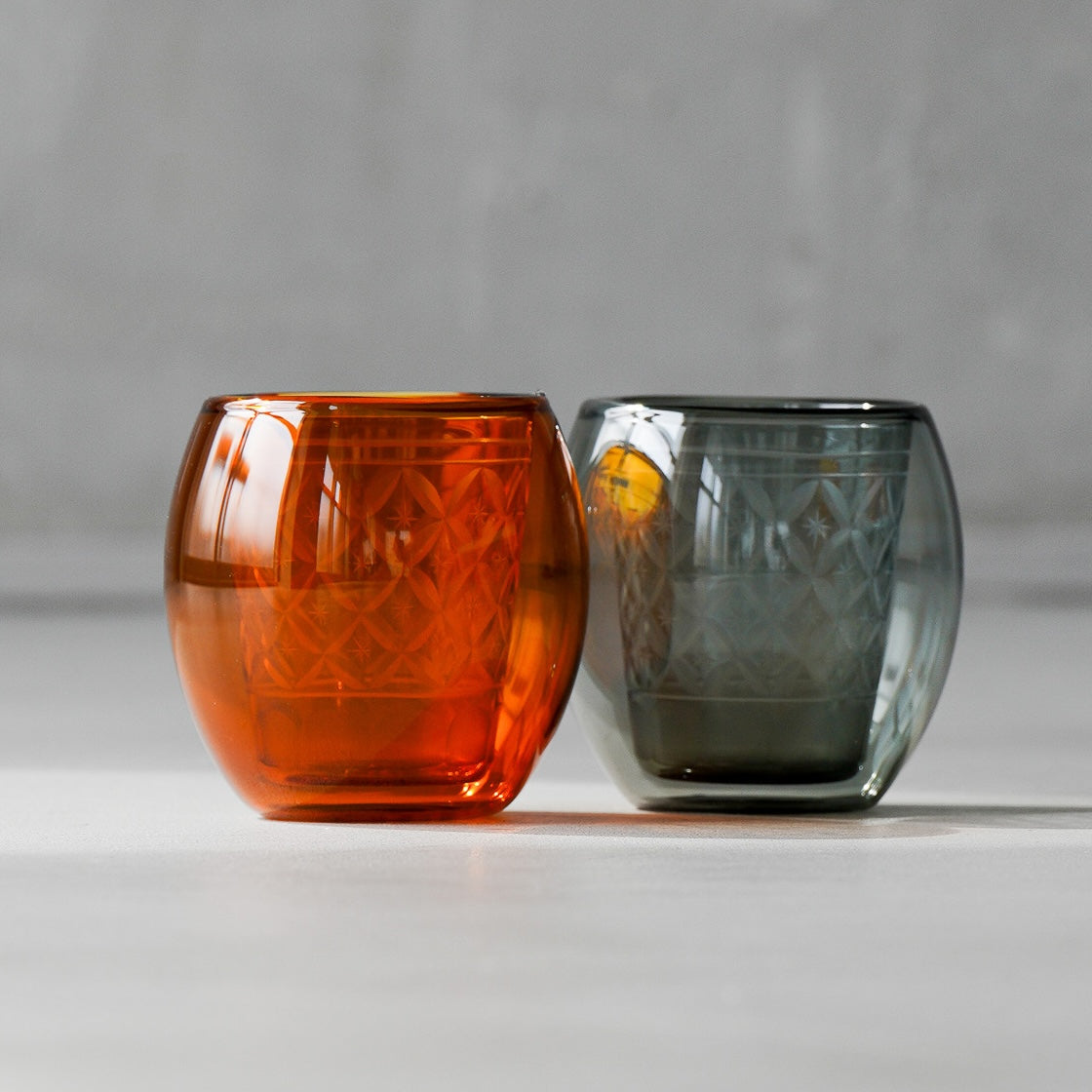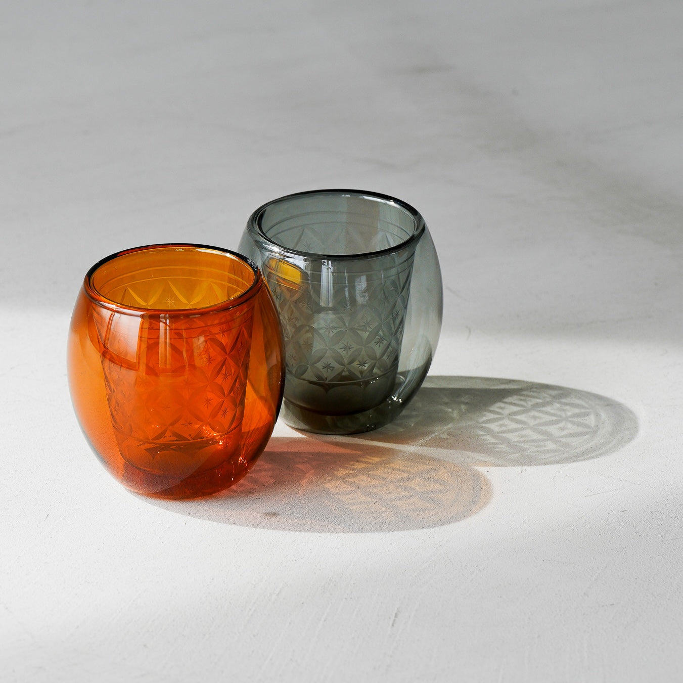 切子の美しさと機能を兼ね揃えた、“まるで浮いているような切子グラス” 。耐熱ガラスでつくられたダブルウォール構造の切子グラスは、電子レンジ対応などの機能性を向上させ、現代の食卓に馴染むよう設計。 切子グラスの魅力を身近に感じられる一品に。琥珀・黒曜ペアセット。