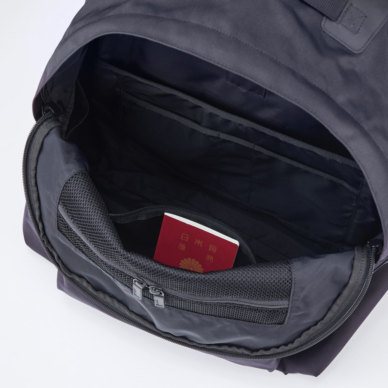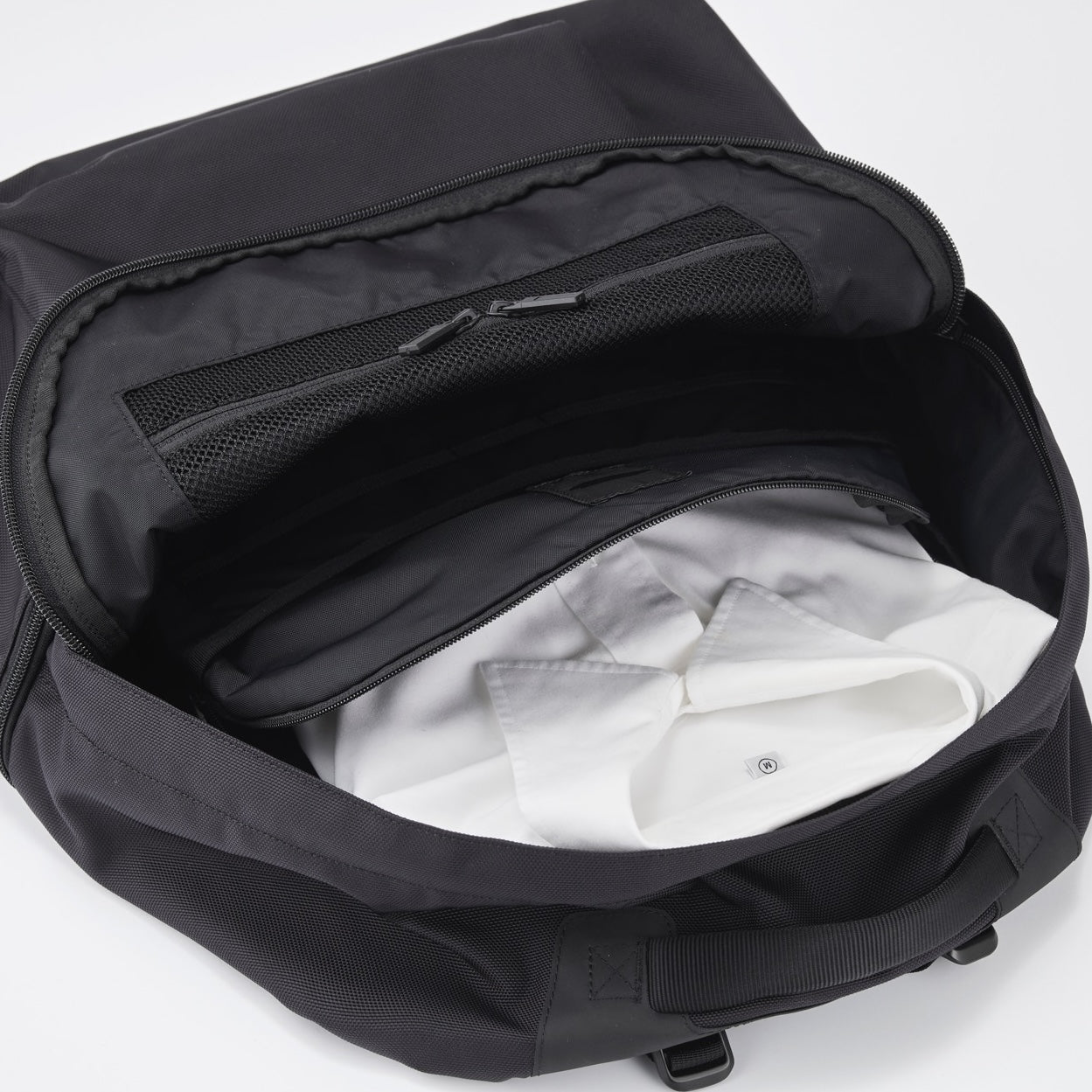 メインルーム内のスタッフポケットはファスナー・マチ付きで衣類の収納に最適。容量は5Lを確保し、収納したものが外から人の目に触れない構造。ポケットの外側にはオーガナイザーも配置。
