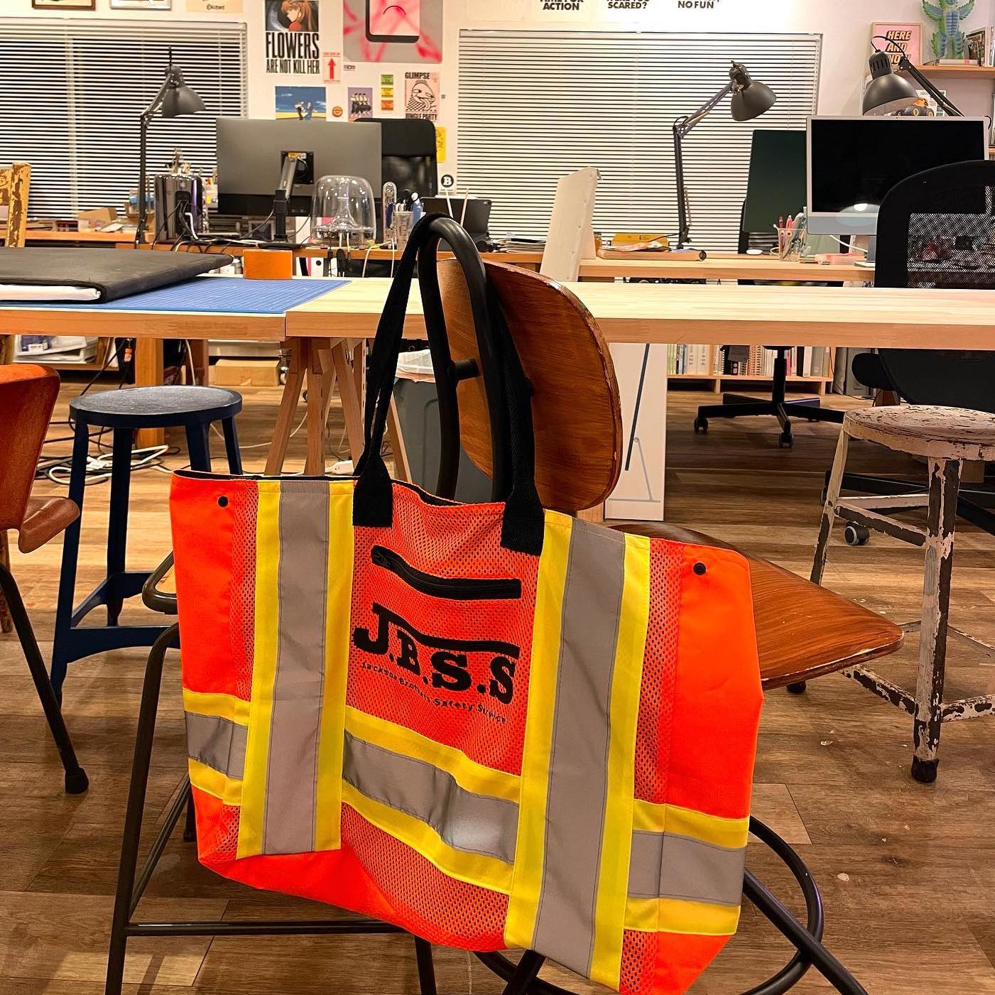 工事現場などで働く人たちが身につける、セーフティ用品のデザインが落とし込められたトートバッグ。なんでも無造作に詰め込んでワイルドに使いたくなるデザインです。工具やキャンプ道具なんかはピッタリかと思いますが、あえてタウンユースで使ってもオシャレかと思います。