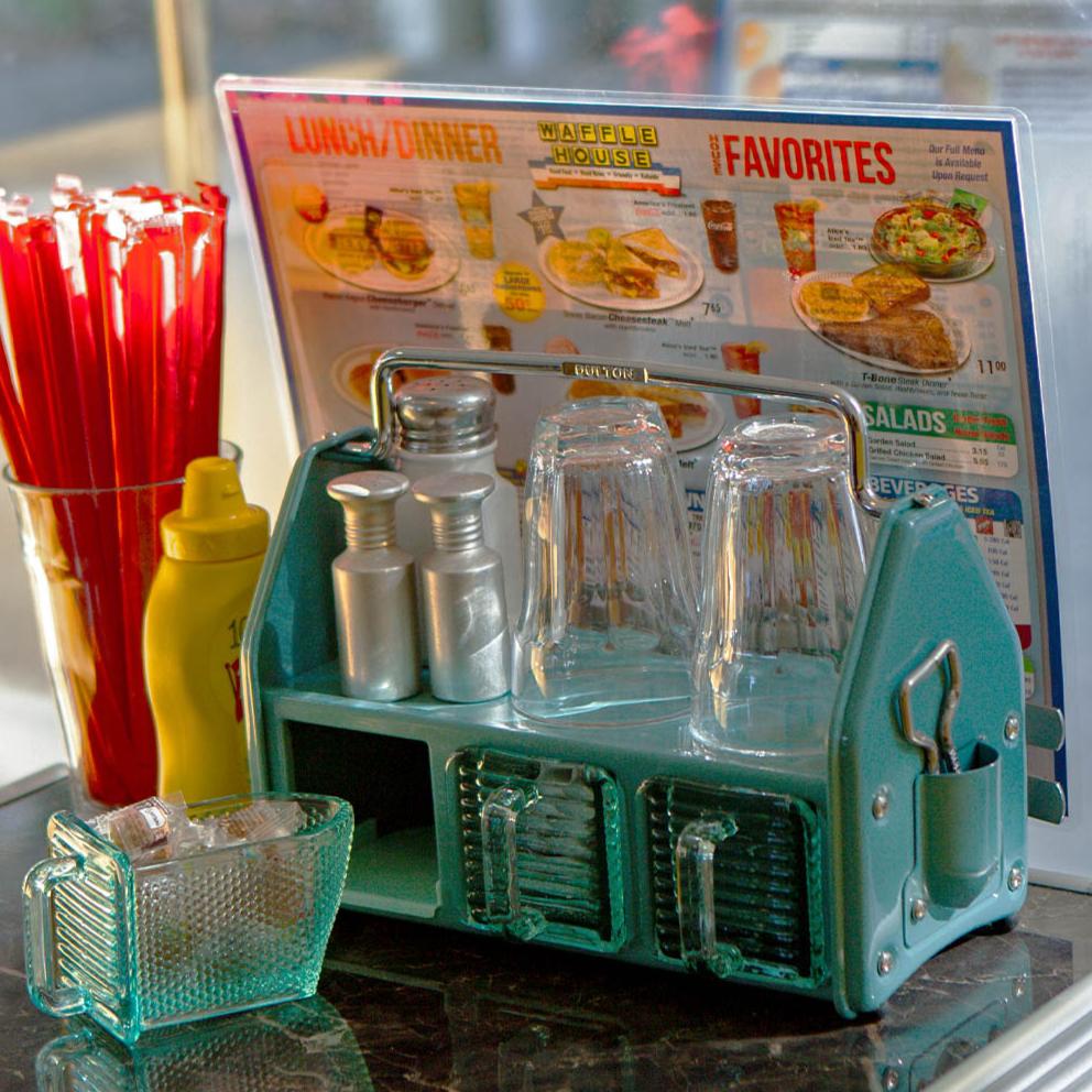 ダイニングテーブルやデスク傍に置いて、調味料や小物をまとめておけるオーガナイザー。3つのガラス容器、トップトレイ、サイドポケットと3タイプの収納スペースで構成されており、角砂糖やクリップなどの細かなものから、調味料やグラス、ペンやハサミなどの様々な形状の小物を収納できます。頑丈なスチールの枠組みと分厚く青みがかったガラス容器の組み合わせは、クラシカルでありながら新鮮な存在感も。これを置くために中に入れる小物を用意したい、そんな衝動買いも大歓迎のアイテムです。