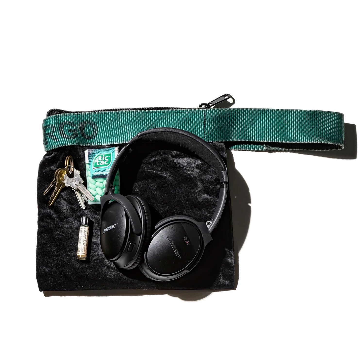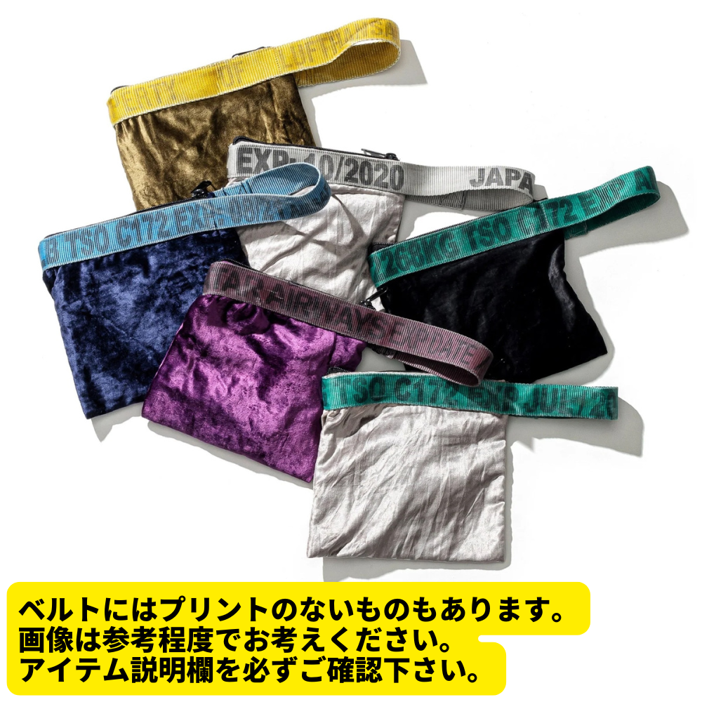 空港で使われていた貨物運搬用の頑丈なスリングベルトを使用したポーチ。内側にポケット付き。