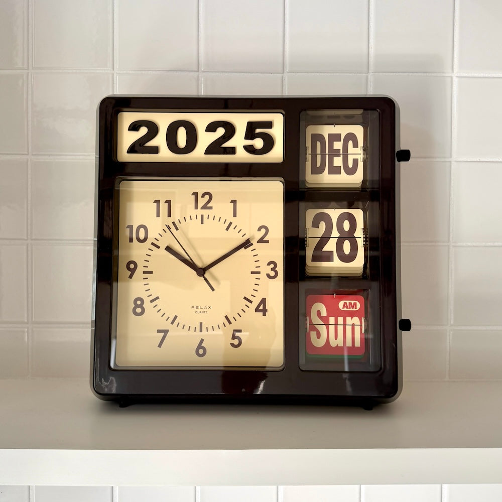 今日って何日?と思ったときに、ふと視界に入る。時間も日付もこれひとつで。でも、便利だからじゃなくて、ただここにあるだけでいいと思わせてくれる存在。少しレトロで、どこか無機質で、でも妙に愛嬌がある。そんな絶妙なバランスのカレンダークロックです。置いても、壁にかけても。空間の主役にならず、でも確実に印象を残してくれる。日付が静かに切り替わるたび、「今日はどう過ごそうか」と、少しだけ立ち止まれる。そんな存在です。
