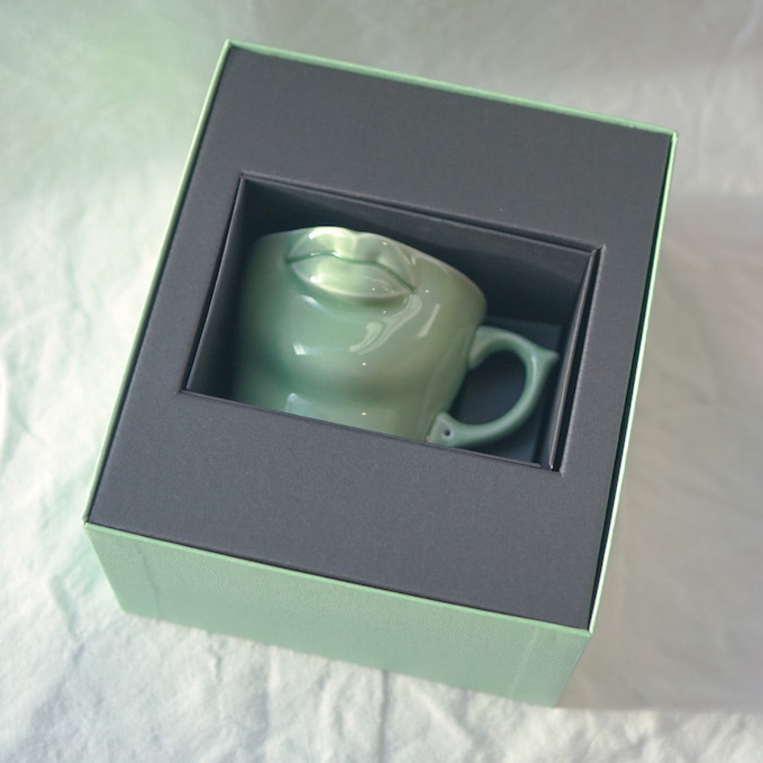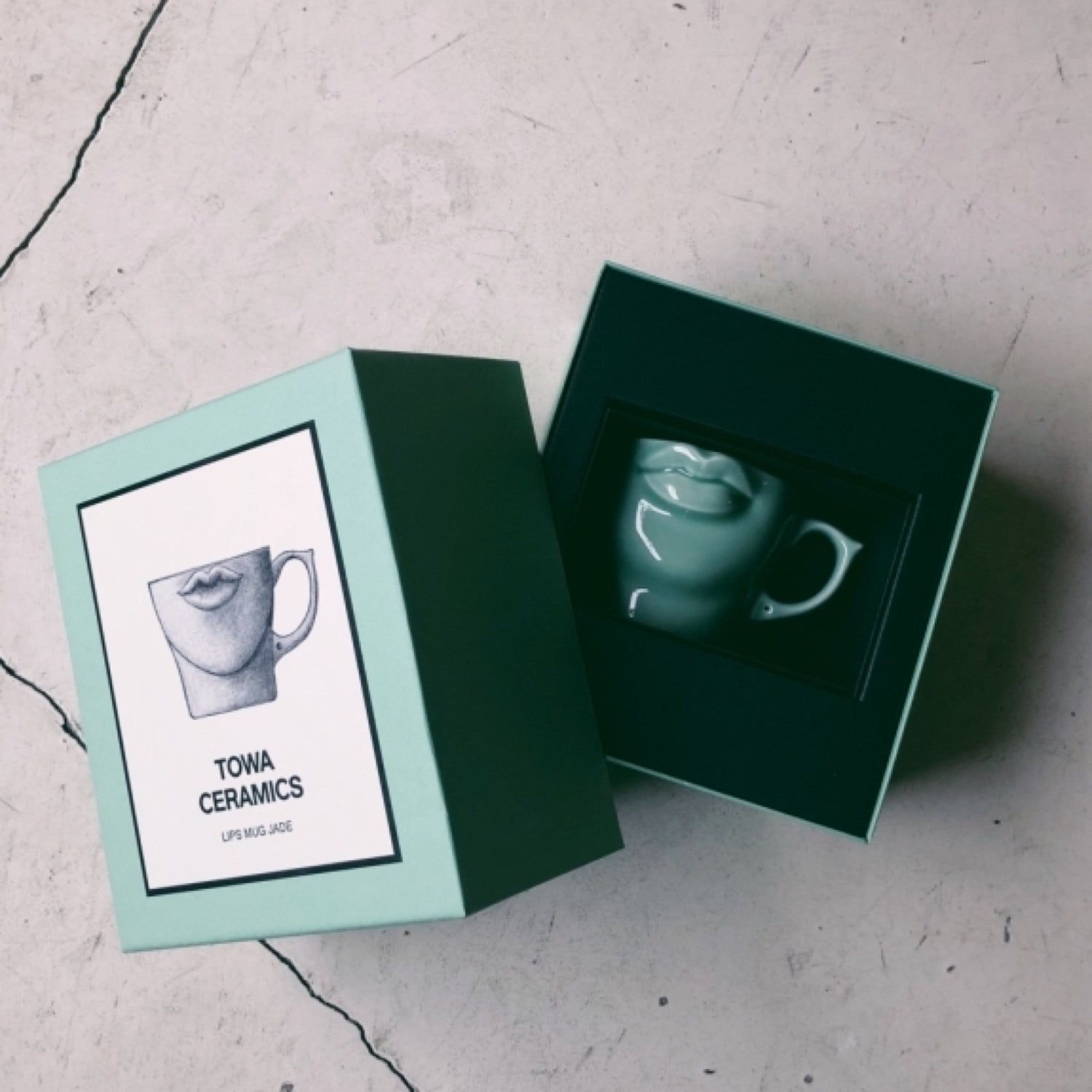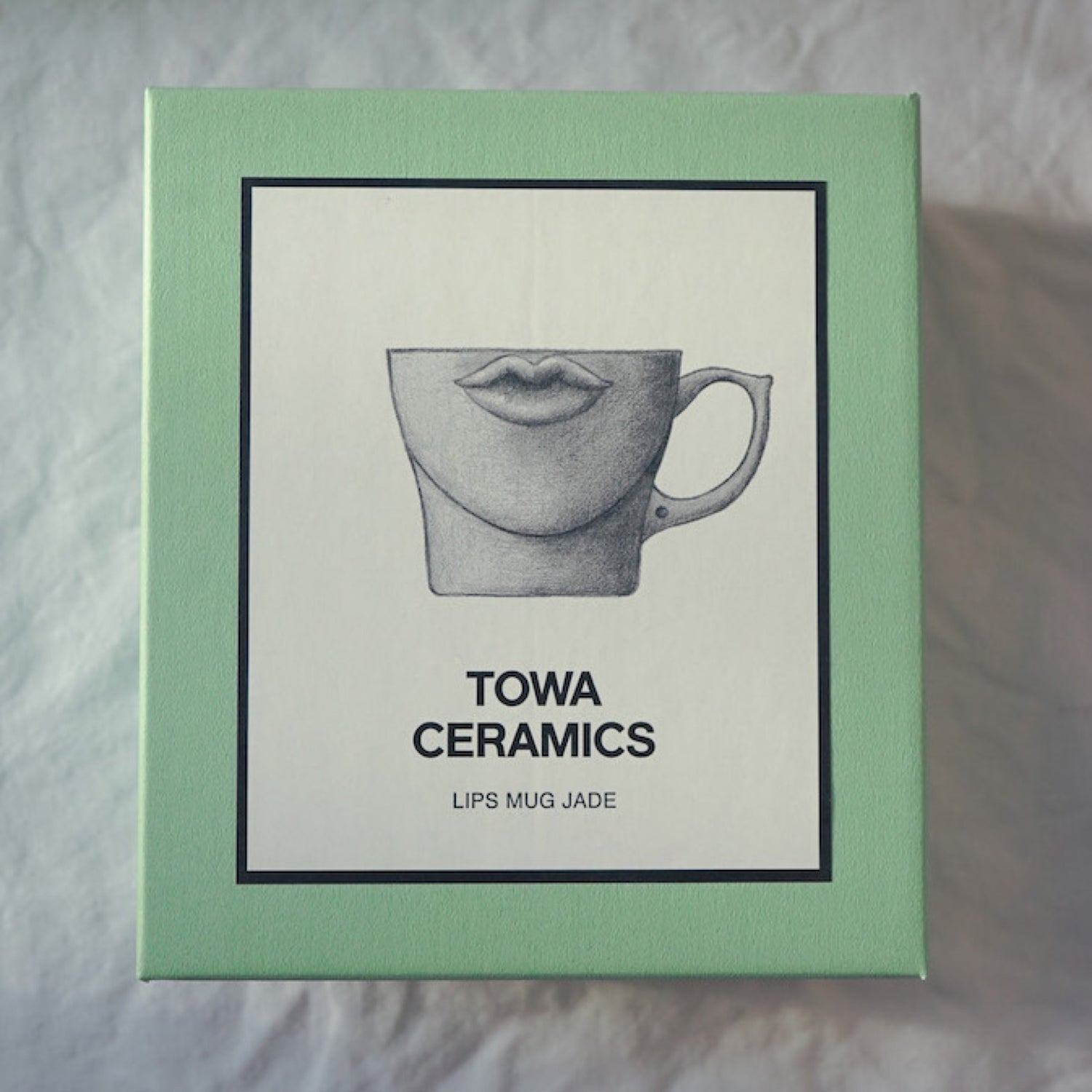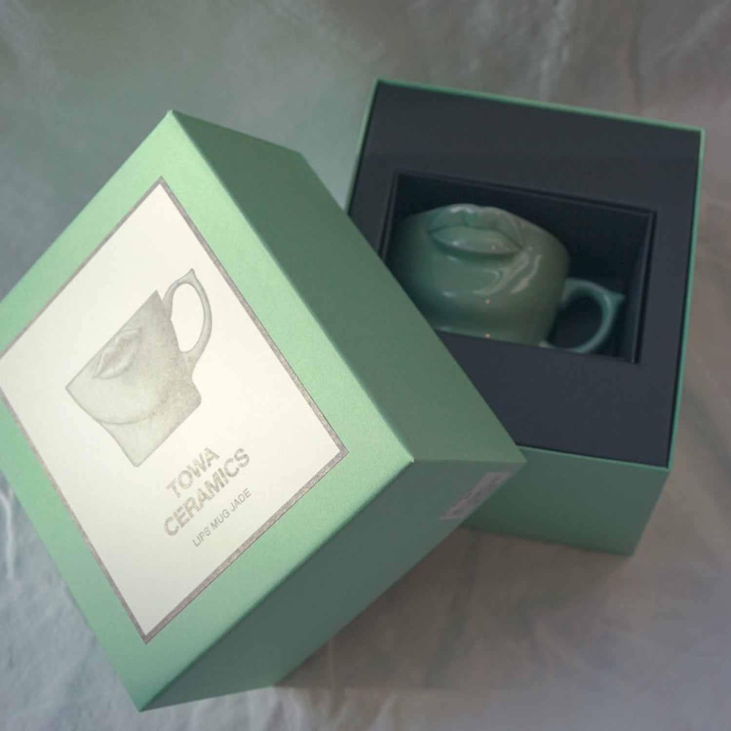 TOWA CERAMICSの代表作“LIPS MUG”。WHITE、BLACKに続く第3弾は、透き通るような淡い色合いが美しい翡翠色。このLIPS MUG JADEはベースの磁器に青磁釉を施して作られています。青磁とは、古代中国で皇帝たちのために作られたことが起源の特別な器。釉薬(うわぐすり)にわずかに含まれる鉄分が高温で焼成することにより還元され、独特の美しい色合いが生まれるのです。ほんのりと青みを帯びた淡い緑の“翡翠色”を求め、釉薬の配合を変え試作を繰り返し、理想とする色合いが完成しました。つややかな磁器肌は色を纏うことにより美しいグラデーションが生まれ、このマグのシンボルでもある唇のなめらかなシェイプが際立ちます。専用ボックスももちろん翡翠色で統一。生活に彩りを添えるテーブルウェアとしてご自宅用にはもちろん、ギフトにもおすすめです。