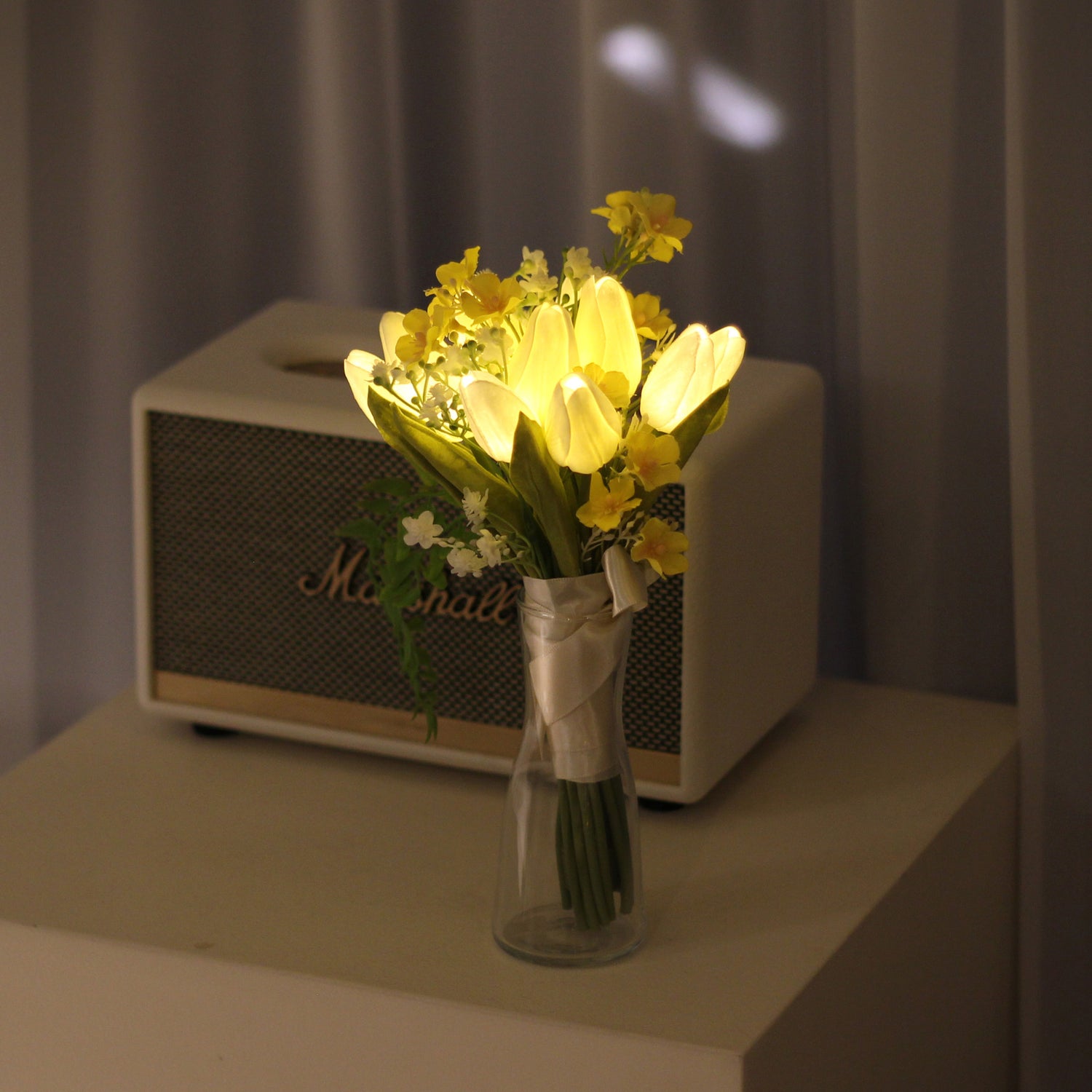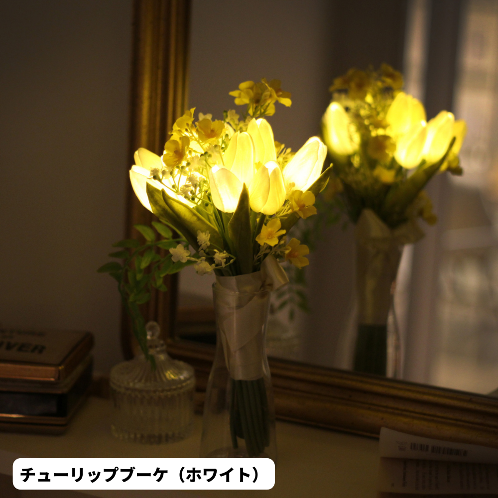 華やかなカラーのお花がスイッチ一つで優しい明かりが光ります。昼はアートフラワーとしてお部屋に飾り、夜は癒しのひとときを過ごすムードライトとしてご使用ください。