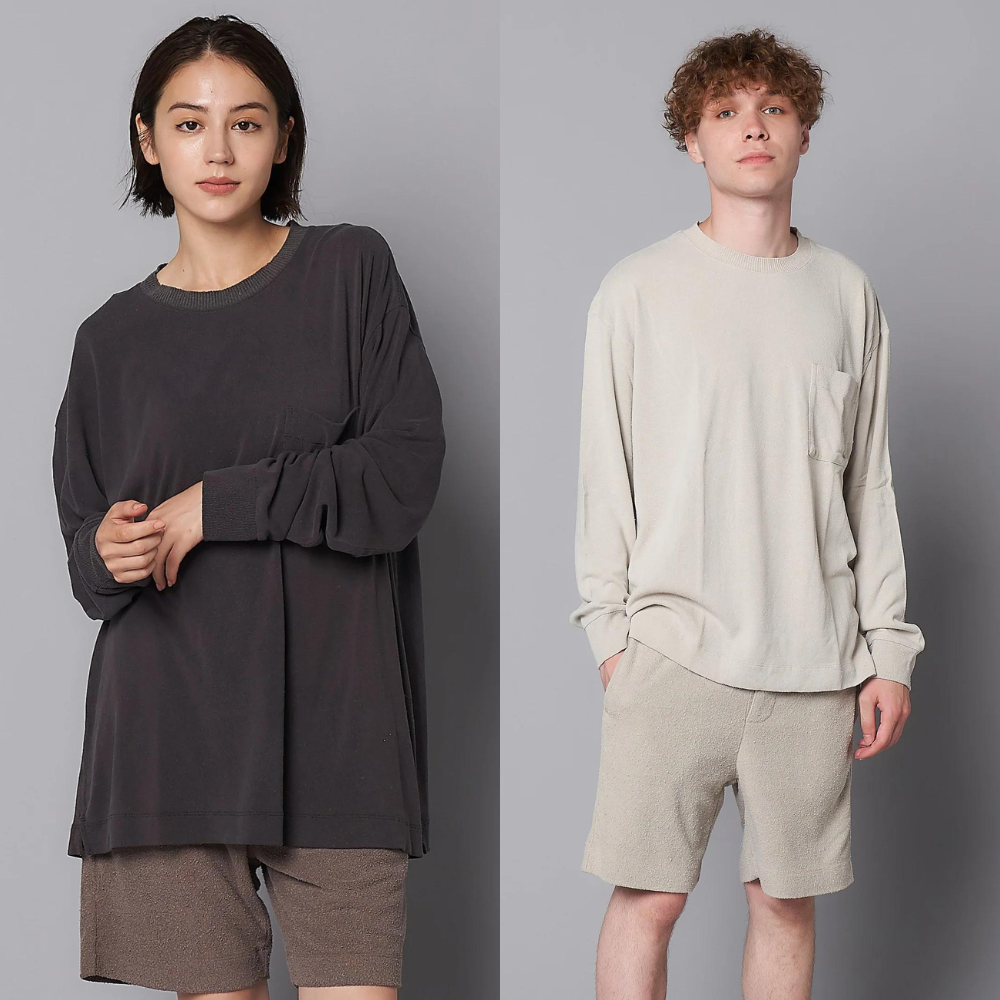 サーフィンに行くときのヘビロテ服。デイリーに、パジャマ代わりに、トラベルウェアにも最高。夏は涼しく、冬は暖かいという素材特性と、着心地と風合いが抜群に良いいから24時間これで過ごしてしまうこともある「キケンなやつ」です。「エシカル」「サステナビリティ」というキーワードがファッションでも無視できないなかで、このKIGINUが使う素材ローシルクもそんな視点から作られています。
