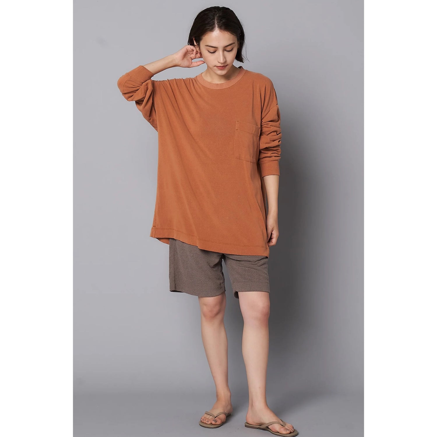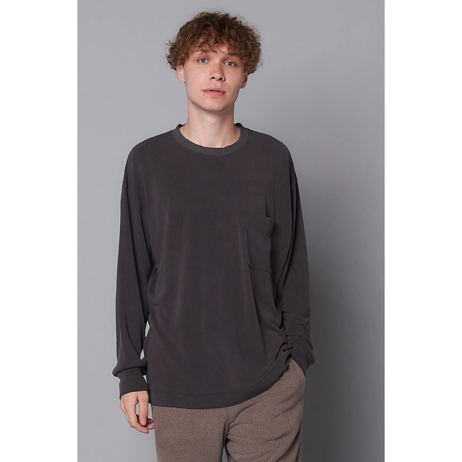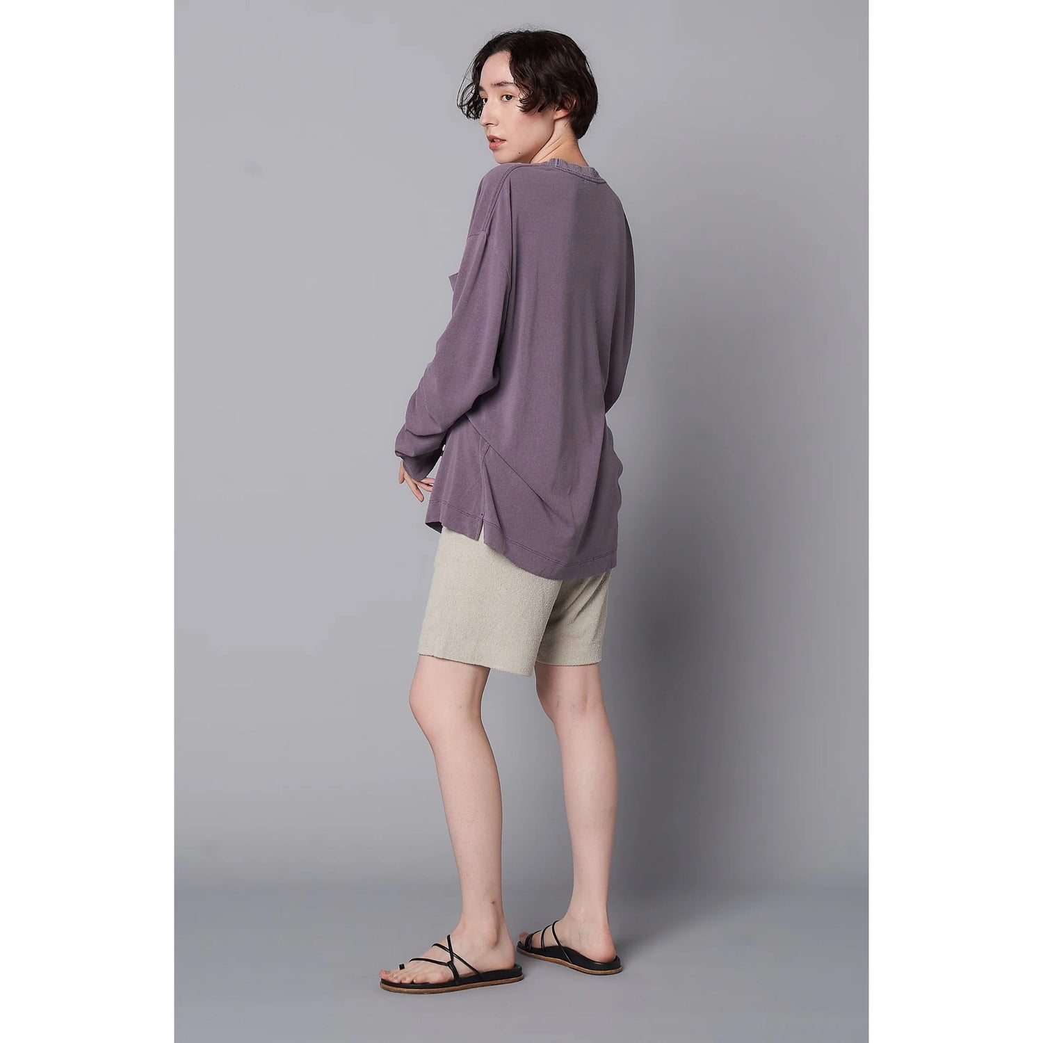 ローシルク100%のこだわりのオリジナル天竺素材。衿は横リブ仕様、緩めのシルエット。ポケット付きで裾脇には小さめのスリッドが特徴。袖口リブや脇線ステッチデザインでジェンダーレスで着られるディティールに仕上げています。カラーはシルバーグレー、チャコールの定番カラーにKIGINUにしかない褪せ感のあるパープル、男女問わず肌なじみのいいオレンジブラウンを展開。