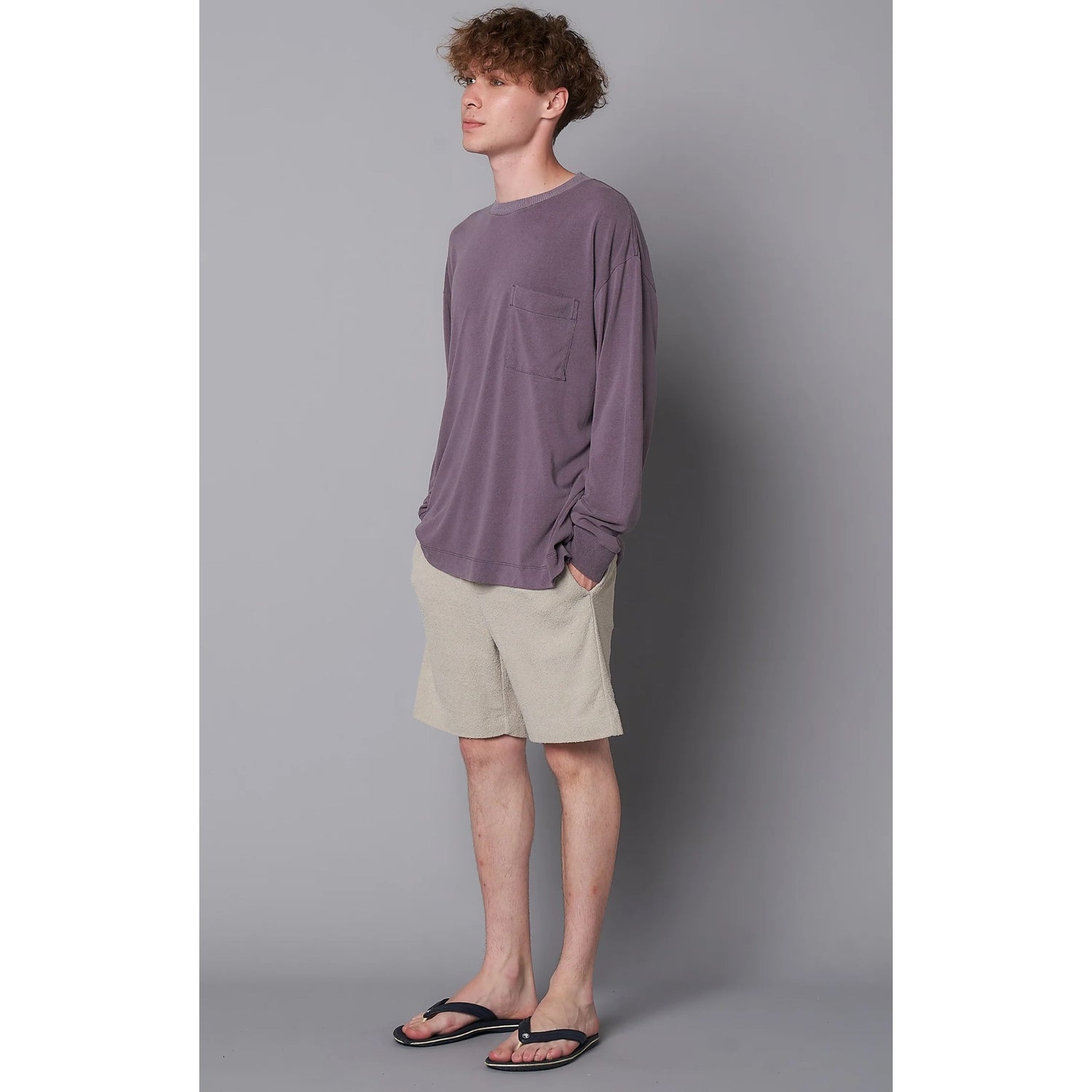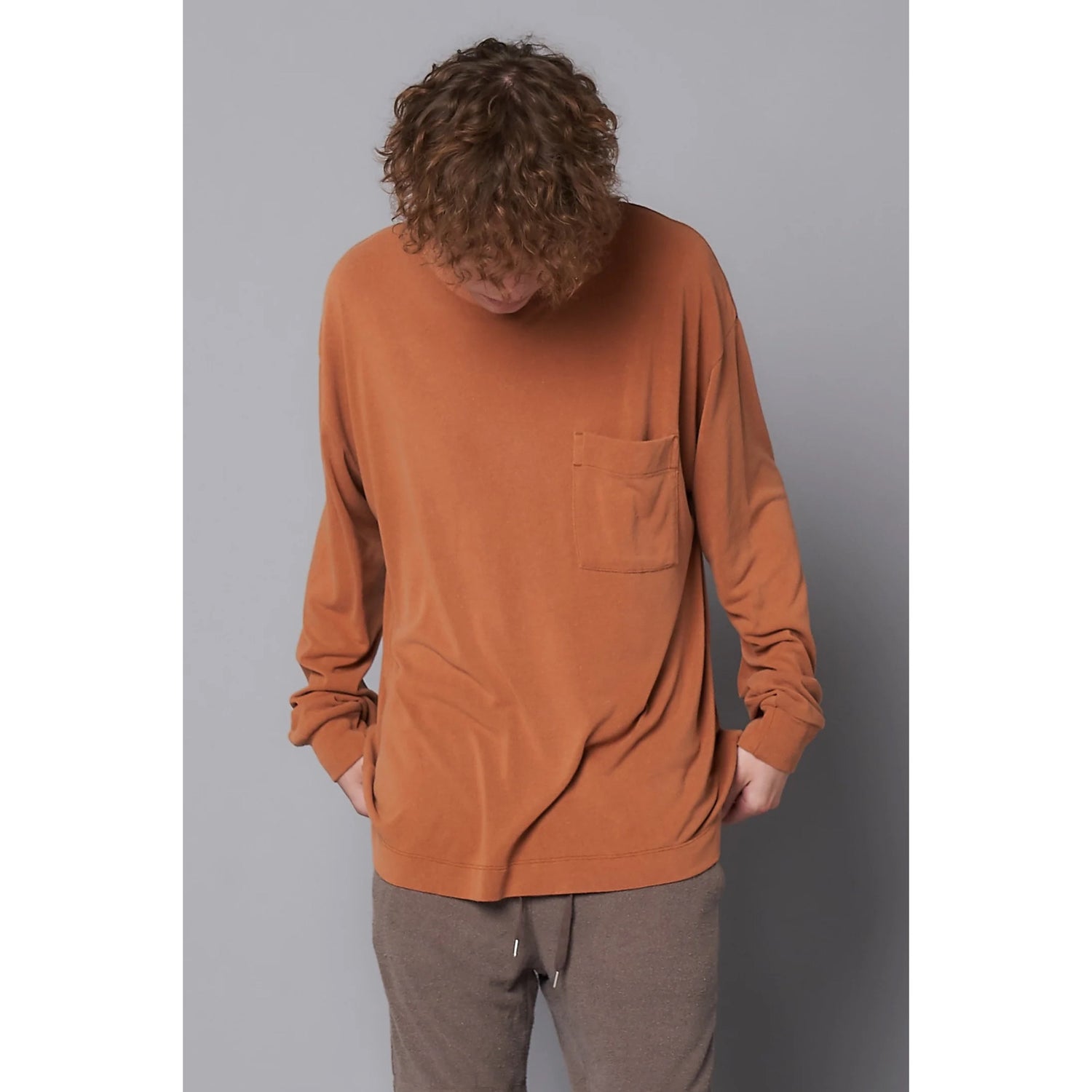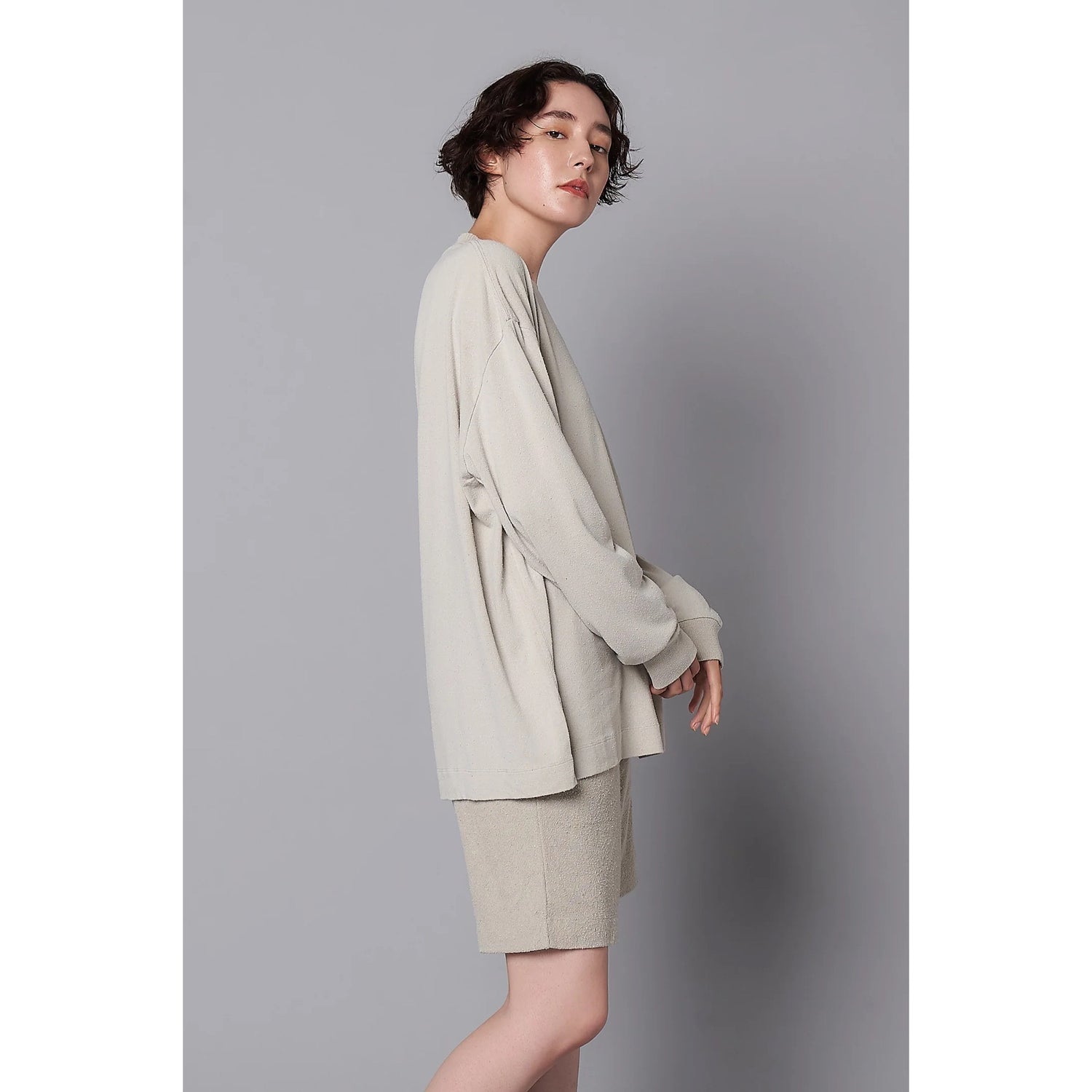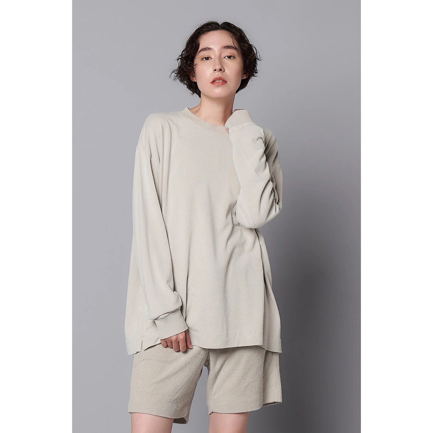 ローシルク100%のこだわりのオリジナル天竺素材。衿は横リブ仕様、緩めのシルエット。ポケット付きで裾脇には小さめのスリッドが特徴。袖口リブや脇線ステッチデザインでジェンダーレスで着られるディティールに仕上げています。カラーはシルバーグレー、チャコールの定番カラーにKIGINUにしかない褪せ感のあるパープル、男女問わず肌なじみのいいオレンジブラウンを展開。
