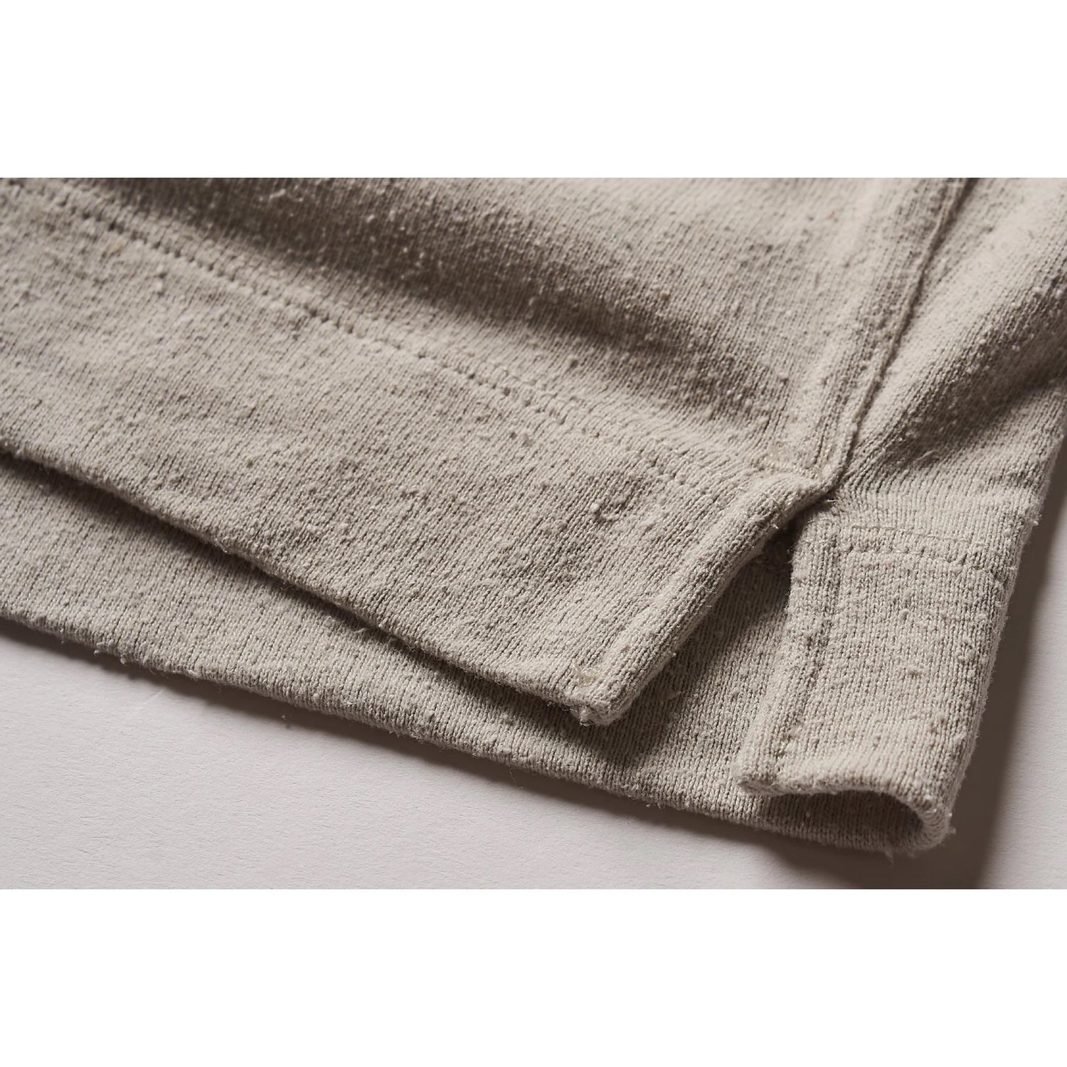 繊維の短くなってしまったシルクの糸を集め、 再度紡ぎ一本の糸にした状態のものです。 繊維が短い為、糸の太さが均一ではないのでネップといった節や玉ができる事によりナチュナルで素朴な素材感になります。本来の起源としては宗教上で殺生を避けるために、 カイコを蛾まで成長させ巣立たせた穴が開き短くなってしまった繭の繊維を紡ぎ糸としていました。現在でも同様に短くなり通常の光沢のあるきれいなシルクを作れなくなった短いシルク繊維を集め紡績することによりサスティナブルな素材として注目されています。シルク糸は通気性、吸湿性、保温性にすぐれており年中快適に着られるという特殊な性質を持っています。カイコから出来る糸は、人と同じように動物性たんぱく質で糸が形成されている為人の肌となじみやすく肌に優しいのも特徴です。また紫外線にも強かったりと女性のライフスタイルに欠かせない素材となっています。