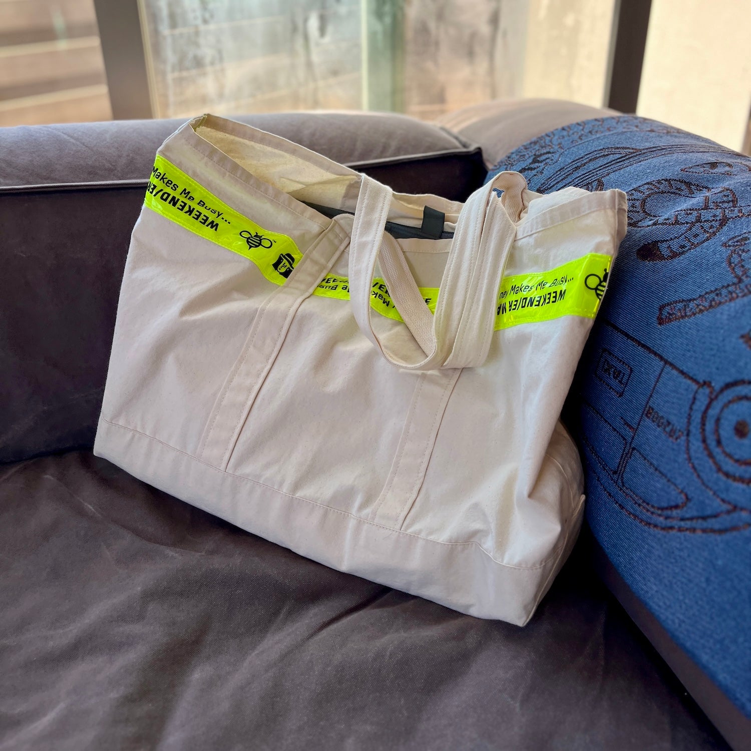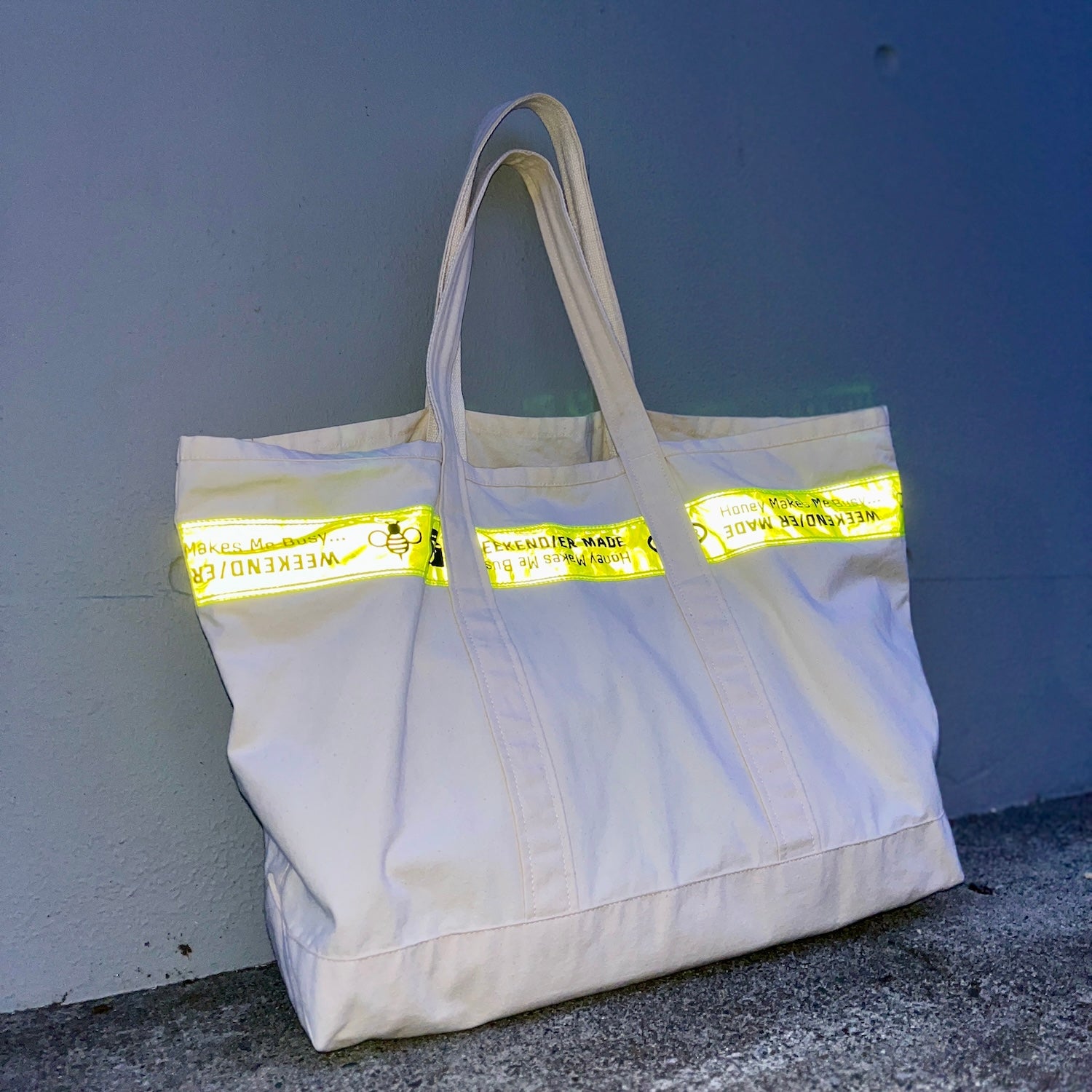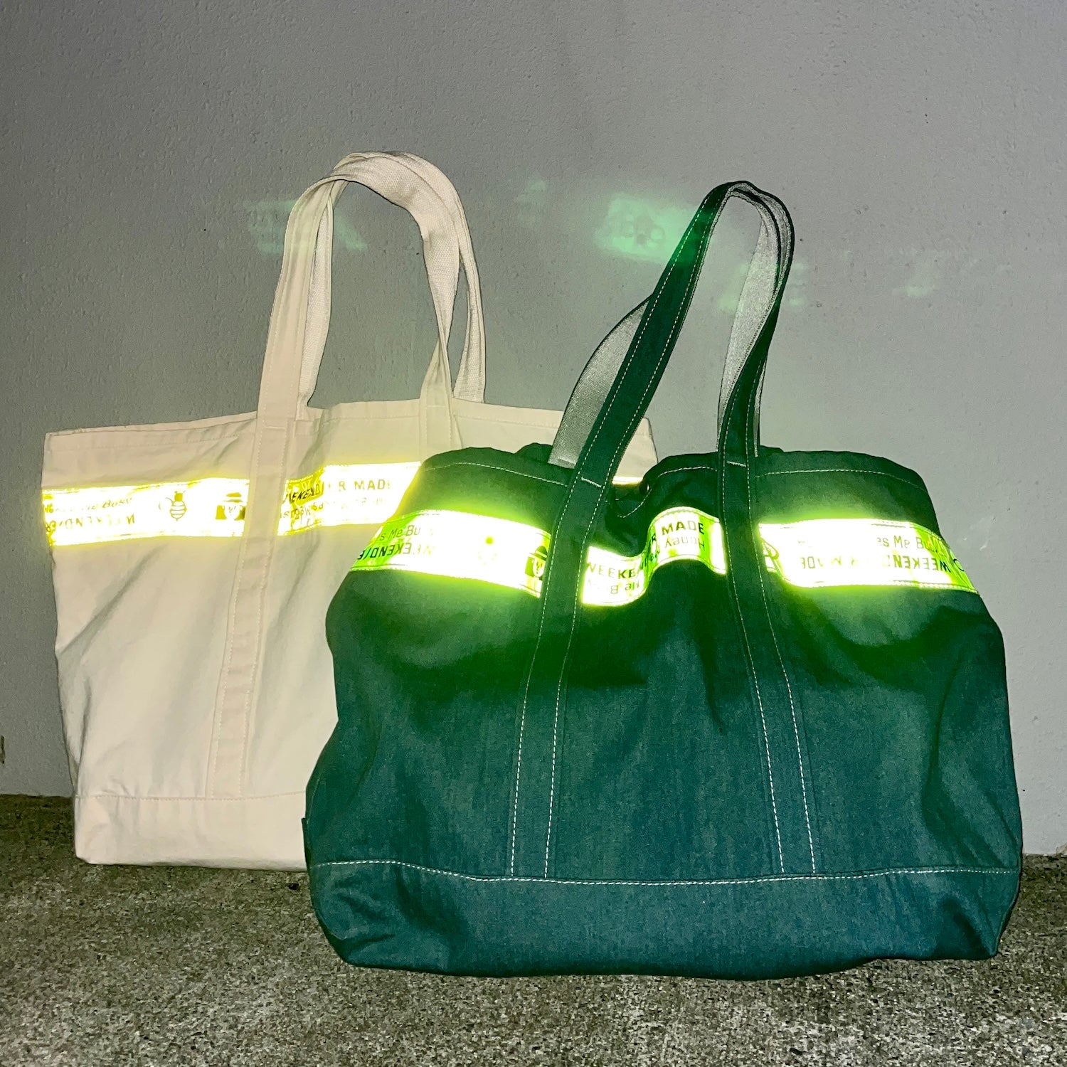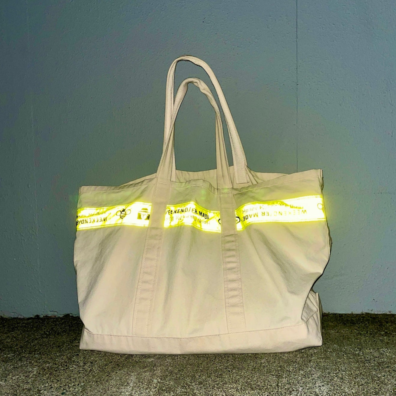 トート好きに応えるためにつくった1枚。シンプルだけど、ありそうでなかったデザイン。軽量オンスのコットン帆布に、リフレクターテープを大胆に組み合わせた、ミスマッチな素材使いが新しいトートバッグです。サイズ感はたっぷり大容量。仕事帰りのジムも、2泊くらいの旅行も余裕。内ポケットには、ウェットスーツのような合成ゴム素材を採用。タブレットやPCの持ち運びにも安心なつくりにしました。使いやすさも、価格も、しっかり優秀。新しいトートを買っても、結局これが一番使うやつでしょう。