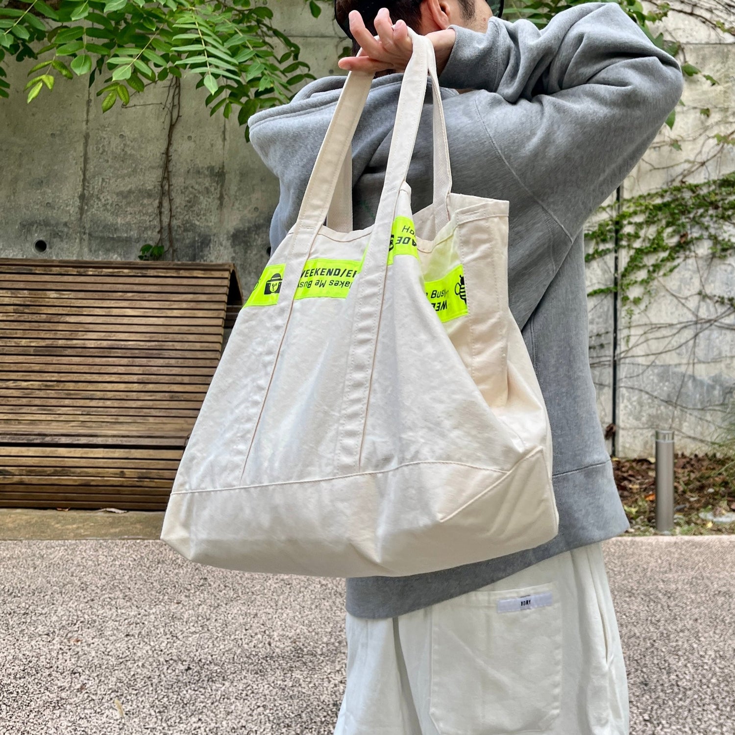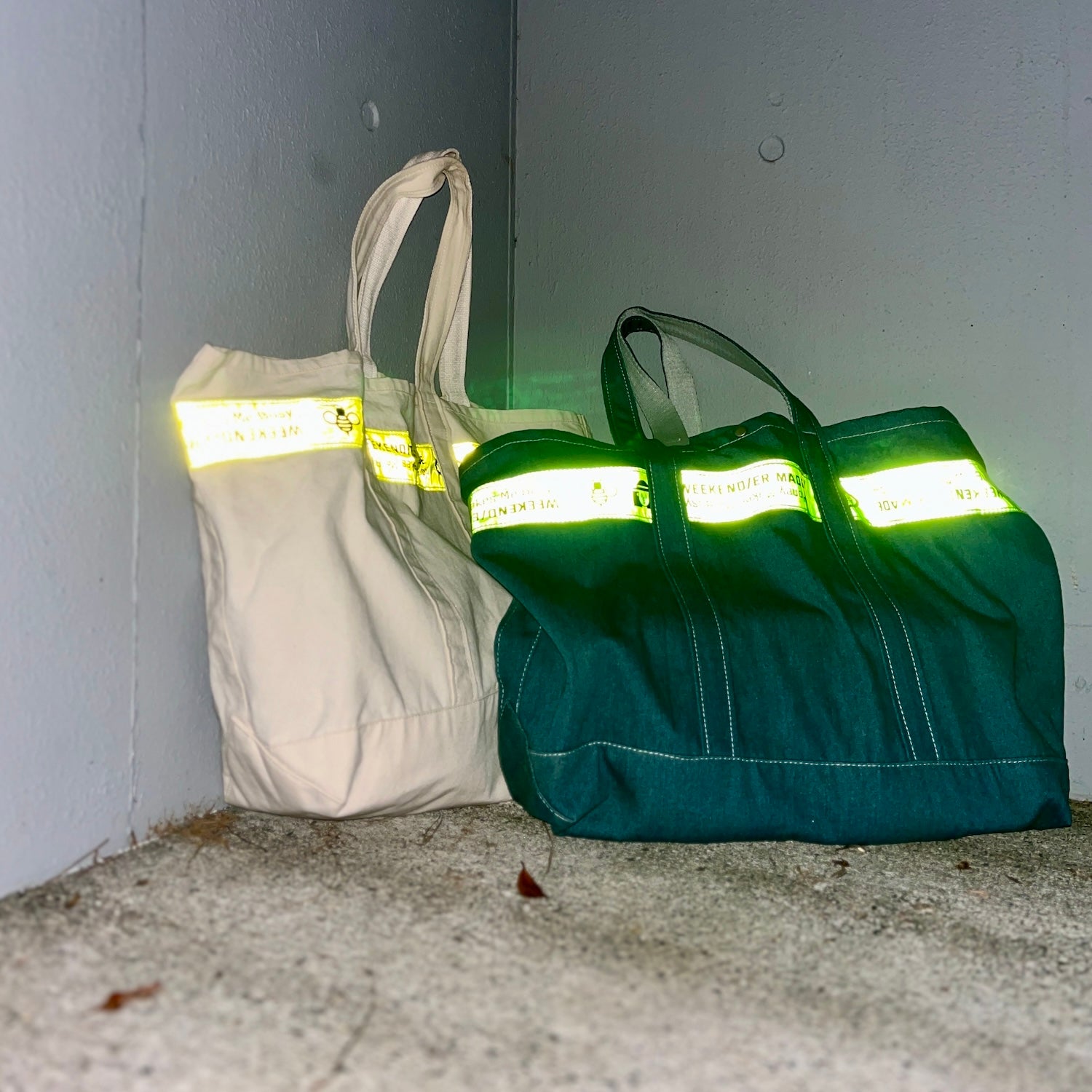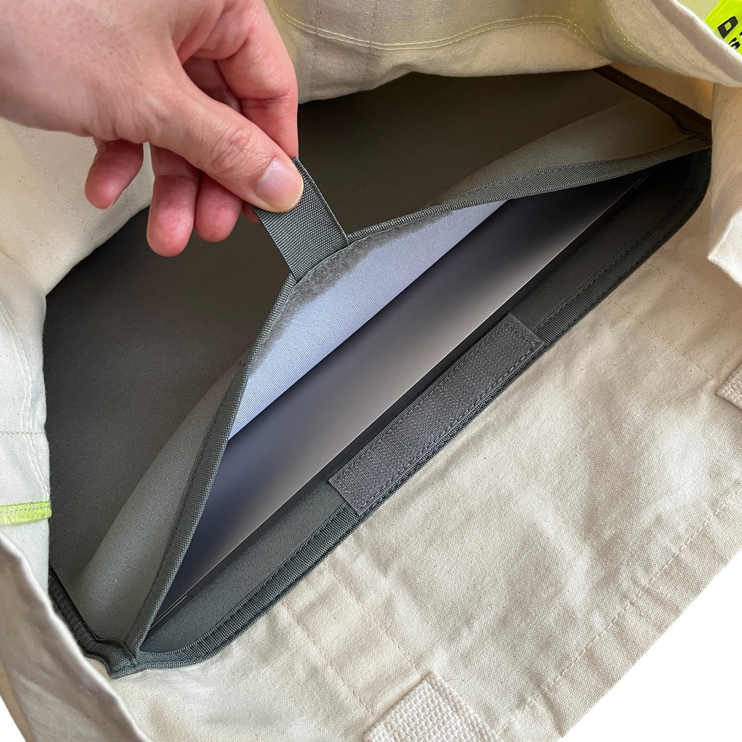 トート好きに応えるためにつくった1枚。シンプルだけど、ありそうでなかったデザイン。軽量オンスのコットン帆布に、リフレクターテープを大胆に組み合わせた、ミスマッチな素材使いが新しいトートバッグです。サイズ感はたっぷり大容量。仕事帰りのジムも、2泊くらいの旅行も余裕。内ポケットには、ウェットスーツのような合成ゴム素材を採用。タブレットやPCの持ち運びにも安心なつくりにしました。使いやすさも、価格も、しっかり優秀。新しいトートを買っても、結局これが一番使うやつでしょう。