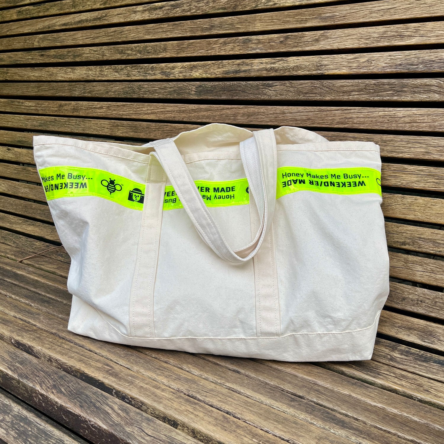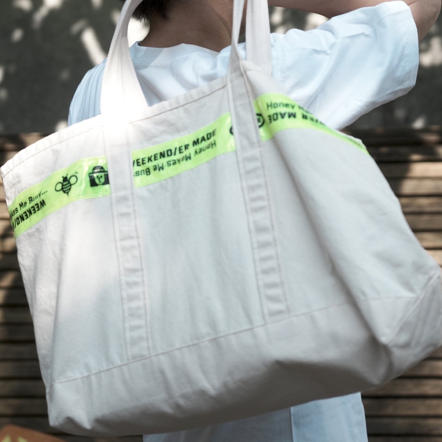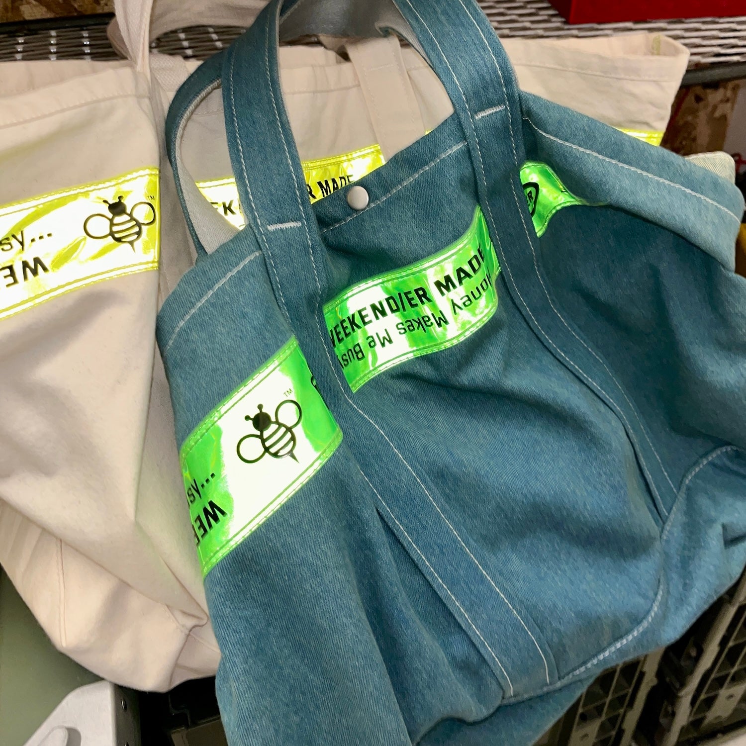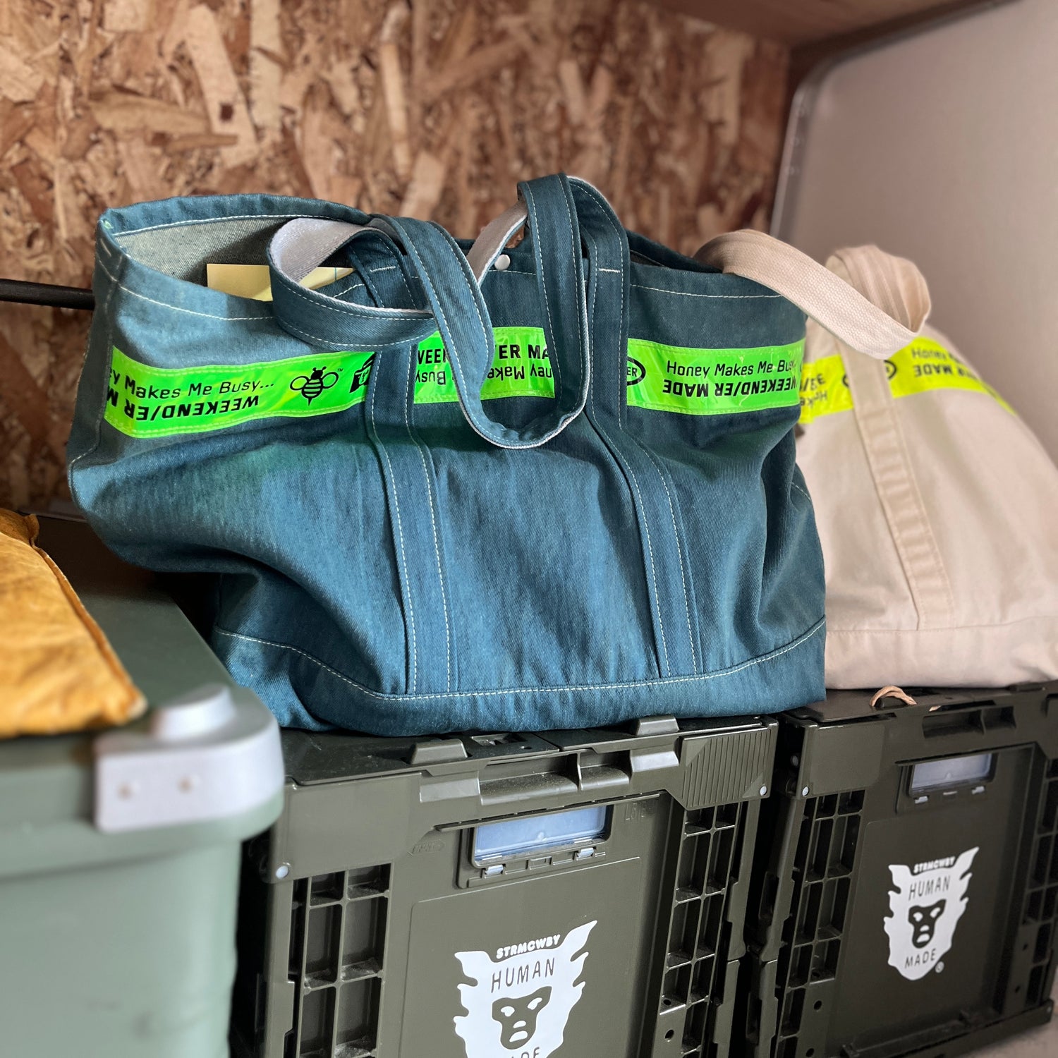 HATCHオリジナルブブランド【Honey Makes Me Busy … 】のトートバッグ。HATCH限定商品です。内ポケットはPCを完全に守るものではありません。デニムはボタン付き。