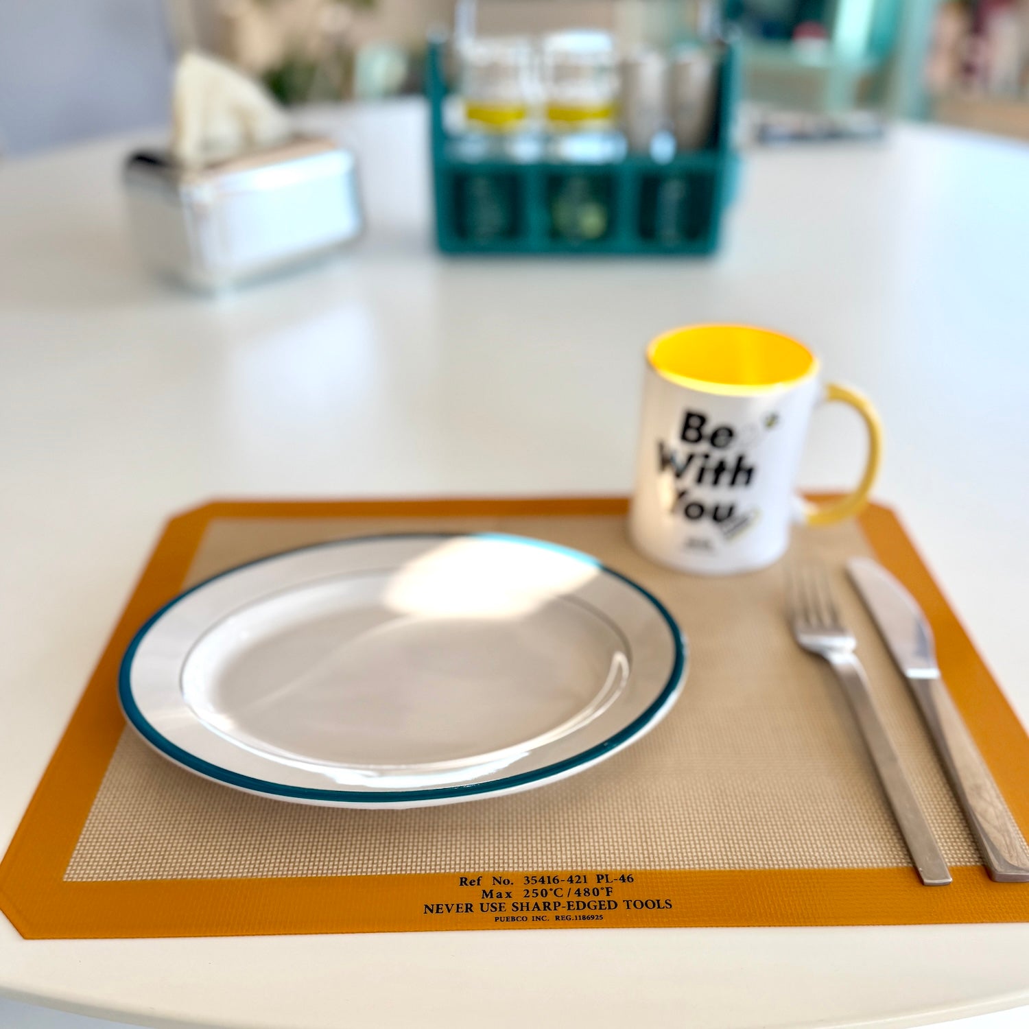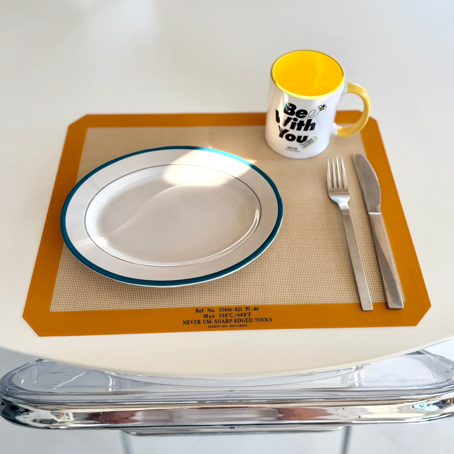 無骨なシリコン製プレイスマット。最初は完全にデザインで選びました。特に僕は黄色が好みで、テーブルに置くイメージをした瞬間からこれだ!と思って。実際に使ってみるともうそれは便利。滑りにくいし、汚れてもサッと水で洗えばすぐきれいになる。僕は穴を開けて、水で洗った後にかけられるようにしました。あとね、ランチョンマットってあるとないとで全く違うんです。テーブルが汚れないというのはもちろん、毎日の食卓がちょっと特別になる。テンション的にも絶対あった方がいいやつです。