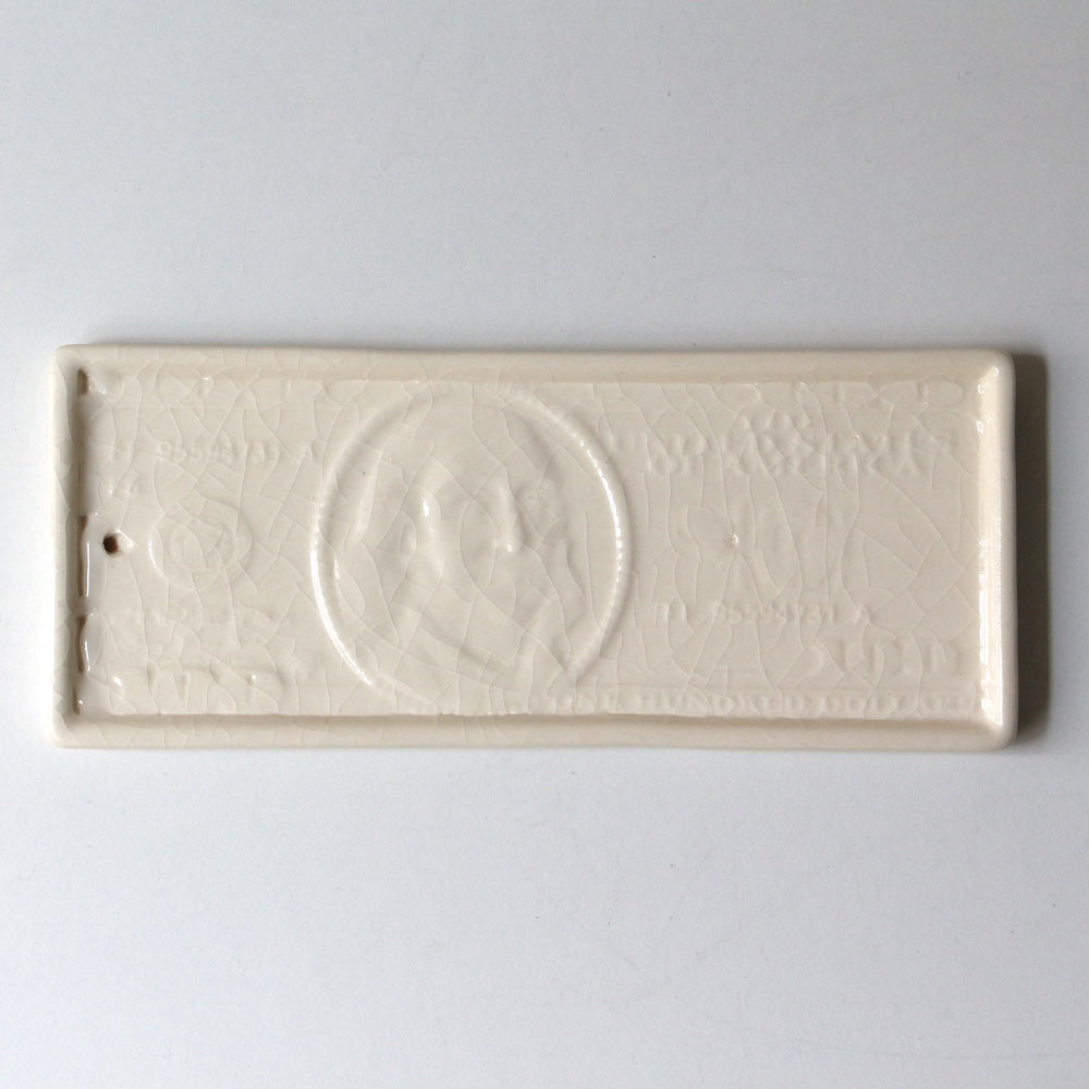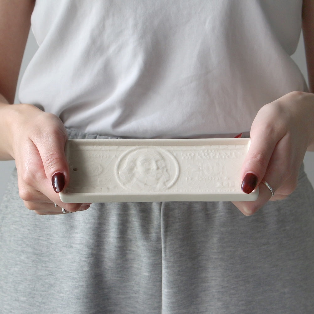 100ドル札をモチーフにしたトレイは、グラフィカルでありながら陶器ならではの温もりを感じさせるデザイン。マネートレーやアクセサリートレイとしてはもちろん、サイドのホールにインセンスを差し込めばスタンドとしても使用可能。実用性とデザイン性を兼ね備え、暮らしの中に自然と溶け込むアイテムです。陶磁器に現れる貫入(かんにゅう)という仕上げをトレイに落とし込んでいます。釉薬と素地の収縮率の違いによって焼成時に自然に生まれる細かなひび模様は、氷が割れたような繊細さや、時を重ねた絵画のような表情を持ち、ひとつとして同じものはありません。釉薬の層に奥行きが生まれ、透明感のある美しい仕上がりと、静かな存在感を宿します。