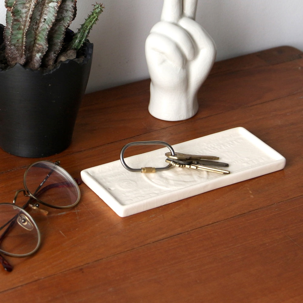 100ドル札モチーフなのに、嫌なギラつきがない。陶器なのに、いかにも感がない。デザインと素材感の間にある、このちょっとしたズレが気になって手に取った、お香スタンドにもなるマルチトレイ。表面には細かなひび割れのような表情があって、聞けば貫入という仕上げらしい。使い込んで出てきそうな表情が、最初からある。ひとつとして同じものがないのもまた惹かれる。100ドル札モチーフって、ポップカルチャーのアイコンでもあるので、HATCHユーザーでも好きな人多いと思うんだよね。ただ、この手のモチーフってToo Muchなものも結構あったり。その点、これは陶器。でも貫入仕上げだから土っぽくもなりすぎない。モチーフの強さと素材の温度感、その間のバランスがかなりいい。マネートレーでもいいし、鍵でも、アクセサリーでも、メガネでもいい、インセンススタンドにもなる。ちなみに短めなお香しか使えないので、INCENSE / THE FLAVOR DESIGN®︎がおすすめ。何を置きますか?そんなの後から考えればいい。