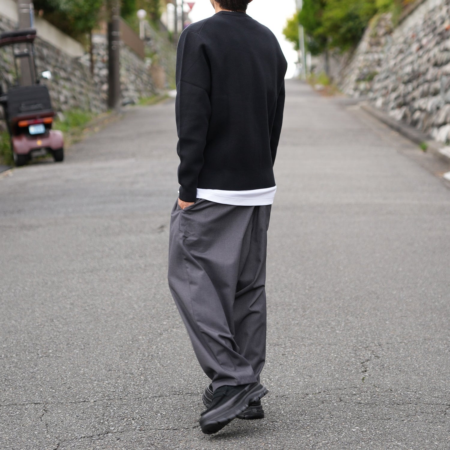 シルエット最高、履き心地抜群で、真夏以外は毎日履いている”やみつきパンツ"。おかげさまでメーカー在庫も無くなってしまい再販がいつになるかわからず……であればHATCH別注作ってしまえ!ということで作っちゃいました。素材は、とろみがあってシワ感の少ないきれいめなポリエステル×レーヨン。色は、どんなカラーとも合わせやすく、ラフに着てもなぜか上品な雰囲気が出るチャコールグレイ。右前にDカンを付けたので、鍵をじゃらじゃらさせるのも良いでしょう。ゆったりとしたリラックス感のあるフォルムが最高で、だらしなく見えることはなく、程よく力の抜けたバランスに仕上がります。履き心地はどれだけ説明しても実際に試してもらわないとわからないのですが……マジで良い!じゃなければ別注しません!コスパ最高!着用画像は僕で、171cm・59kgです。身長178cmの友人も履いてくれてますが、シルエットバッチリでした。