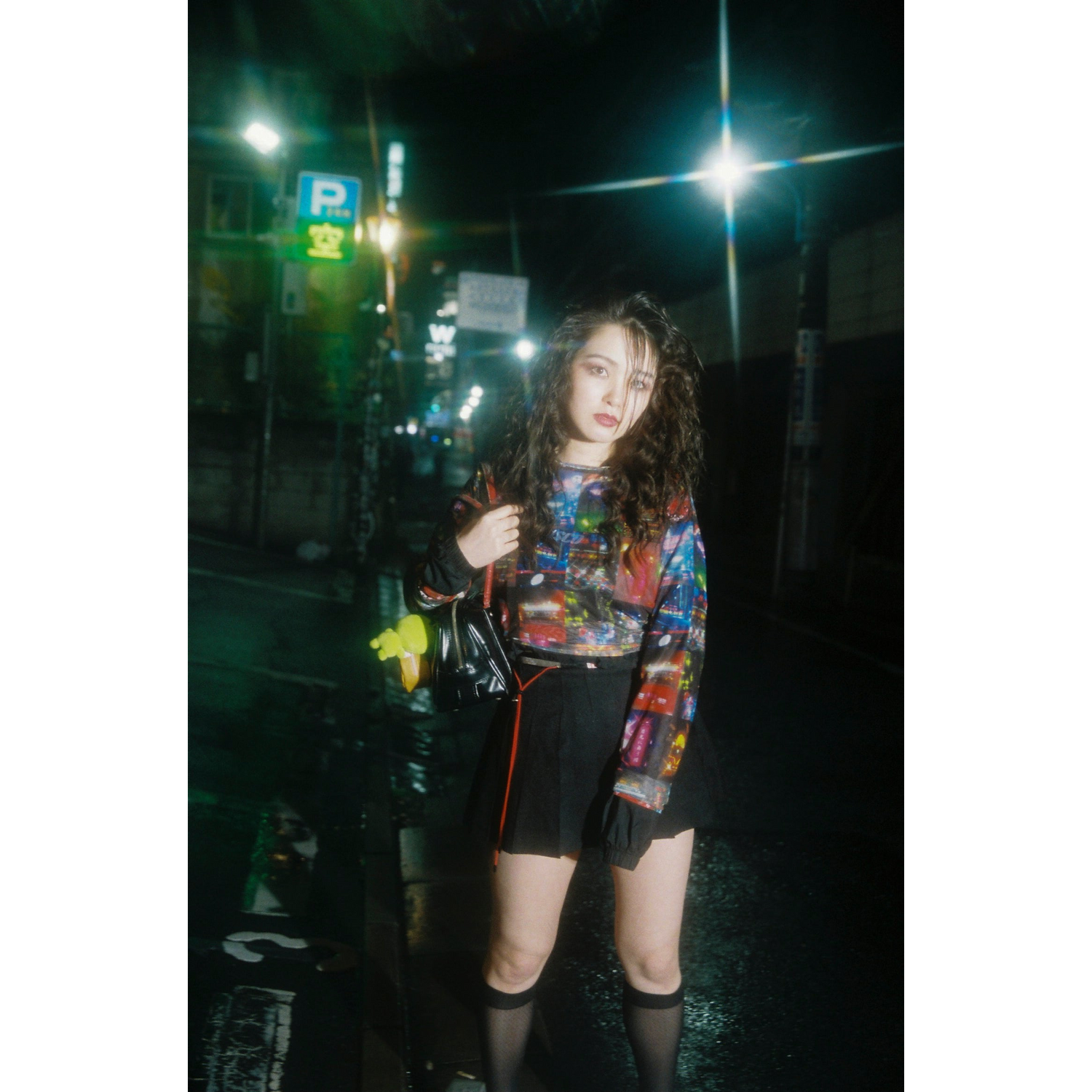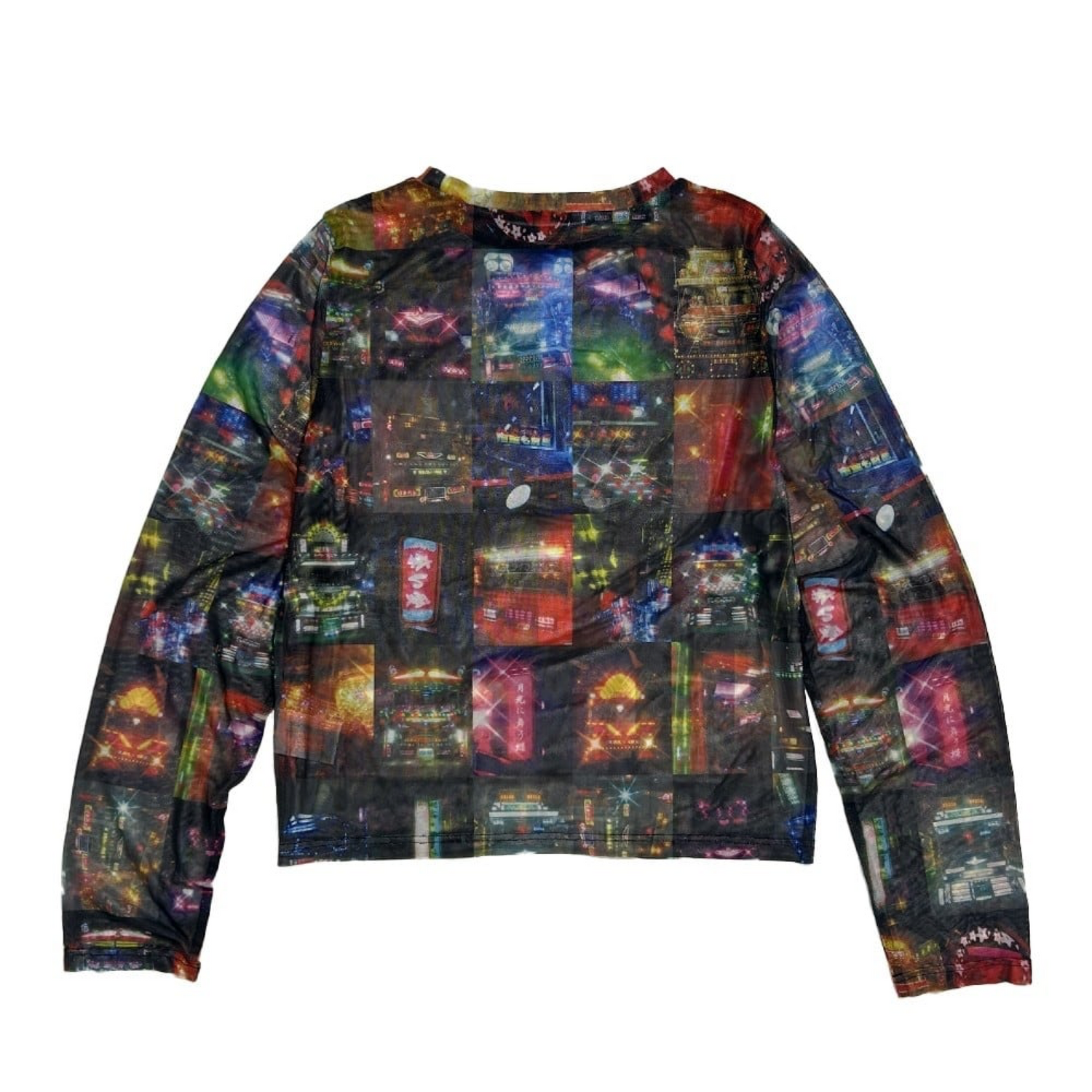 デコトラの写真を集めて総柄にしたシアートップスです。こちらもYURIHORIE自身が撮影した写真を使用しています。Tシャツの下に重ねるスタイルとも相性がよく、ユニークで他にはないデザインが魅力です。