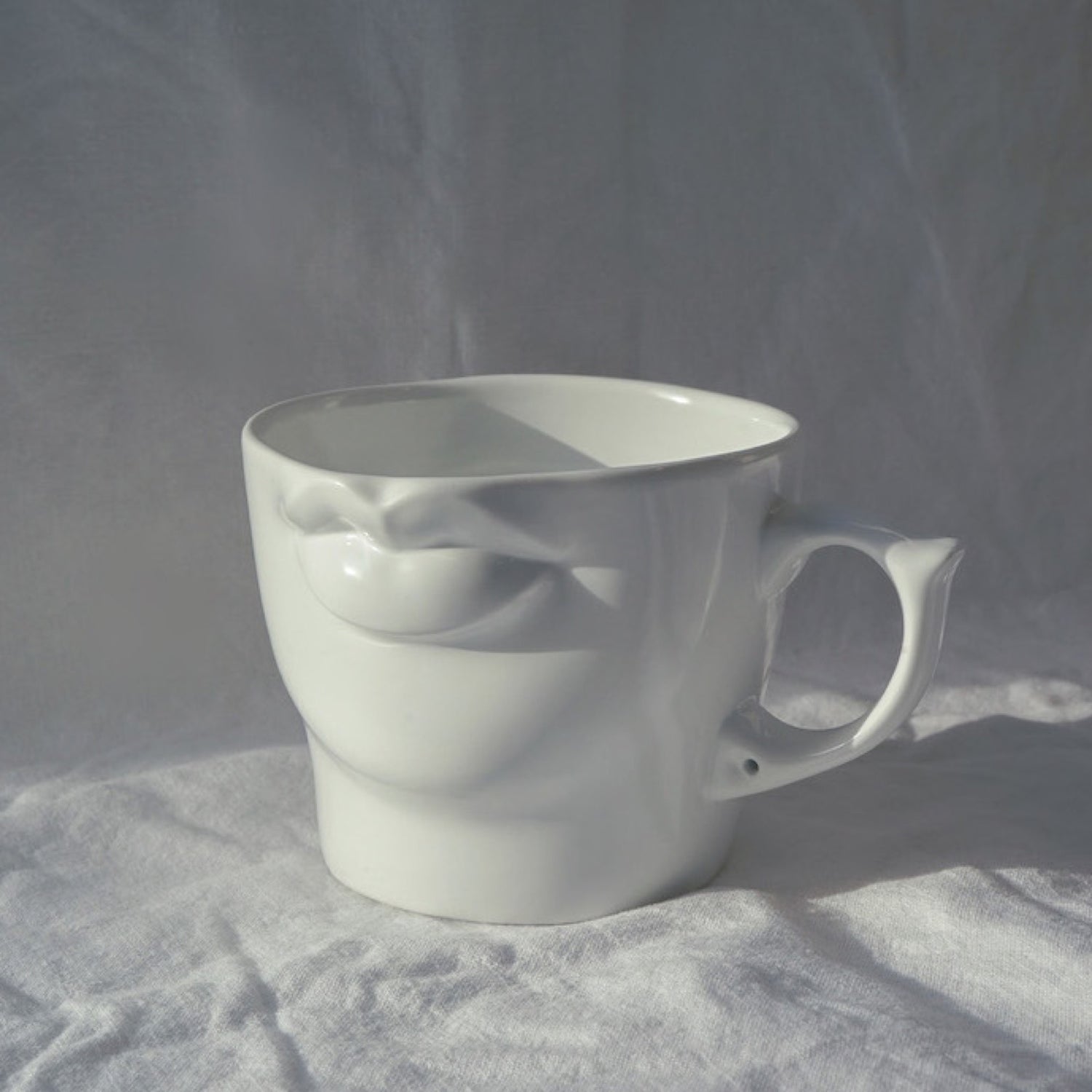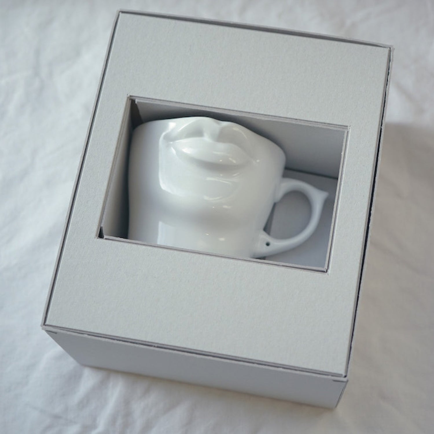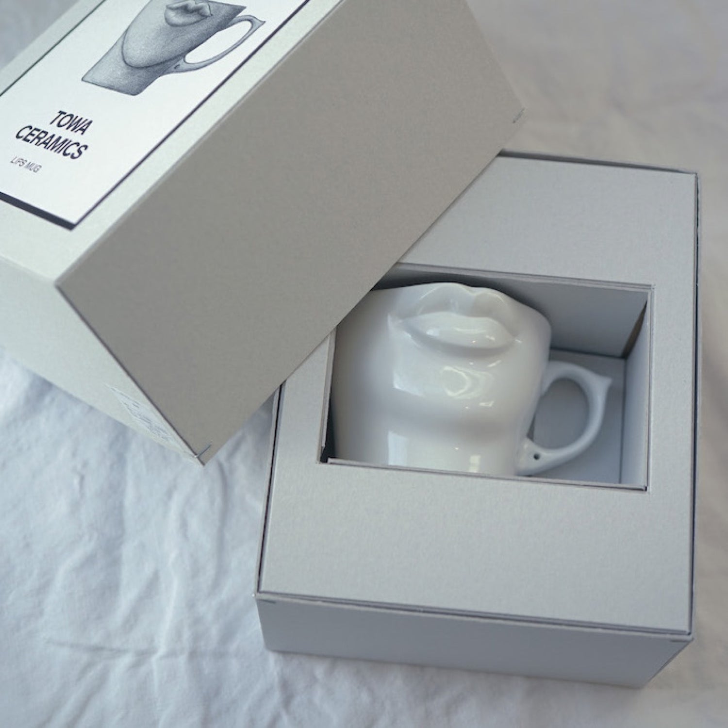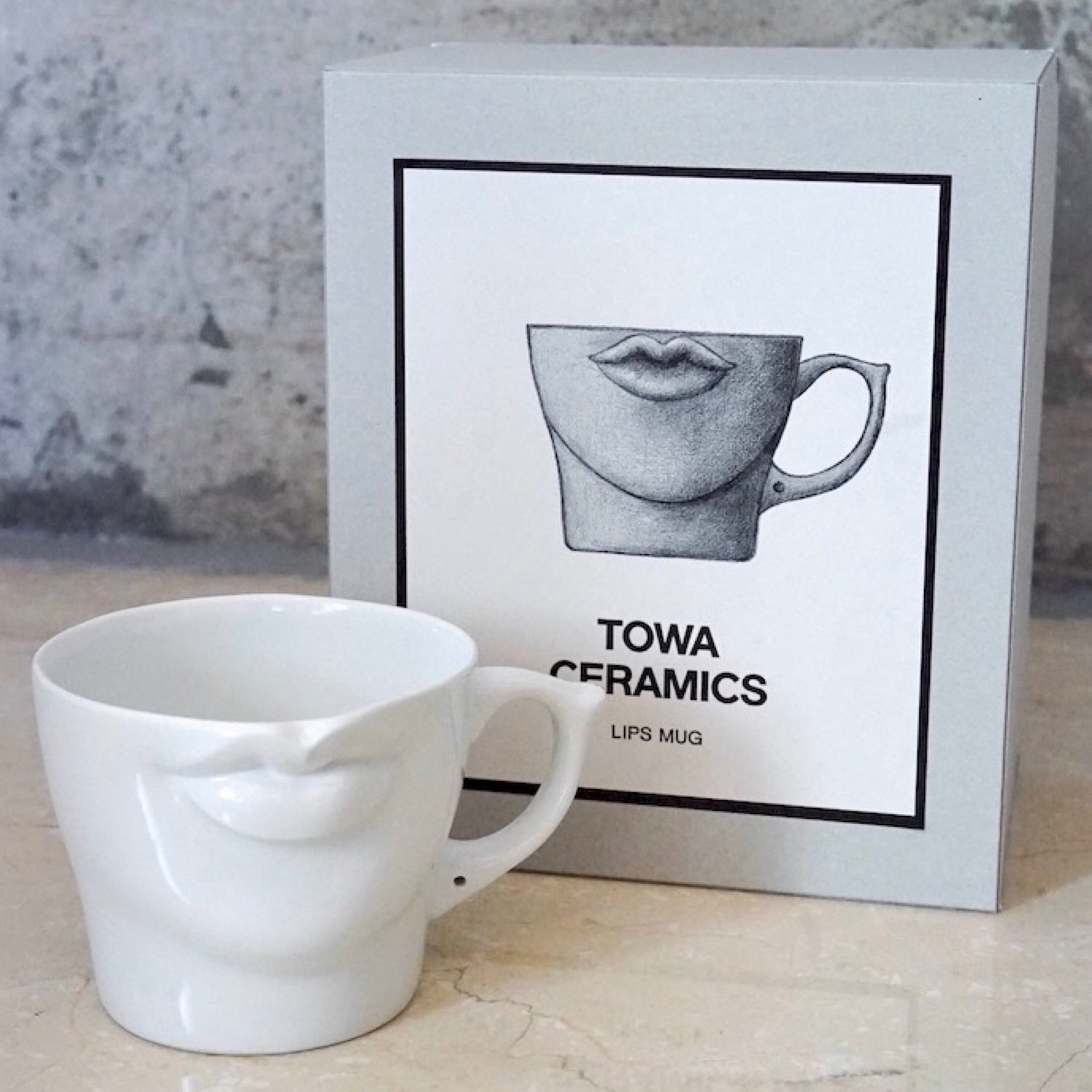 このLIPS MUGは波佐見町から少し車を走らせたところに工房をもっていらっしゃる原型師の野口さんが、なんと84年(32年も前)にデザインされたもの。初めて野口さんの工房を訪れた際、このマグの原型となるカップでコーヒーを出された時にそのあまりの美しさに一目惚れをして、これをリプロダクトさせて欲しいとお願いし快諾して下さったのがTOWA CERAMICSの皮切りでした。新たに野口さんが原型を起こし、小振りだったオリジナルから、たっぷり入る350ccサイズに変更し今の形が生まれました。彼の手によってつくり出された唇は、口をつけると驚くほどフィットし滑らかに液体が口の中へ運ばれます。釉薬は、美しい人の肌の質感をイメージしすこし青みがかった乳白色に仕上げました。耳を連想させるマグの持ち手にはピアスの穴が。これも1984年当時のデザインそのままです。日々の食卓のアクセントに、贈り物に。オーナメントやペン立て、花器として、その存在感とどこか神秘的な佇まいは色んなシーンにすこしの違和感とユーモアを与えてくれるでしょう。このマグに合わせて作られたボックスはそのまま贈答用としても。表に描かれたデッサンは野口さんが原型を作られる前に描かれたものをベースにデザインしました。