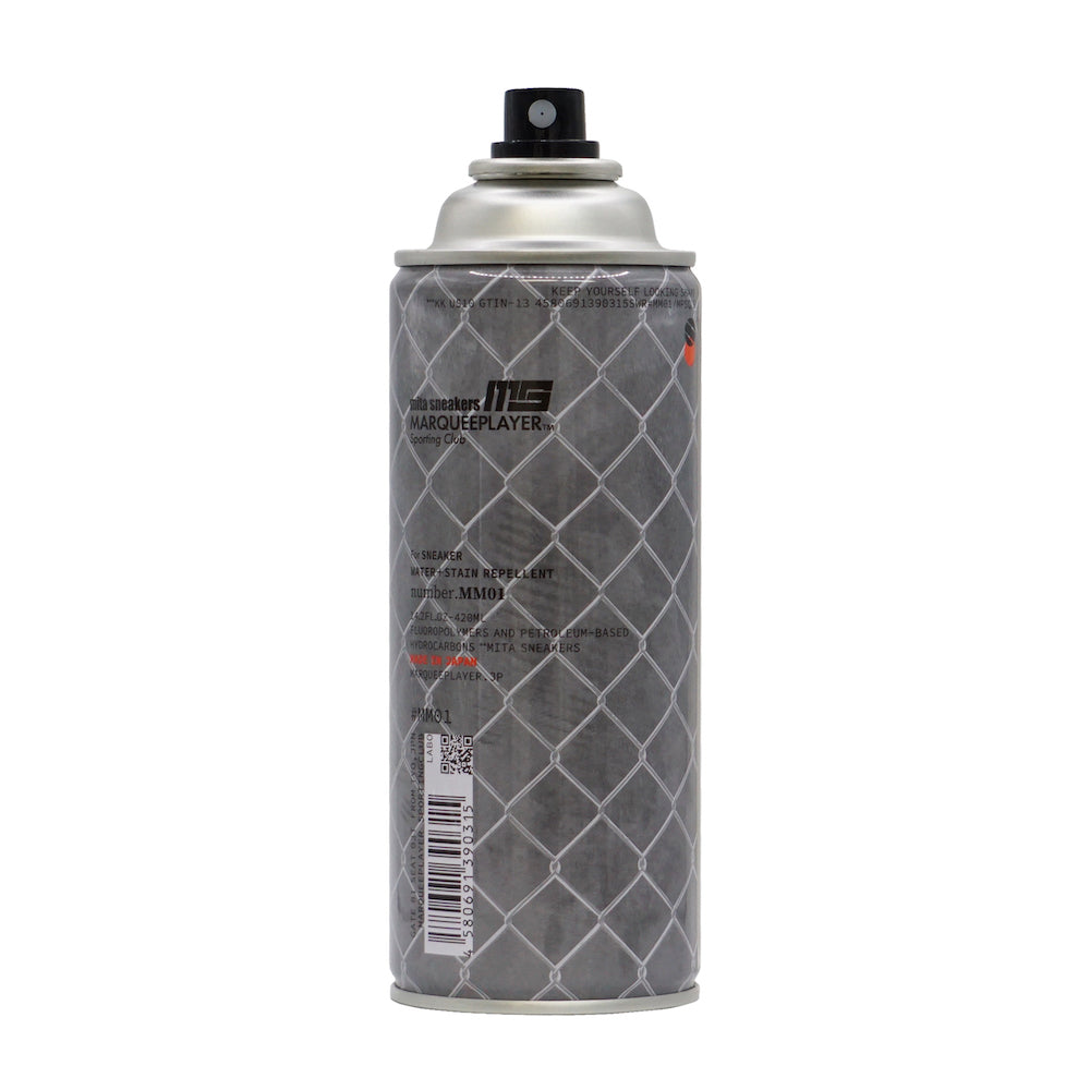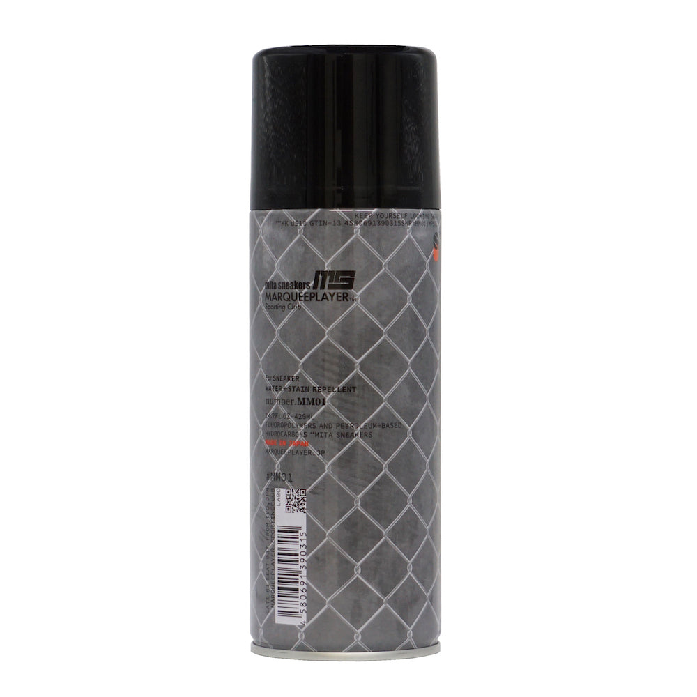 1本は持っておきたい、最強の撥水撥油スプレー。 レザー、ヌバック、キャンバス、スウェードなど様々なマテリアルの天敵でありダメージの元となる雨や水を弾き、シミの原因となるような油汚れからも大切なスニーカーを保護してくれます。これは、「MARQUEE PLAYER」と「mita sneakers」のロゴマーク、そして「mita sneakers」のアイコンである「CHAIN LINK FENCE(金網)」と“TOKYO CUSTOM MADE”を意味する「東京改」のグラフィックを落とし込んだパッケージデザインのコラボレーションモデルです。贈答用にも最適なスニーカーケアプロダクト。