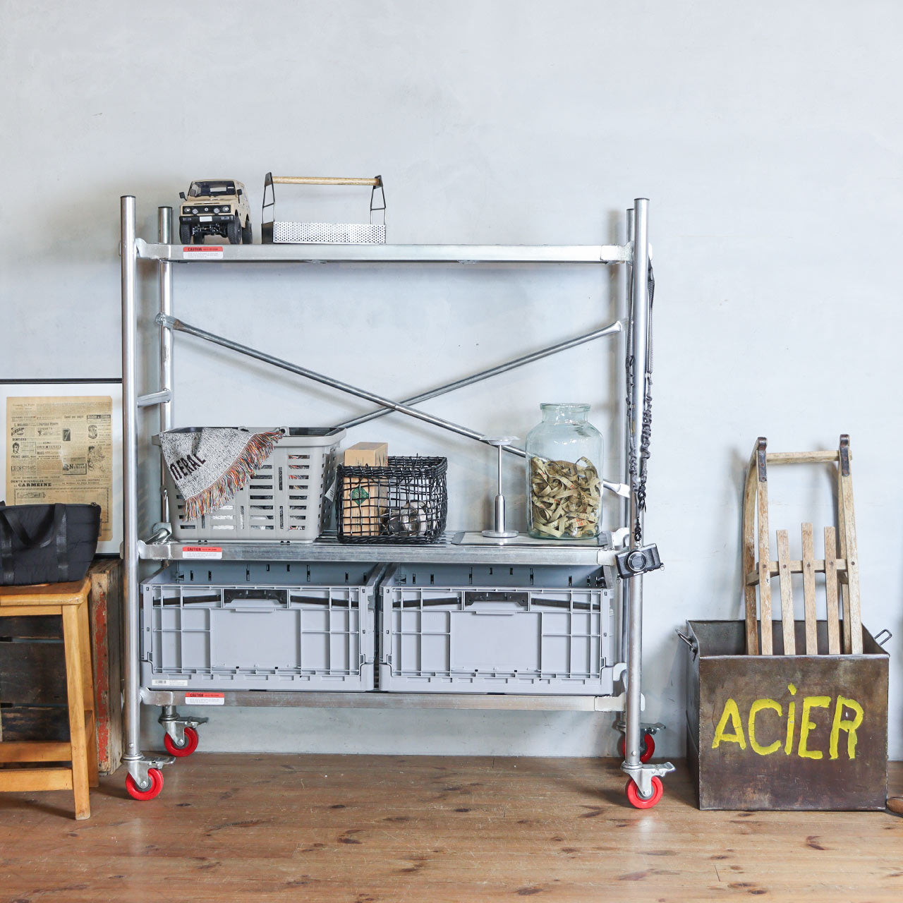 “業務用感”って、なぜだか心くすぐられる。このクレートはまさにその代表格。無骨で、無駄がなくて、マットなグレーがまた絶妙に渋い。お酒や食料品をガサッと放り込んでも、なんだか絵になる。折りたためるという実用性もちゃんとある。こういうのを「カッコつけてるわけじゃないけど、結果カッコいい」って言うんでしょうね。ずるいな、業務用。足場生まれの、ビジュ最強シェルフに2つピタッと収まるので、セットで使ってほしいやつです。