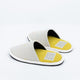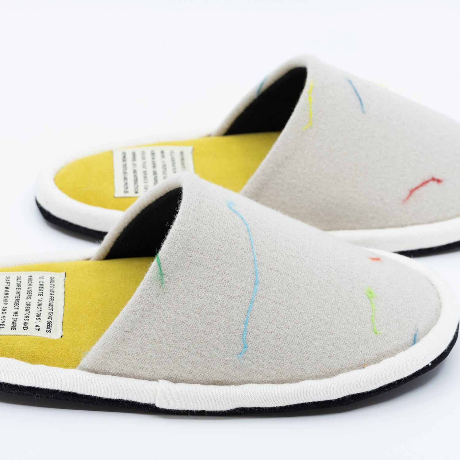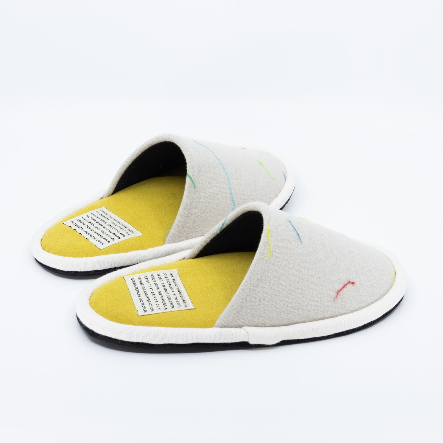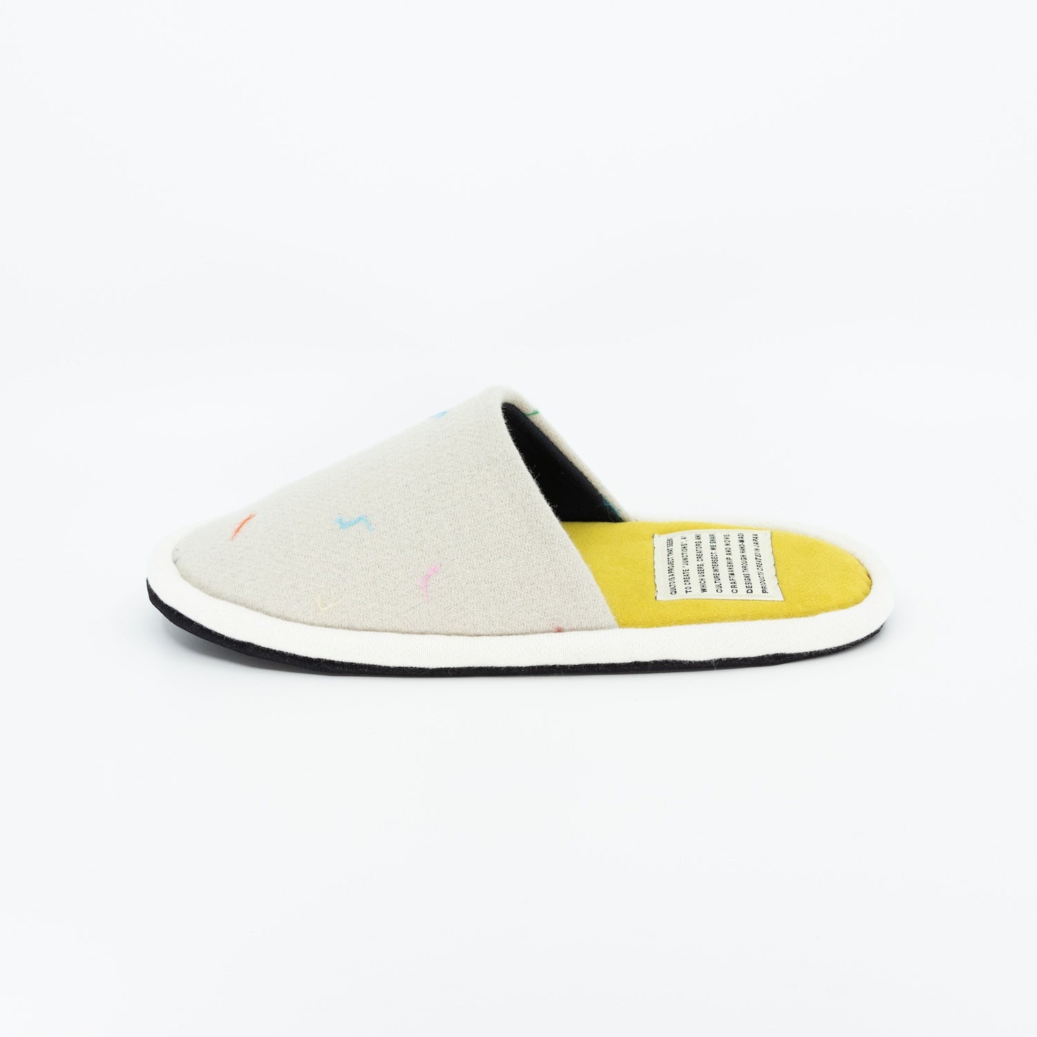 テキスタイルデザイナーYuri Himuroさんのテキスタイル、”LINT”をアッパーに使用した一足。”LINT”はアトリエで商品製作を進める過程で出る糸を収集し、糸屑一つ一つを生地に並べてパンチングして製作しています。アイボリーのシンプルな生地にカラフルな糸が映える、シンプルながらも遊び心溢れるデザインが魅力です。アクセントとなるイエローの中敷部分は程よいクッション性に加えて、スエード調で肌触りも滑らか。裏面には滑りにくい素材を使用し、全て日本の工場で職人が手仕事で仕上げています。