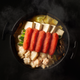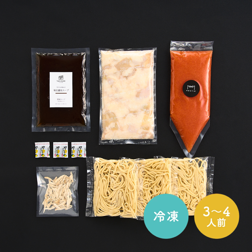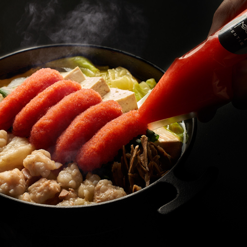 国内流通している99%が大量生産の中、原料から製造工程すべて手作業にこだわる国内でも数少ない1%の"明太子"ブランド「MENTIE」と、国産牛小腸100%の上質な"もつ"を自宅でも失敗せず美味しく調理できるよう、独自の下処理を施し、上品な秘伝出汁の醤油"スープ"と風味豊かな九州産の"ごぼう”と”柚子こしょう”、〆はコシのある長崎県の特製”ちゃんぽん麺”が楽しめる、「TAKUNABE」の”もつ鍋”とのコラボ鍋。