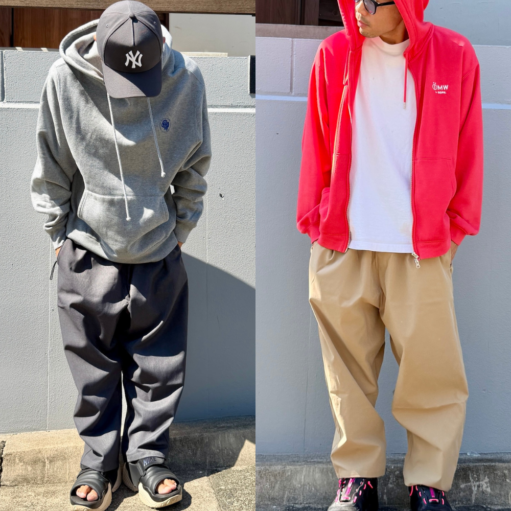 この夏めちゃめちゃ売れたリネンパンツ。だらしなく見えず、程よい力の抜け感が完璧で、このシルエットがとにかく好きで毎日履いてました。その最高シルエットはそのままに、秋冬素材が出たので迷わずゲットしました。履き心地も“やみつき感”もそのままです。タイプAは、汚れやシワに強いポリエステル。タイプBは、とろみがあってシワ感の少ないきれいめなポリエステル×レーヨン。どっちも良すぎて選べず…結局、迷うくらいなら両方いっとけ精神で2本買いました。2本気兼ねなくイケちゃう価格も魅力ですね。ちなみに、着用画像は僕で、タイプA / ベージュ、タイプB / チャコールグレイを履いていて、171cm・59kgです。
