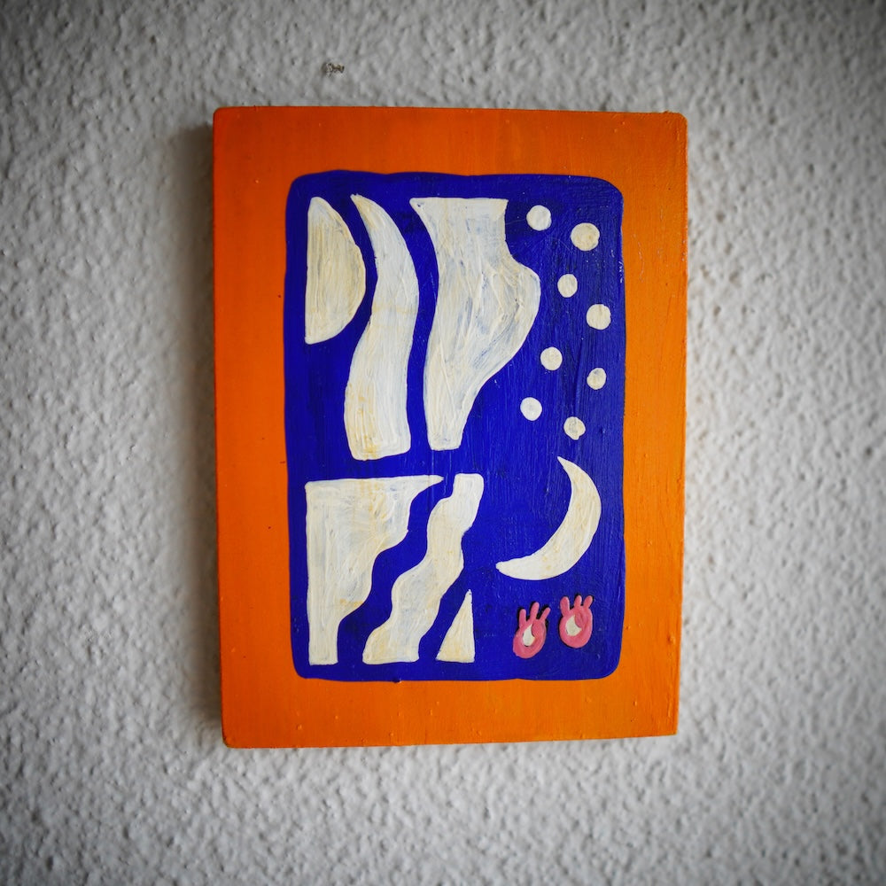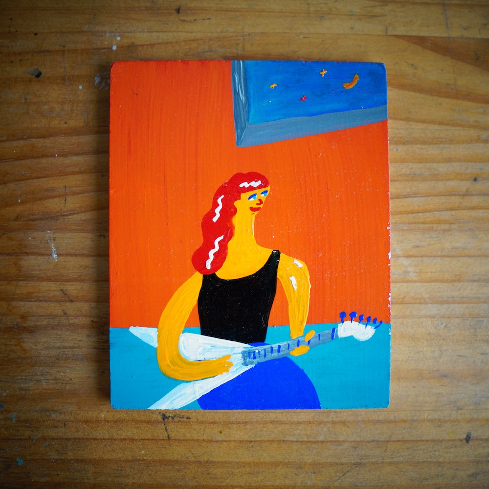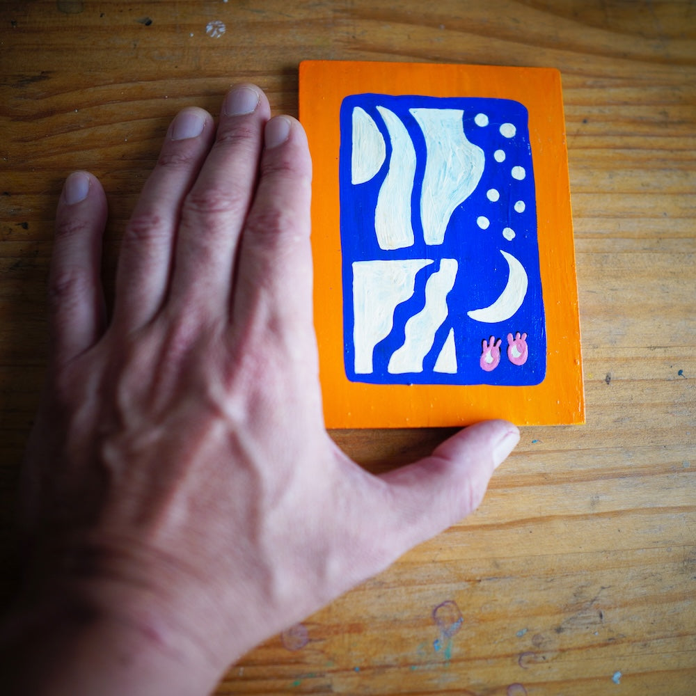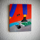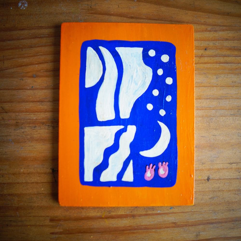 小さい絵です。ハガキより少し小さいです。絵ですので一点ものです。MDFという板にアクリル絵の具で描いてます。描いた後に艶出し保護用ワニスを塗布しています。おうちの柱にねりけしなどで貼り付けたりしたら かわいいと思います。なかなか大きいサイズだと家に飾る場所が、、と言われる方がいらっしゃるので小さいサイズならと思い、描きました。
