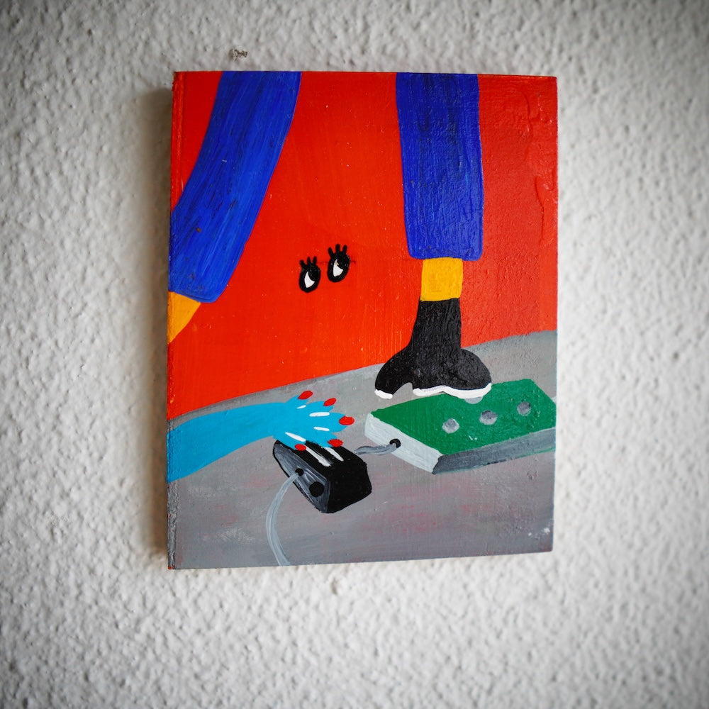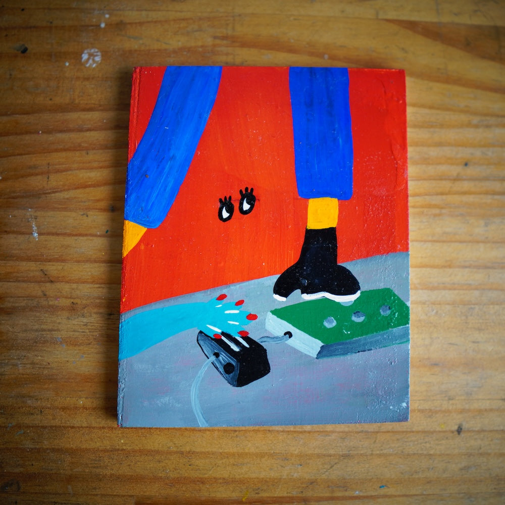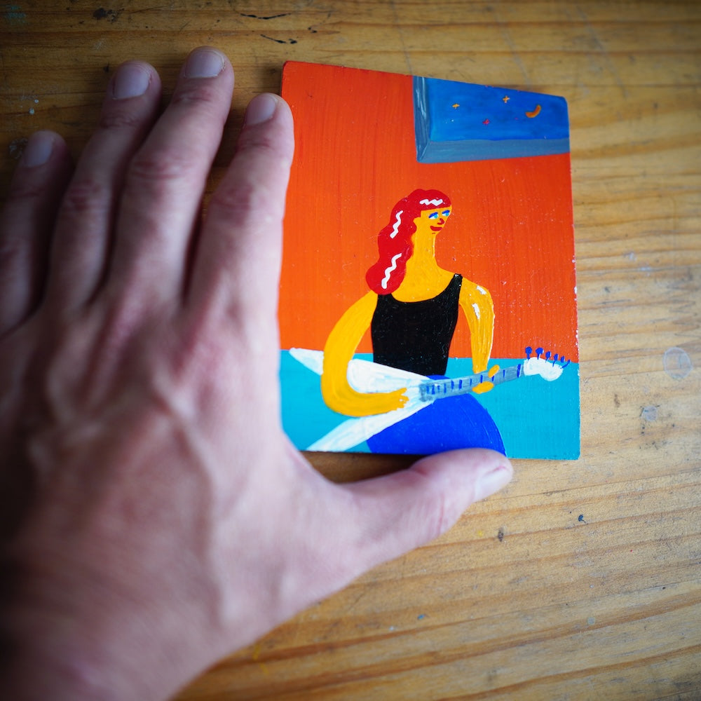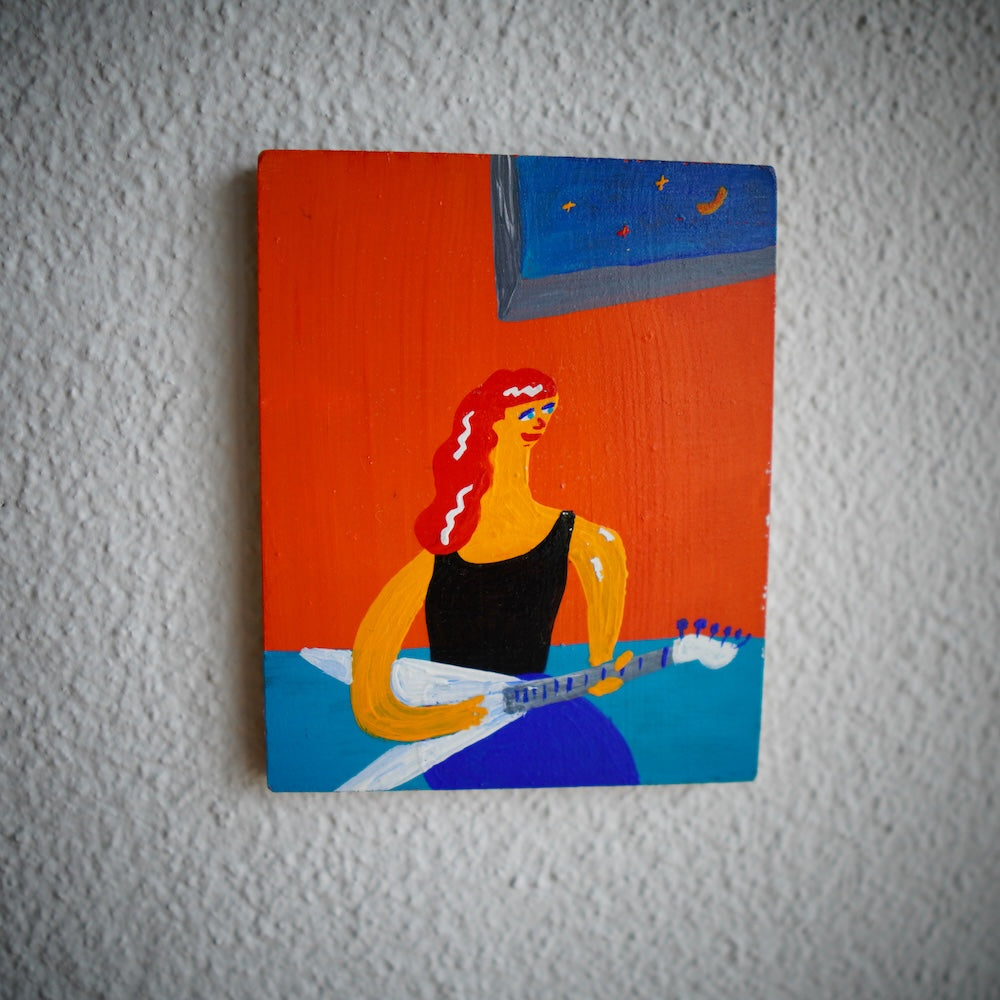 小さい絵です。ハガキより少し小さいです。絵ですので一点ものです。MDFという板にアクリル絵の具で描いてます。描いた後に艶出し保護用ワニスを塗布しています。おうちの柱にねりけしなどで貼り付けたりしたら かわいいと思います。なかなか大きいサイズだと家に飾る場所が、、と言われる方がいらっしゃるので小さいサイズならと思い、描きました。