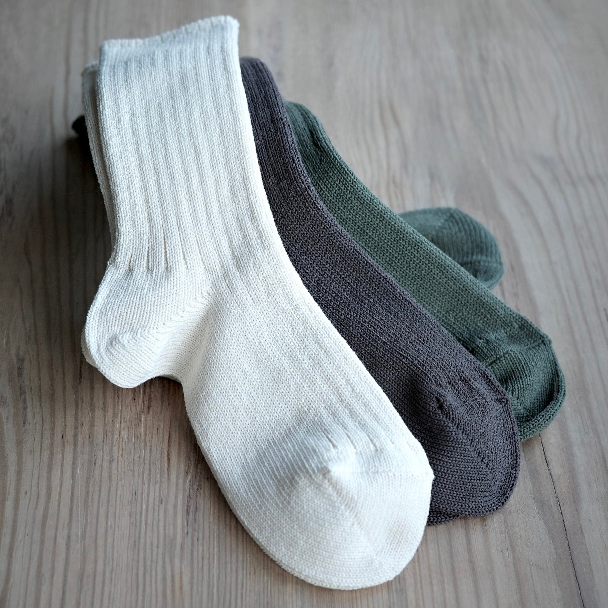 足をそっと包み込むような、やわらかそしてさっぱり安心感のある履き心地。ローゲージならではのふっくらとしたボリューム感も魅力。サンダルやスニーカーにおすすめ。毎日の一歩が心地よくはじまる。そんな日常に寄り添う一足です。