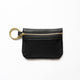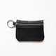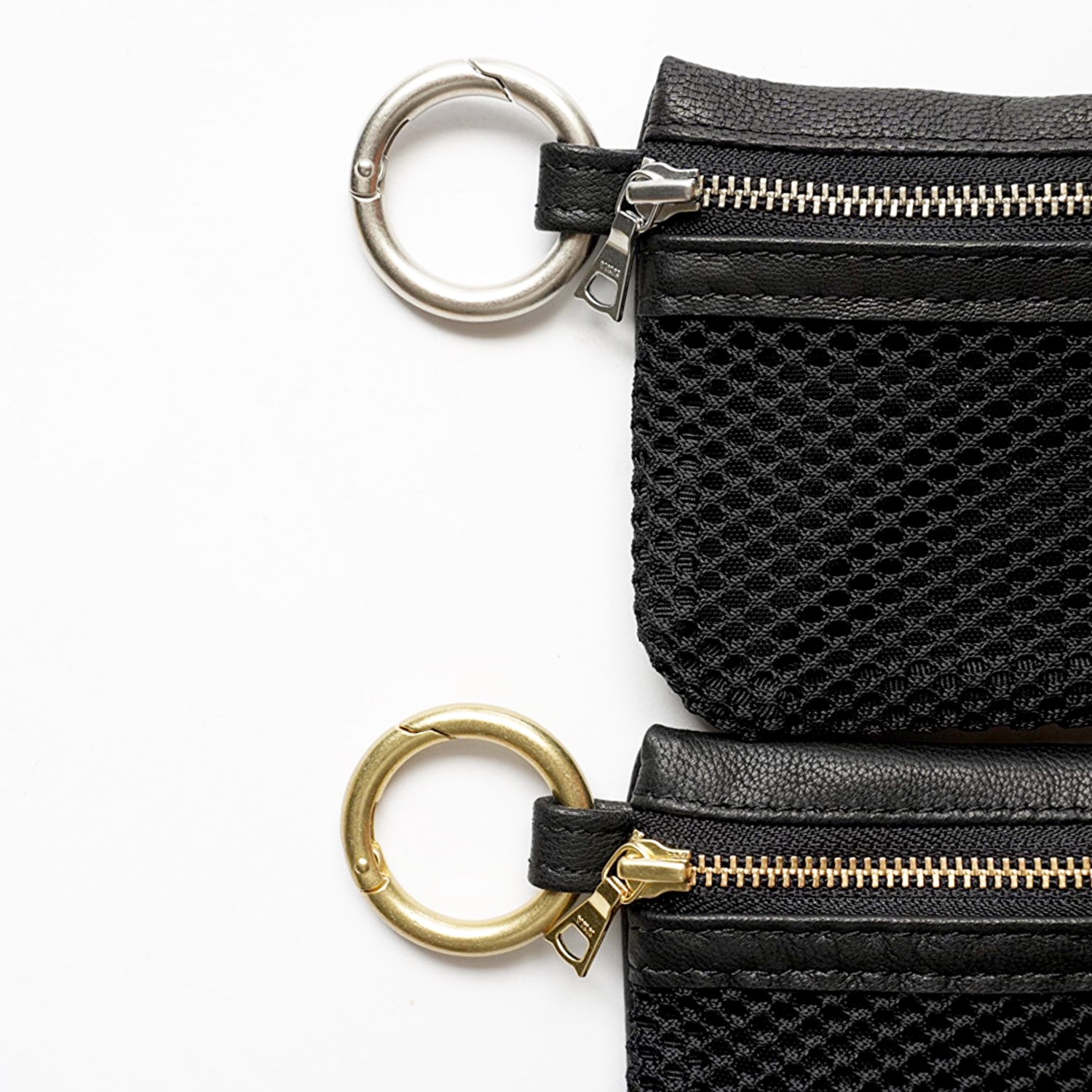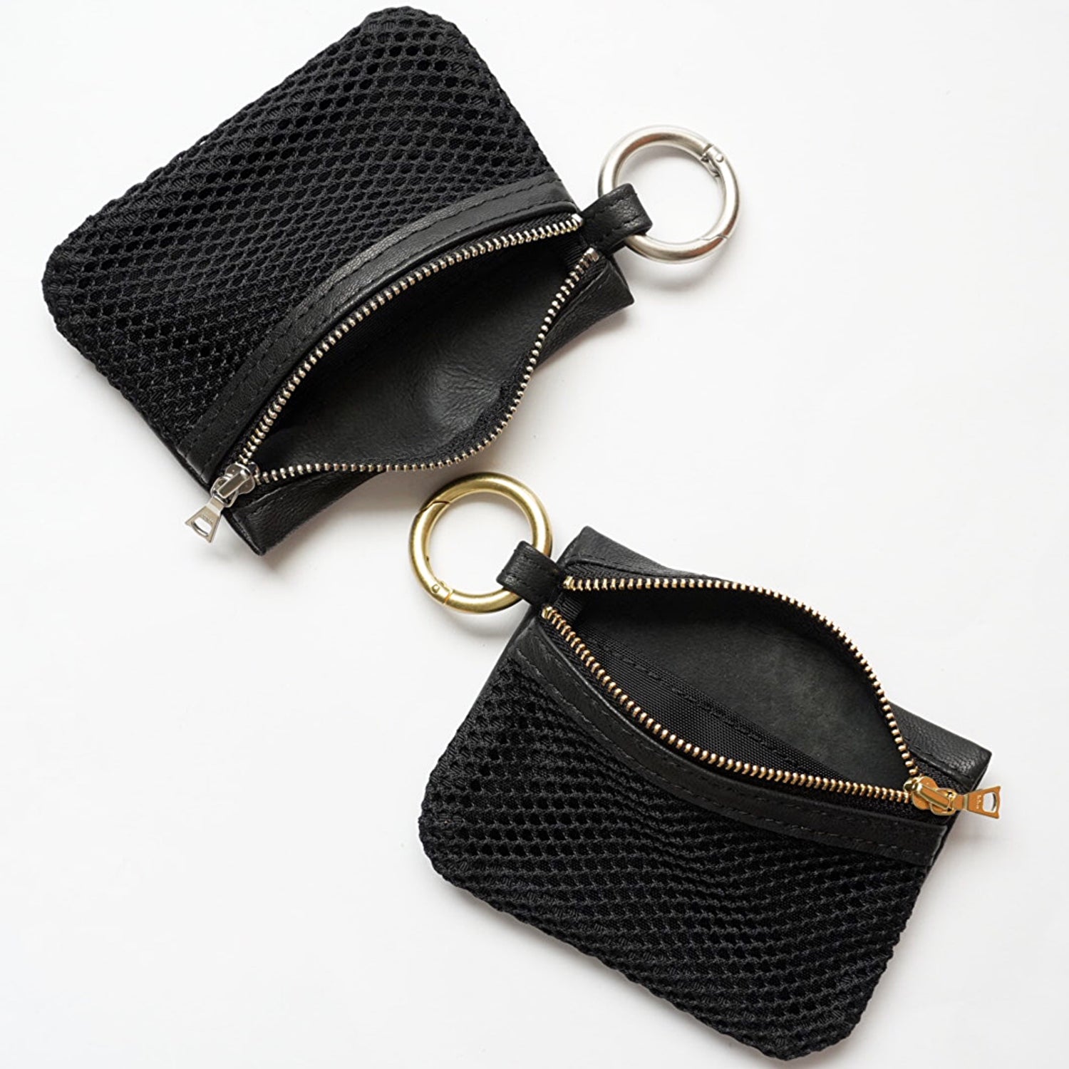 薄くしなやかなゴートレザーにメッシュを組み合わせたスマートなコインケース。日本製。表面に配置したファスナーが広げやすく取り出しやすい仕様です。中にナイロンの仕切りがあり二つ折りにしたお札とカード類、小銭を分けて収納できます。鍵を付けたりベルトループやカバンに引っ掛けたり様々な用途で使える円形のカラビナが備わります。ゴートレザーは、使うほどに色が濃く艶が増していきます。金具のカラー、シルバーとゴールドからお選びいただけます。