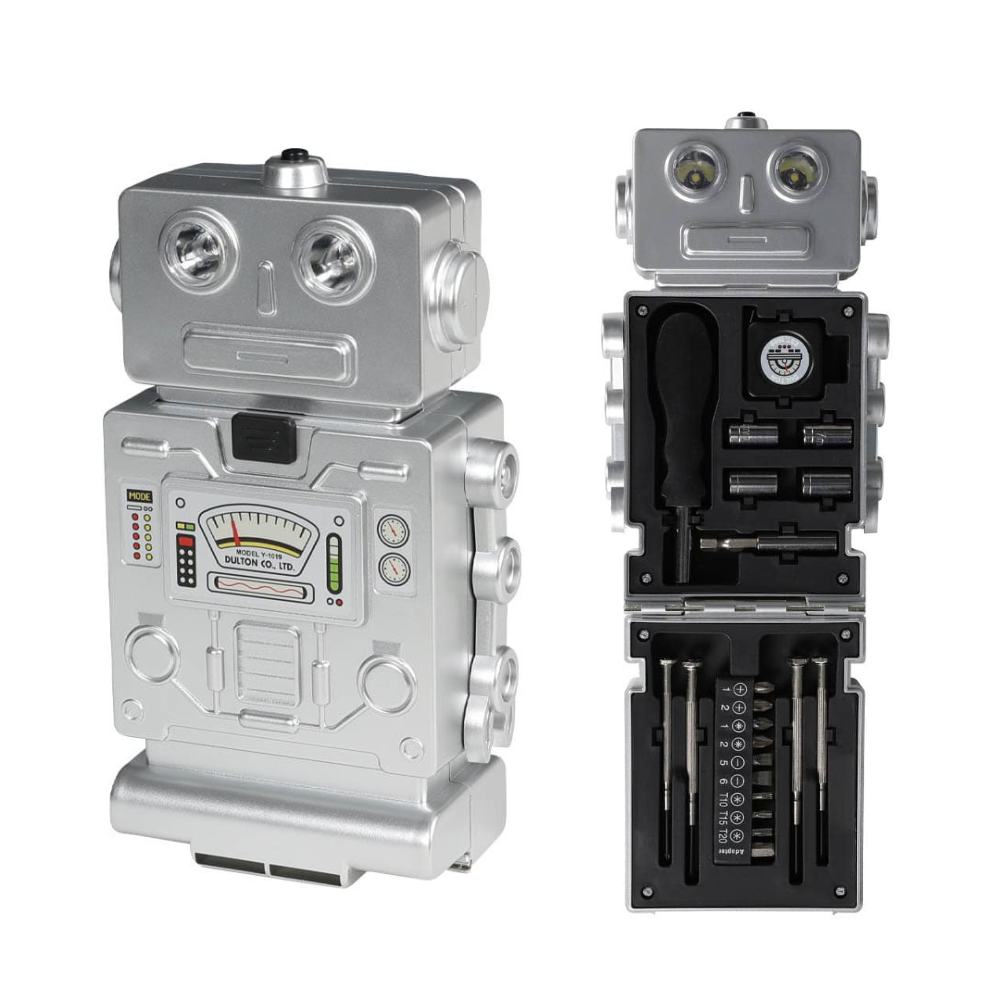 遊び心溢れるロボットデザインの工具セット。ドライバー、ソケット、ビット、メジャーテープなど、本格的な工具が揃っています。ロボットの目はライトになっているので、暗い所での作業でも大活躍。普段は棚に閉まってしまう工具も、これならインテリアとして飾っておきたくなるはず。可愛らしいパッケージなので、D.I.Y好きなあの人へのギフトにも◎。