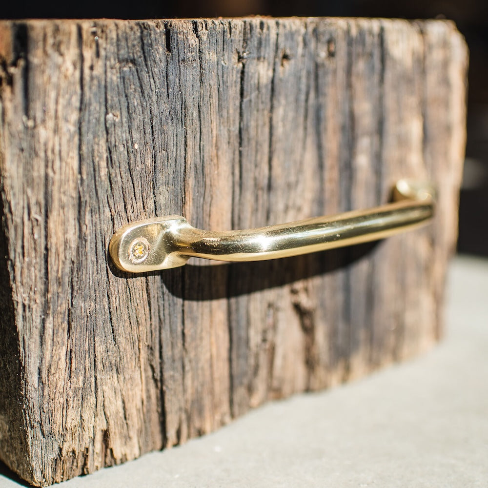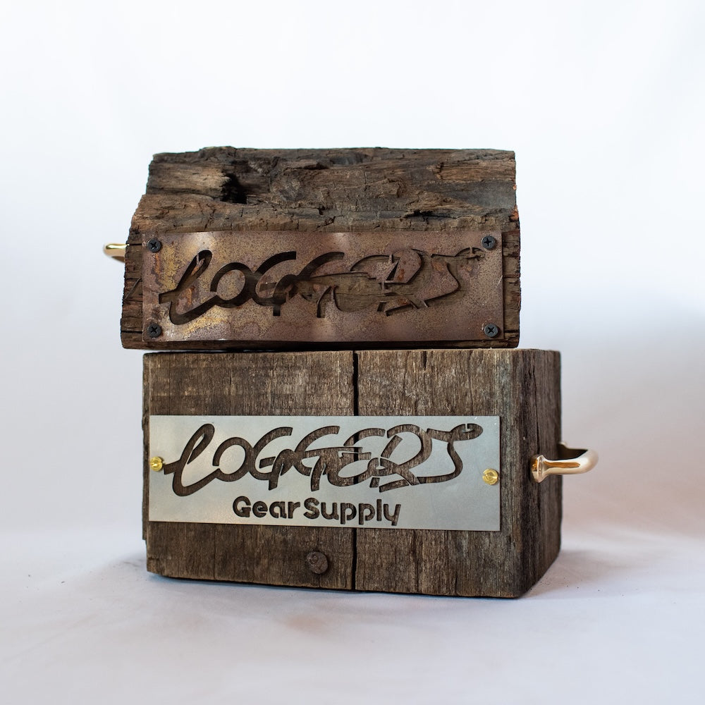 アイアンロゴプレートとハンドル付の薪割り台です。ハンドルは真鍮・パラコードの二種類ございます。
